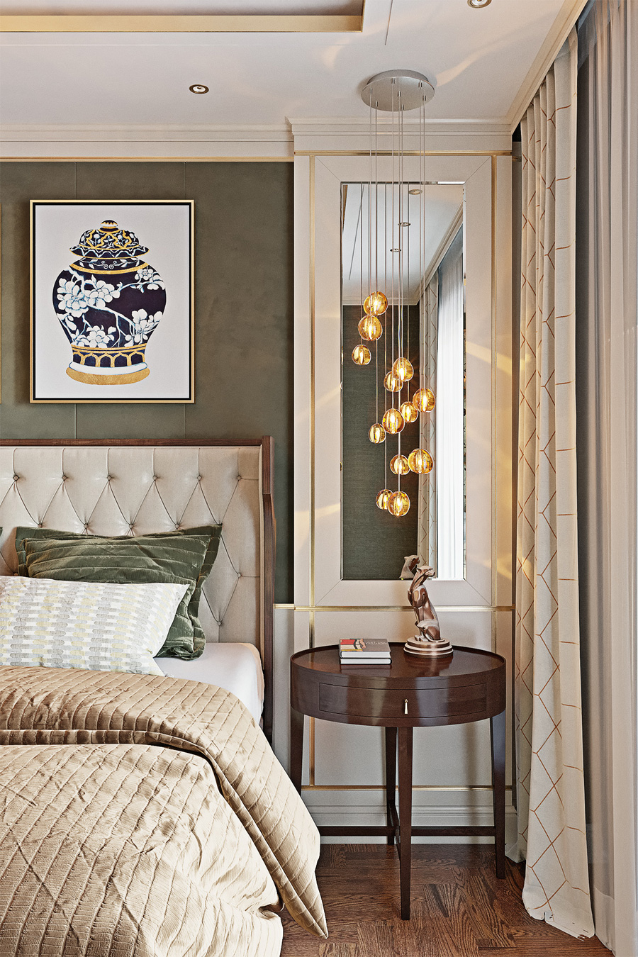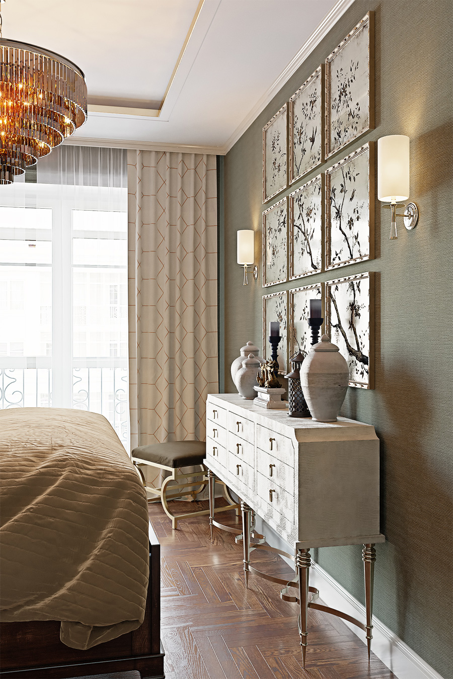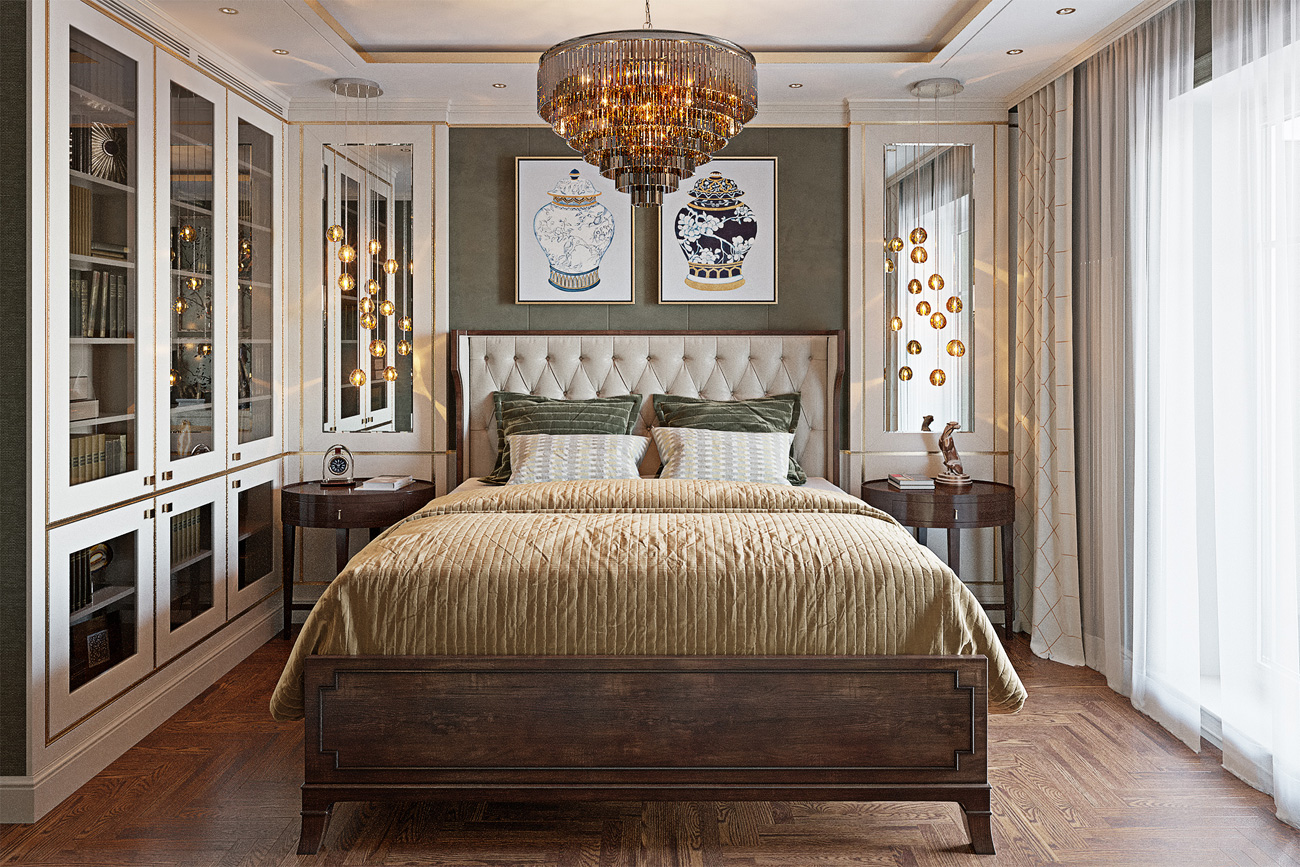 Спальня буквально завораживает сочетанием материалов и отделок, количеством деталей и игрой нюансов.