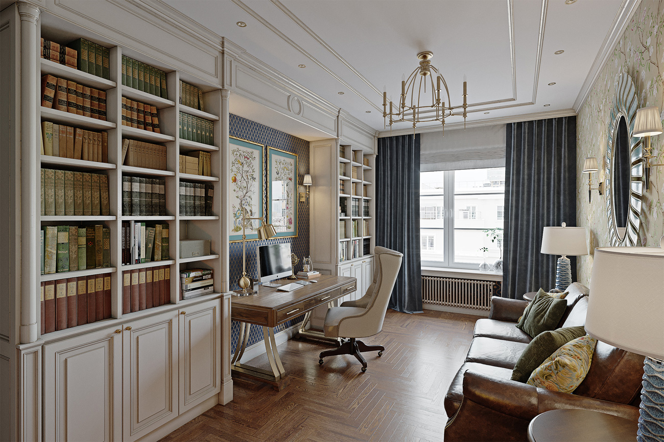 Согласно пожеланиям заказчиков в квартире предусмотрен кабинет. Смелое цветовое решение не только качественно выделяет его, но и подчеркивает изысканный вкус хозяев.