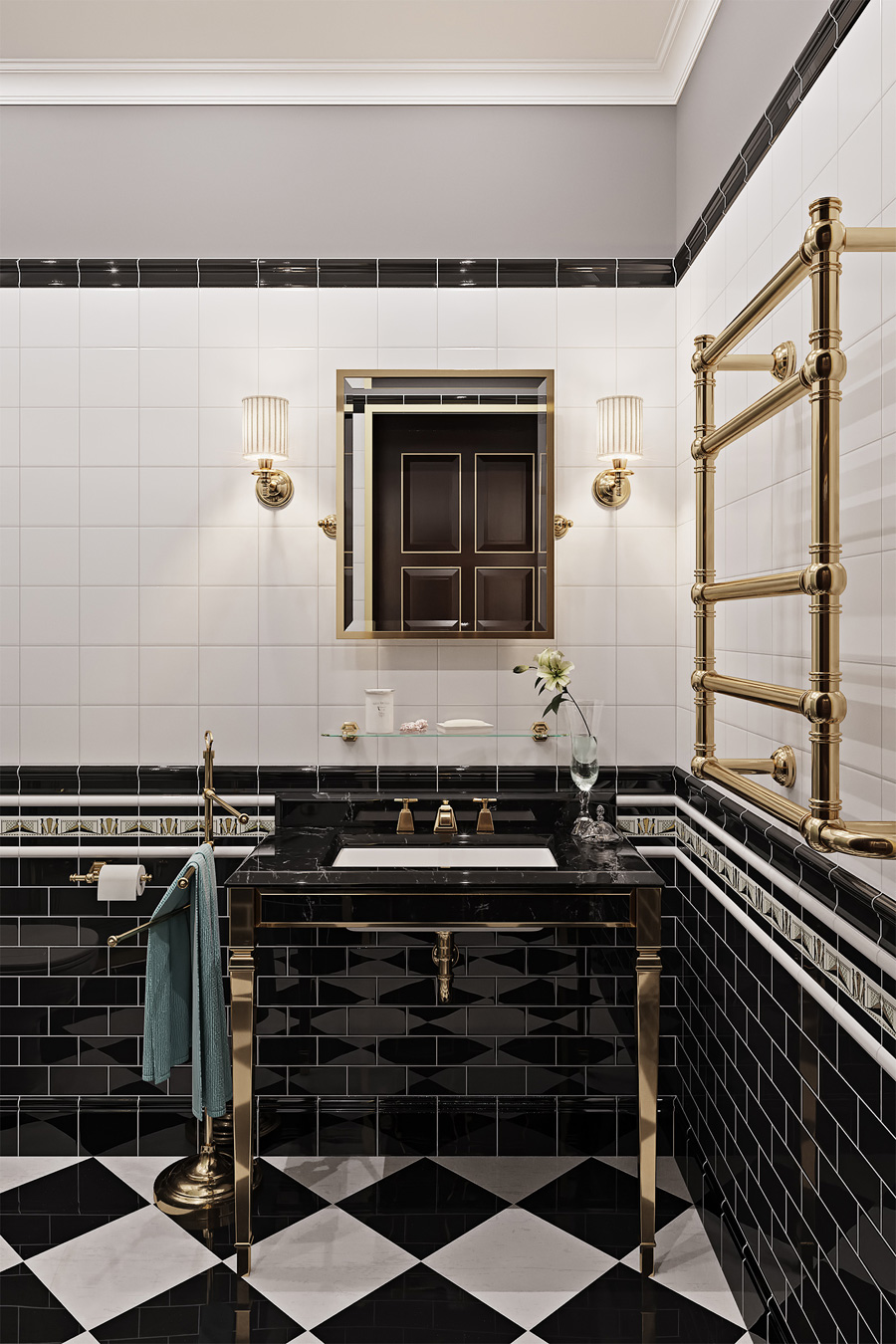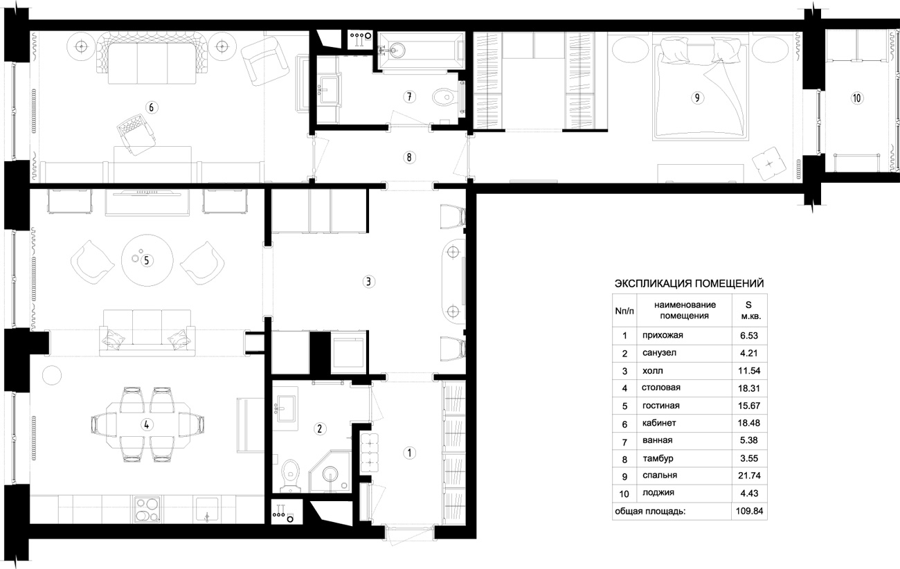 Просторная и функциональная прихожая предваряет холл, залитый солнечным светом, отраженным в настенных зеркальных панелях. Гостиная-столовая эклектична и оригинальна в своем исполнении. Классическая составляющая представлена симметричной расстановкой мебельной группы. Большой столярный портал не только структурирует пространство, но и скрывает трассу канального кондиционирования, предусмотренного в квартире.