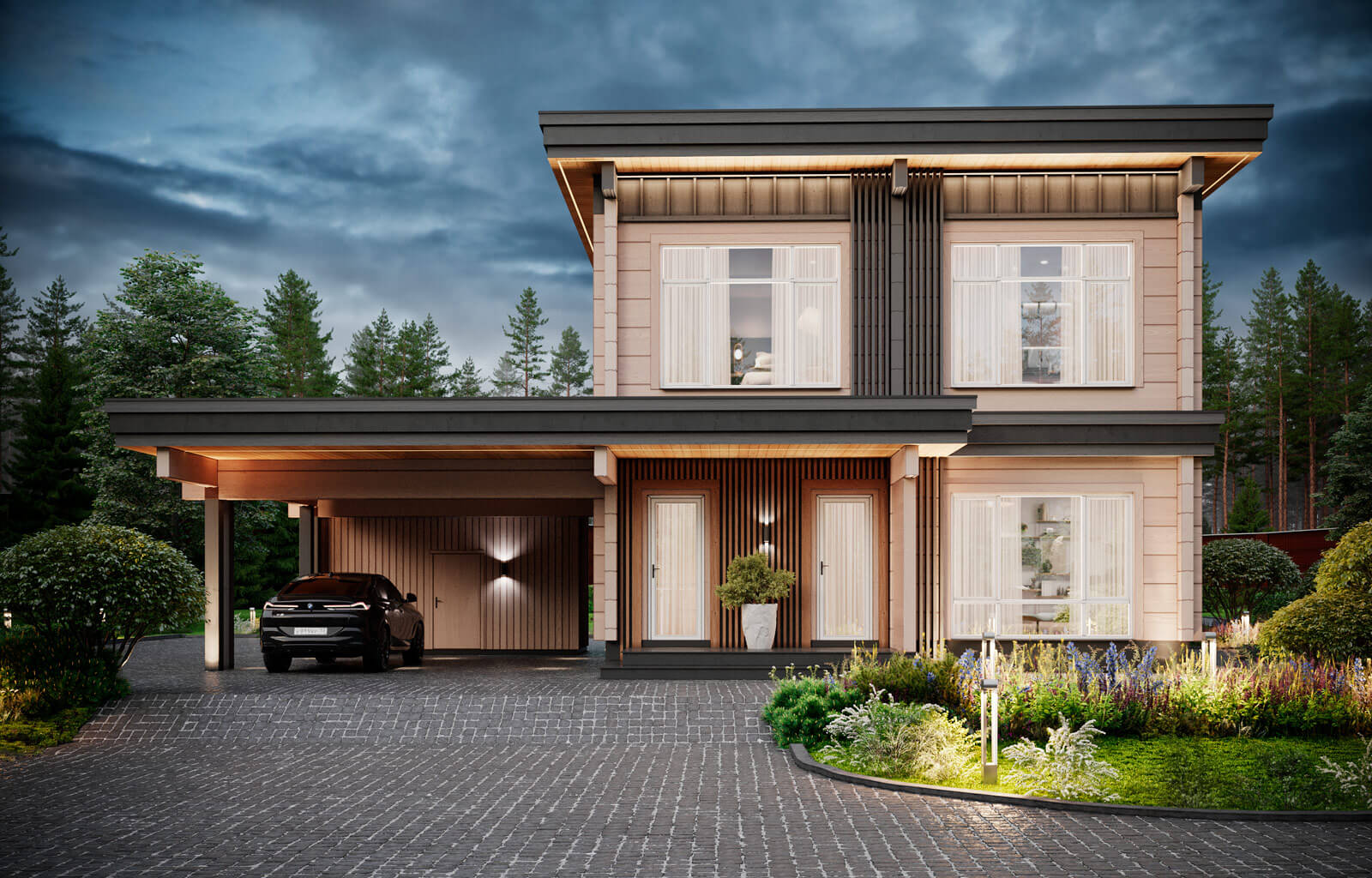 Фахверк, в свою очередь, привносит в проект дух истории и традиций, создавая эффектный контраст с современными линиями и формами. Включение фахверка позволяет подчеркнуть высокий технологический уровень конструкции, а также создает иллюзию легкости. Шесть панорамных окон, словно открывают двери в мир природы, впуская свет и свежий воздух. Каждое из них открывает вид на красоту каждого сезона. Здесь природа и уют сливаются в единое целое, наполняя пространство вдохновением и радостью.