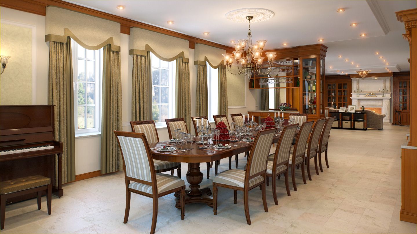На первом этаже представлена общественная зона: приемная, гостиная, столовая и кухня. Приверженность заказчика к классическому стилю и стала основой концепции при создании интерьеров, выдержанных в строгих формах, без «кричащих» цветов, в гармоничных сочетаниях оттенков натурального дерева и текстиля, с изысканной отделкой и аксессуарами.