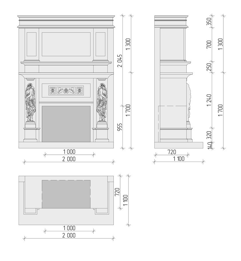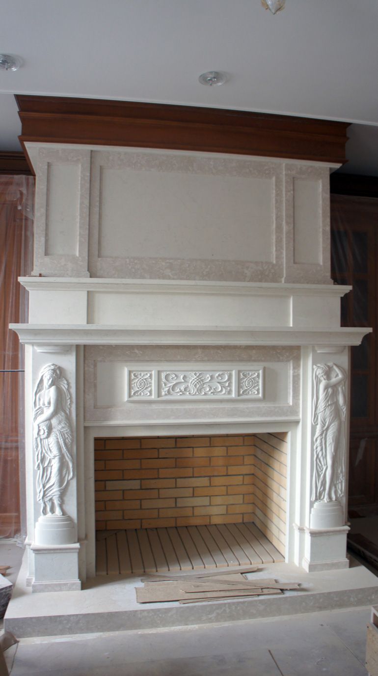 Достойным украшением гостиной стал классический мраморный портал с античными рельефами. Теплые оттенки деревянного портала и охристого травертина двух других каминов подчеркивают выбранный цветовой спектр оформления комнат.