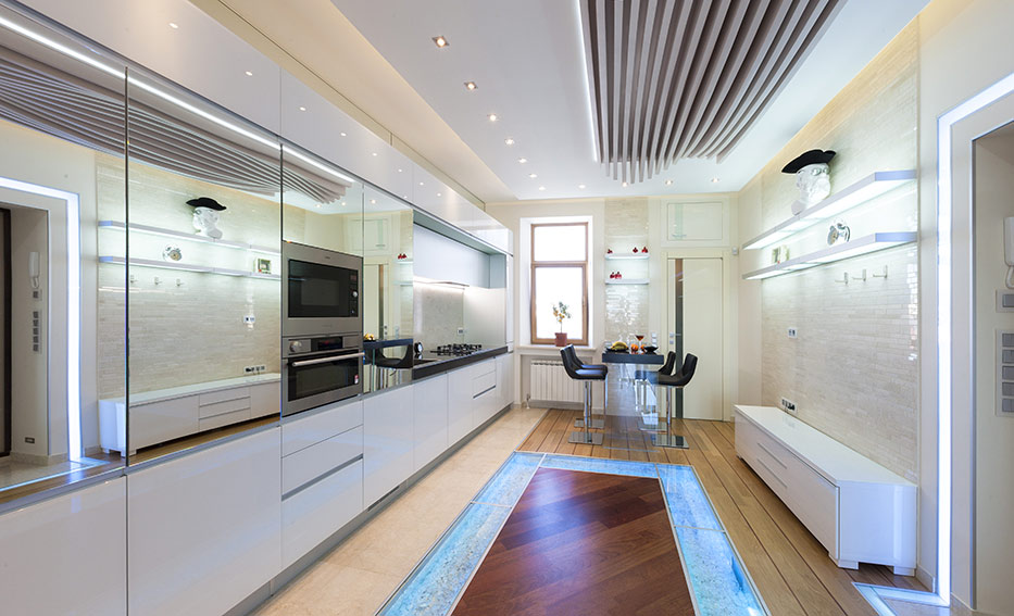 Эксклюзивная кухня, разработанная по чертежам архитектора, изготовлена специалистами компании VERONA mobili. Она совмещает в себе функции собственно кухни и гардеробного шкафа. Рабочая зона с «фартуком» из светлого мрамора и столешницей из черного искусственного камня производит впечатление скульптурной ниши в стене, выделяющейся из единой плоскости шкафов с фасадами из белого матового стекла и зеркал. Стена сверху декорирована зеркальными вставками до потолка, что позволяет получить дополнительный свет в вечернее время и зрительно еще расширить пространство.