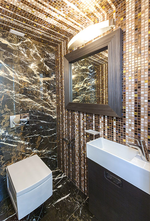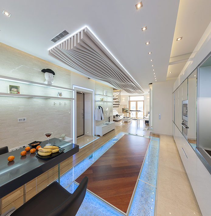 Интерьер двухуровневой квартиры приобрел футуристическое звучание благодаря оригинальной трактовке минимализма. Он построен на сочетаниях лаконичных форм и динамичных, экспрессивных линий. Комбинации различных отделочных материалов и текстур — камня, дерева, стекла, зеркал — создают выразительные контрасты между массивностью и легкостью, брутальностью и изяществом. Особенное внимание в проекте уделено системе освещения: меняющиеся световые сценарии задают в квартире разное настроение.