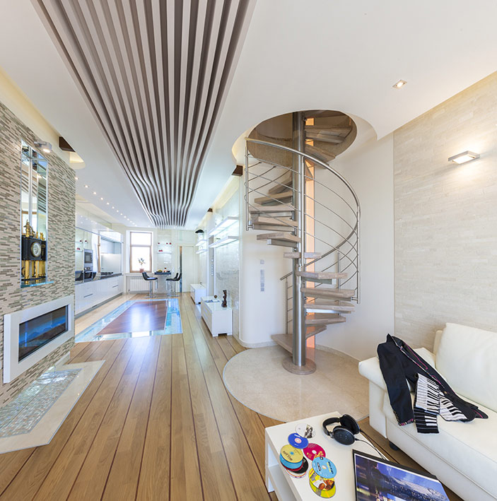 Изящная винтовая лестница гармонично сочетается с волнообразной пластикой потолка. Ее каркас и ограждения выполнены из матового алюминия, ступени — из выбеленного дуба.