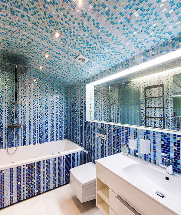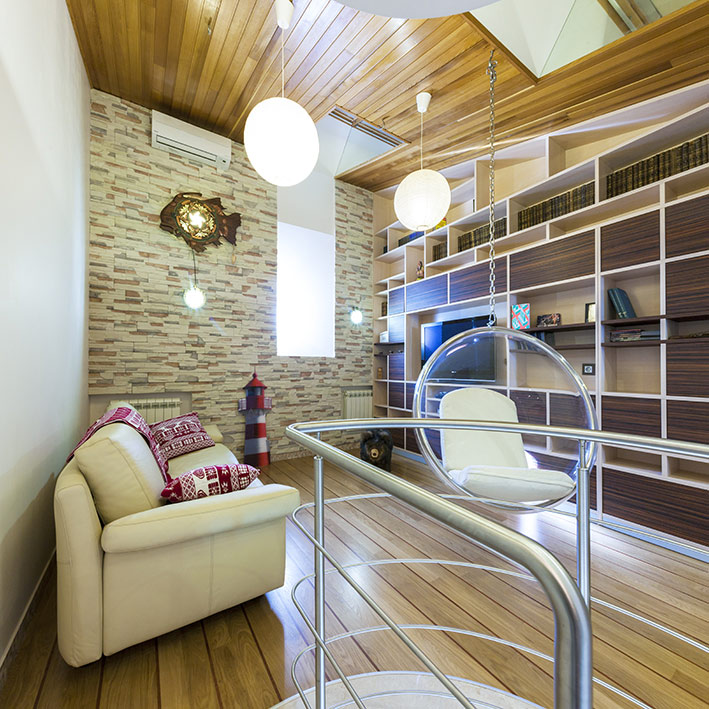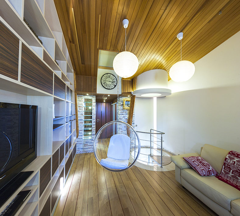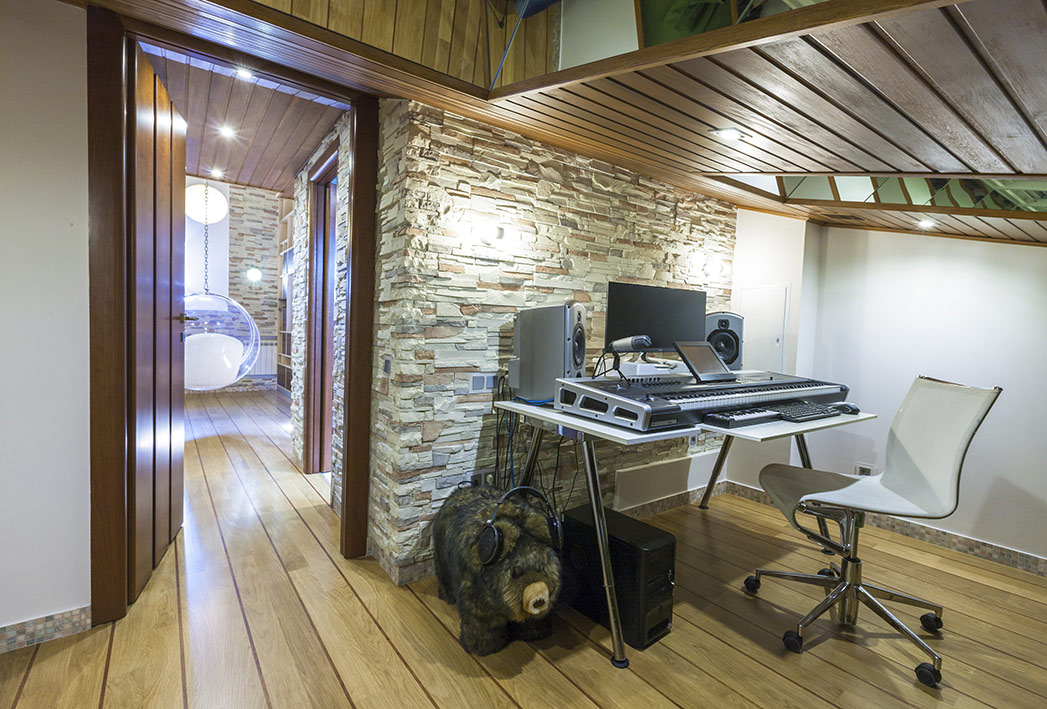 Необычный декоративный потолочный элемент из клееной влагостойкой фанеры, обрамленный светодиодной лентой и имитирующий волны, подчеркивает оригинальный характер студии, объединяет интерьер, задавая его ритм.