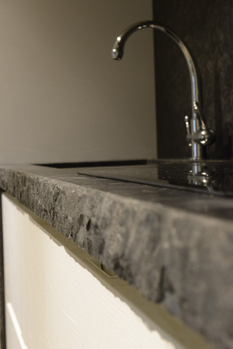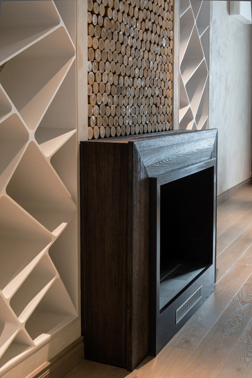 Самое необычное в данном проекте — это стеллаж из кориана (искусственный камень), искусно выполненный по чертежам, и необычной фактуры натуральный камень Matrix под кожу в отделке фартука кухни и столешницы с рваным краем.