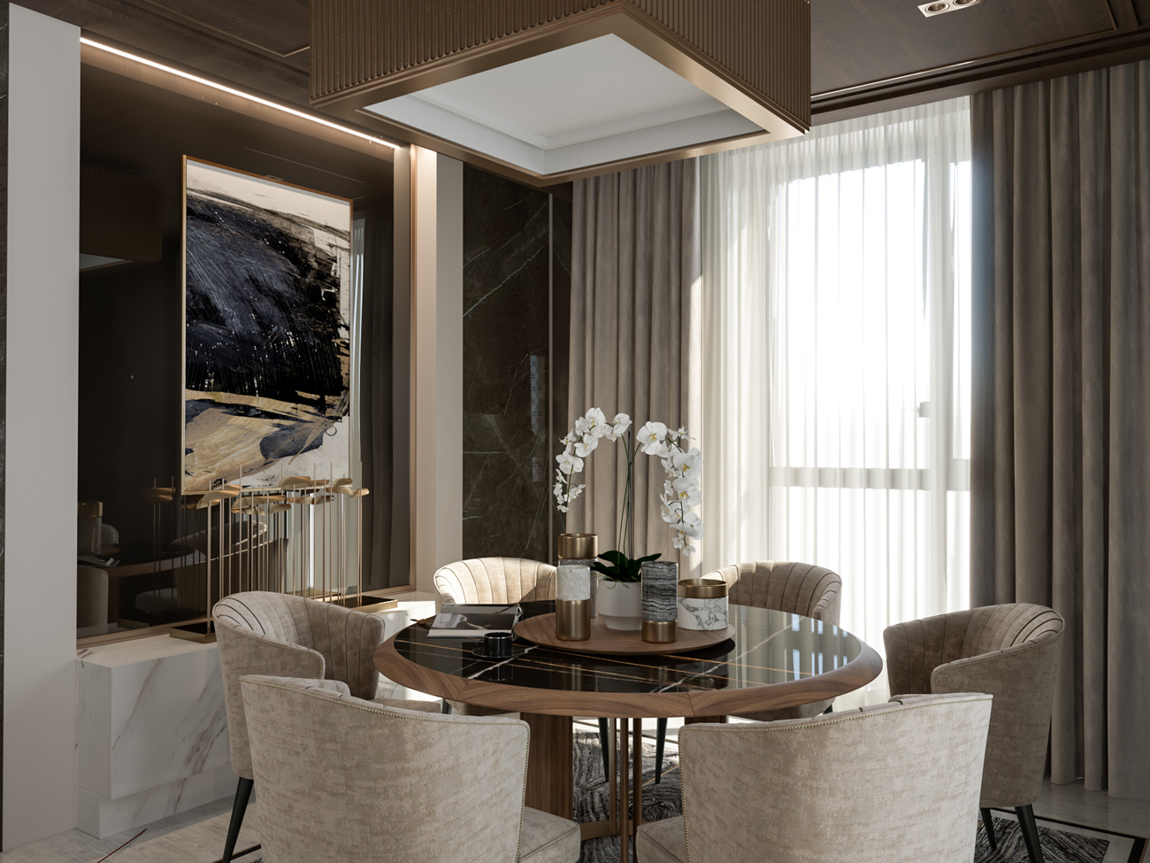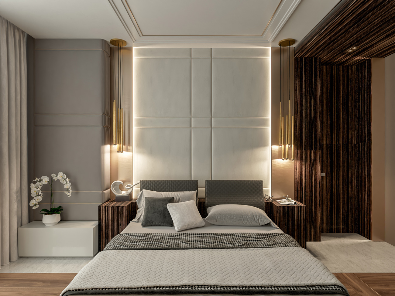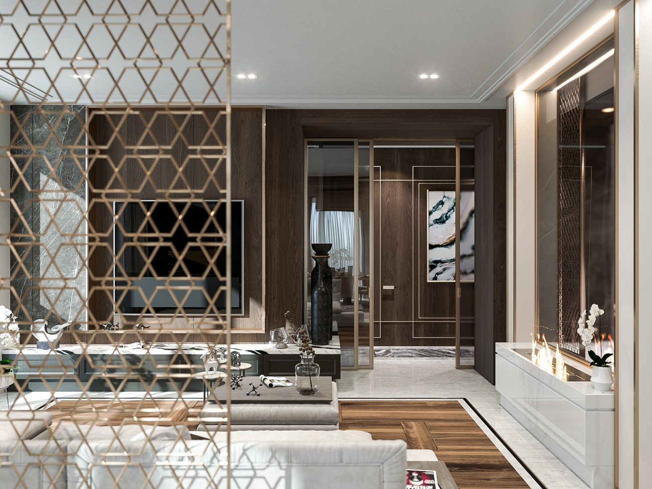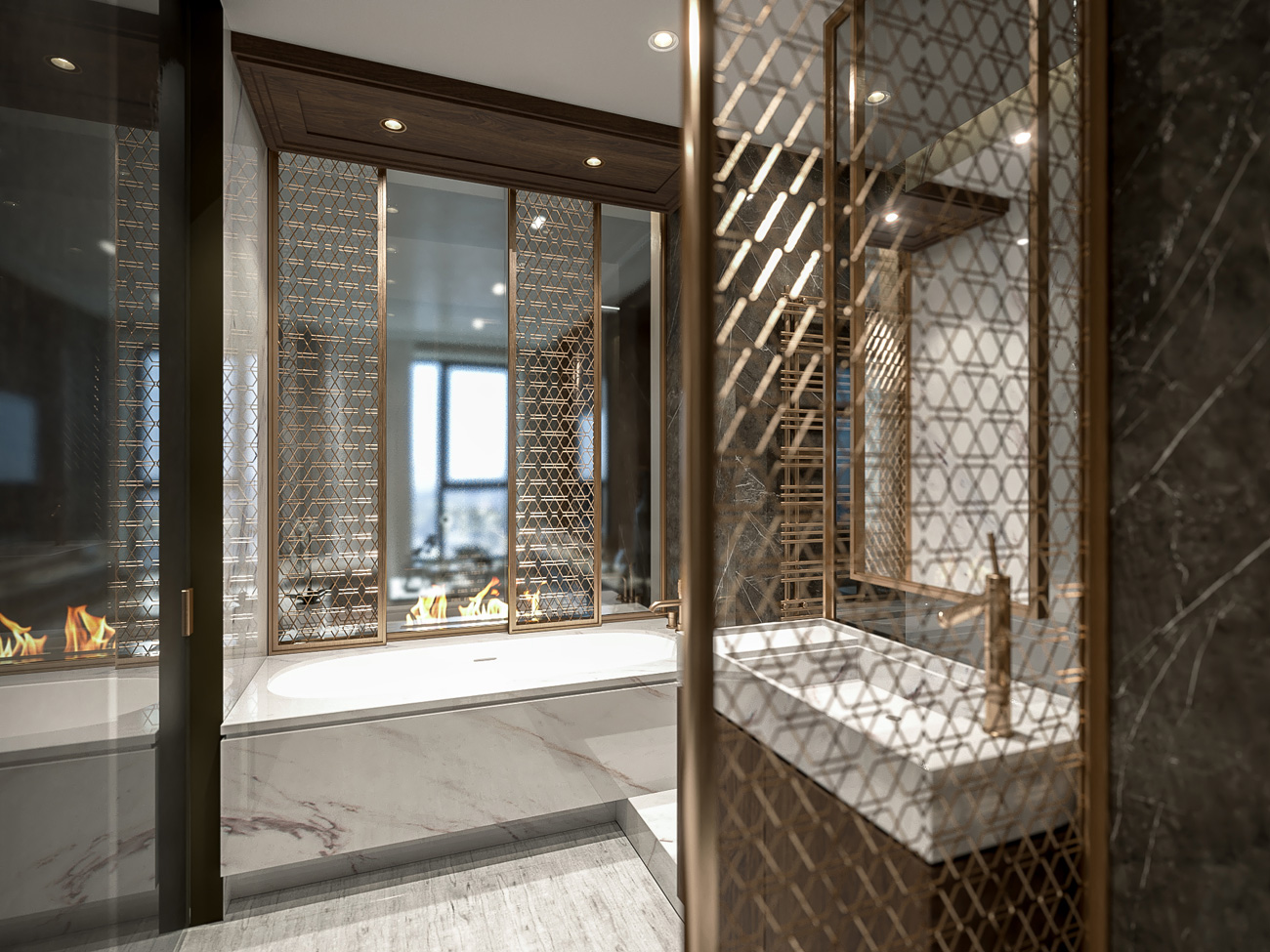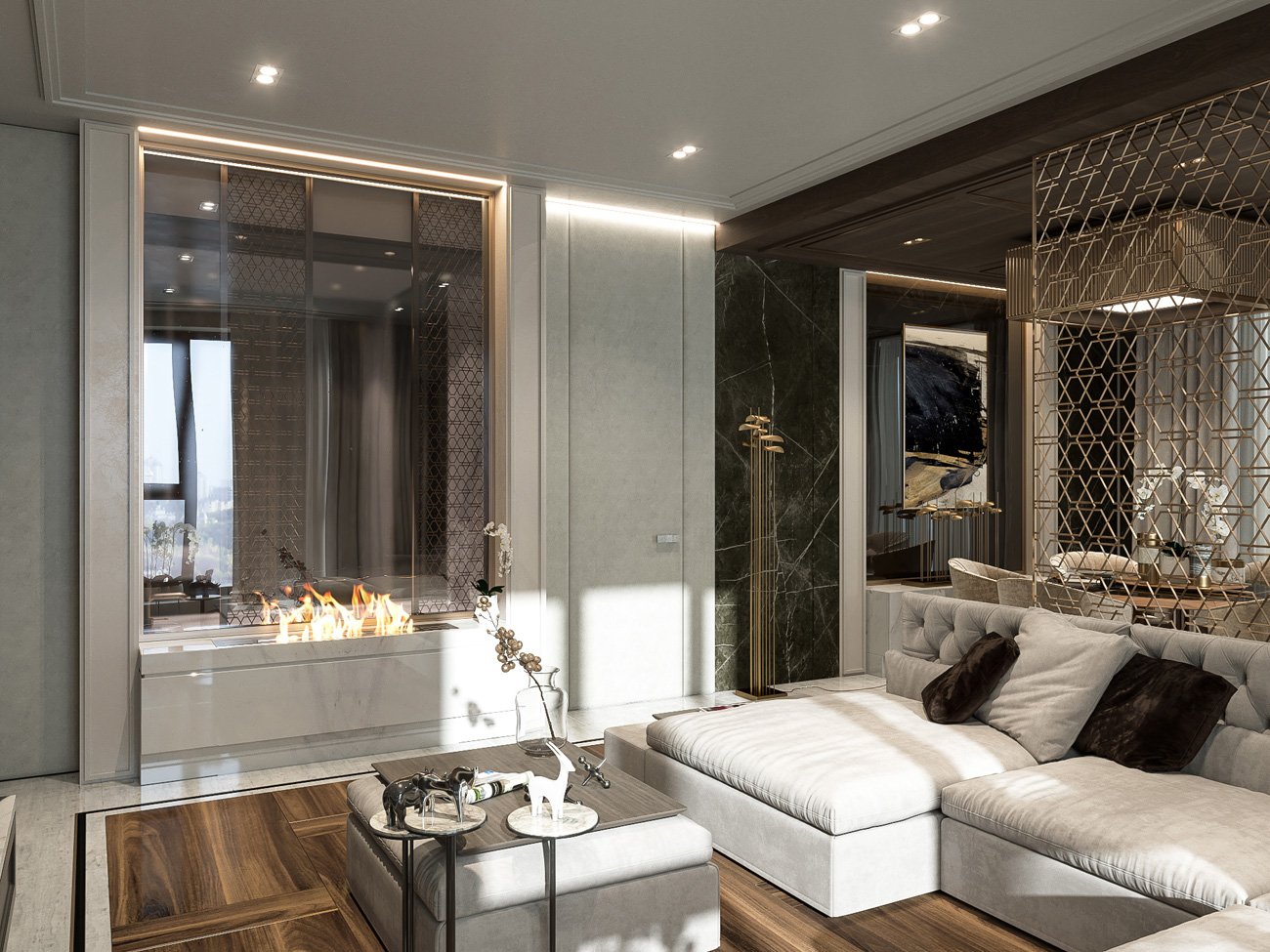 В отделке широко использован натуральный камень, крупноформатный керамогранит, паркетная доска, панели из дерева и вставки латунных профилей.