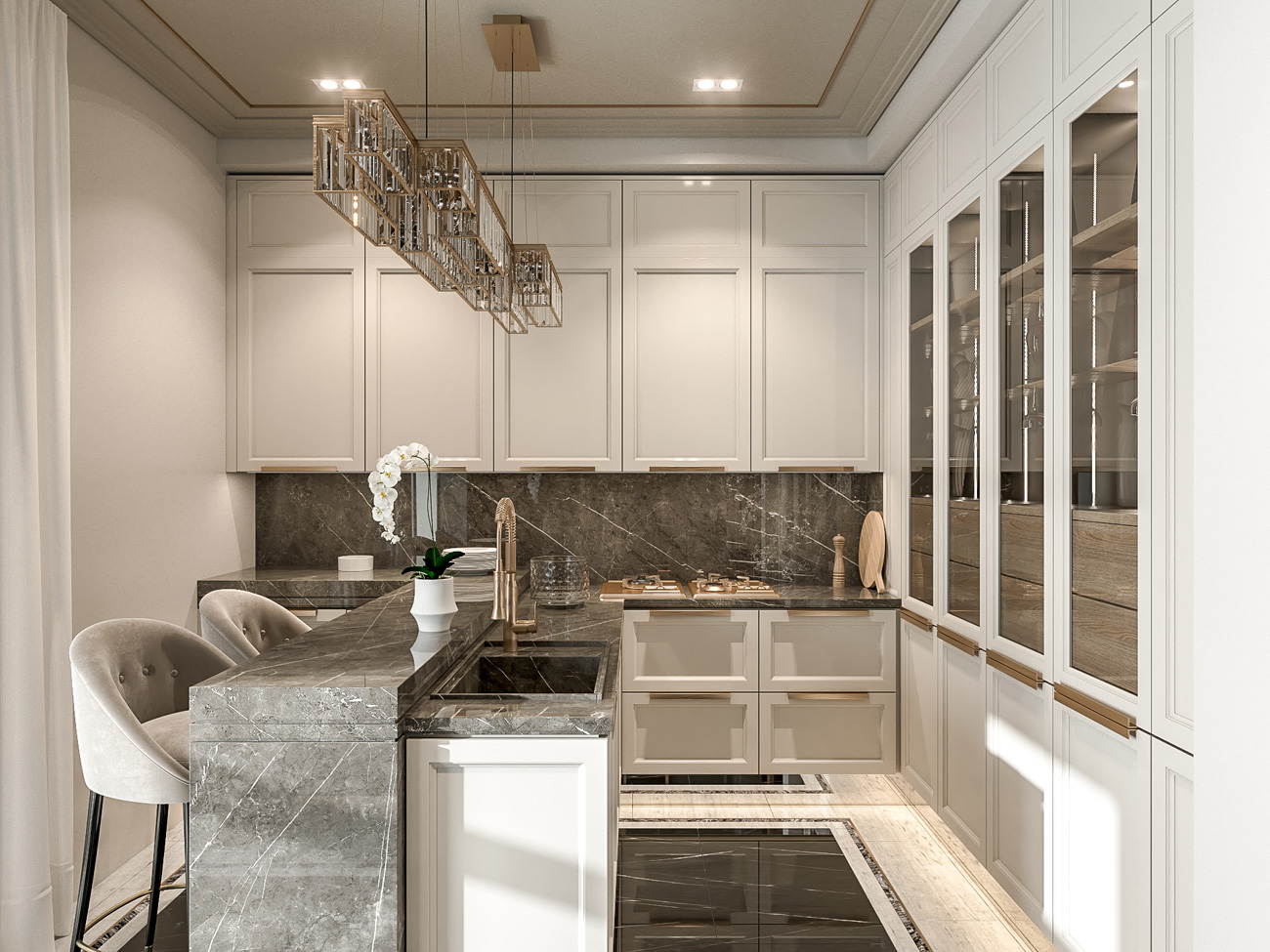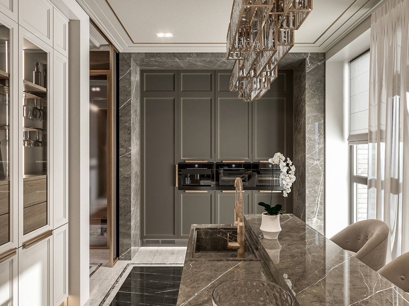 Кухня по заданию была спроектирована в отдельном помещении. Главным пожеланием для кухонной зоны было наличие острова, но небольшая площадь кухни не позволяла сделать остров в классическом понимании. Поэтому высокие колонки с холодильником и другой техникой были вынесены в отдельную нишу, облицованную камнем, напротив, разместили кухонный «полуостров» с высокими, но неглубокими стеллажами для хранения посуды и бокалов. Вся композиция объединена двухуровневой столешницей из натурального камня со сложной геометрией торцевых стенок.