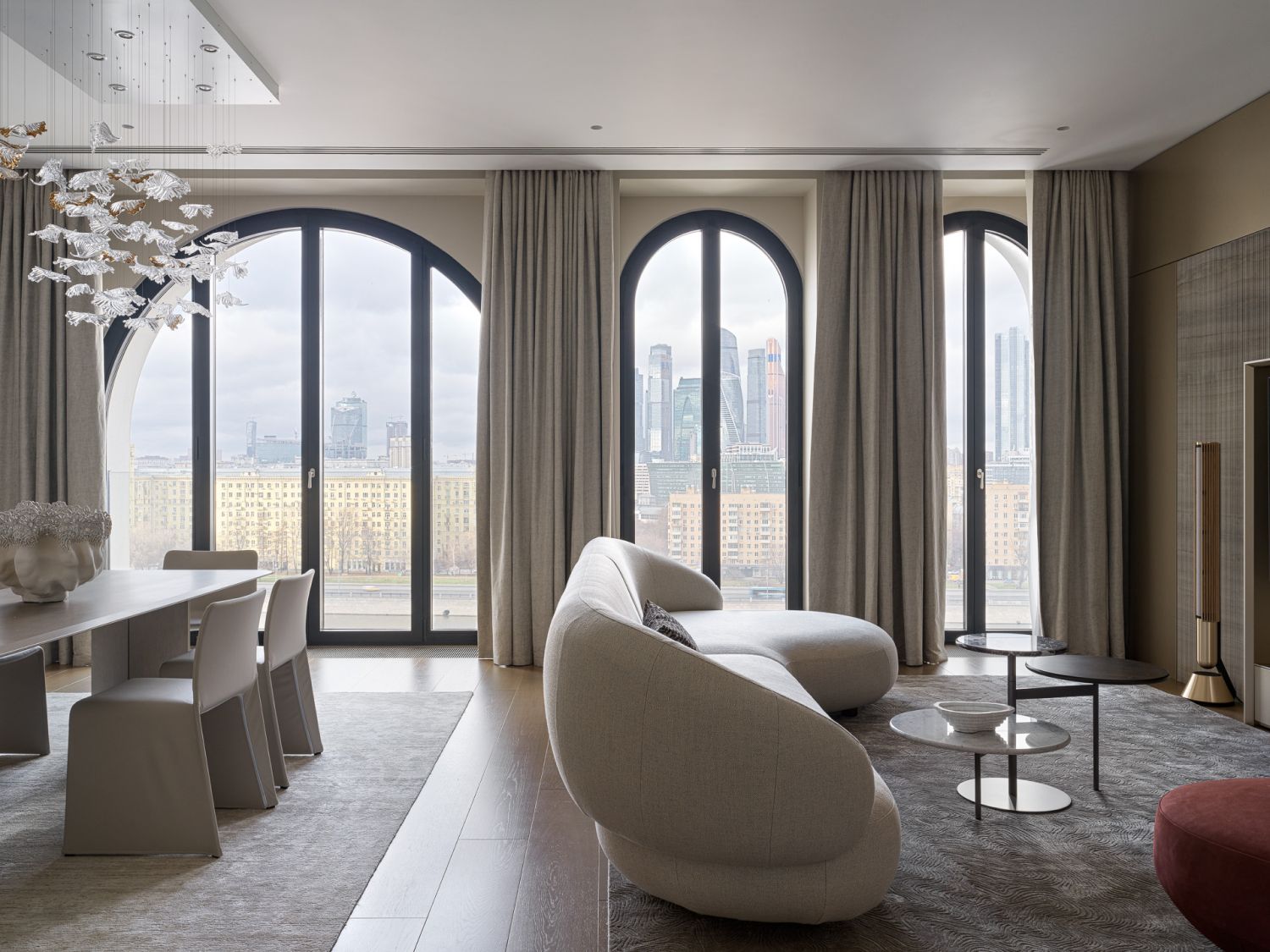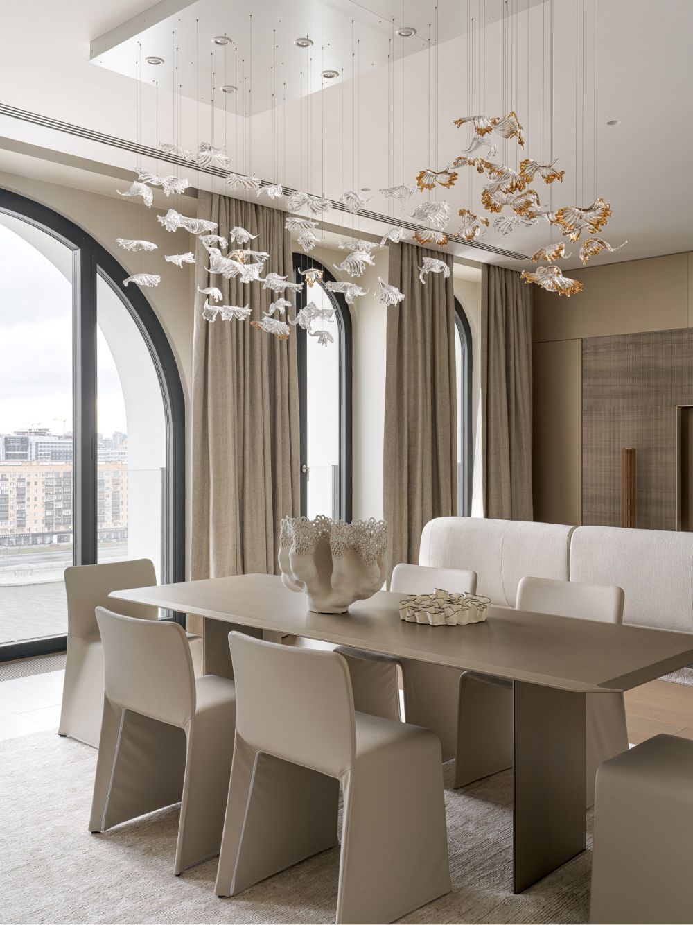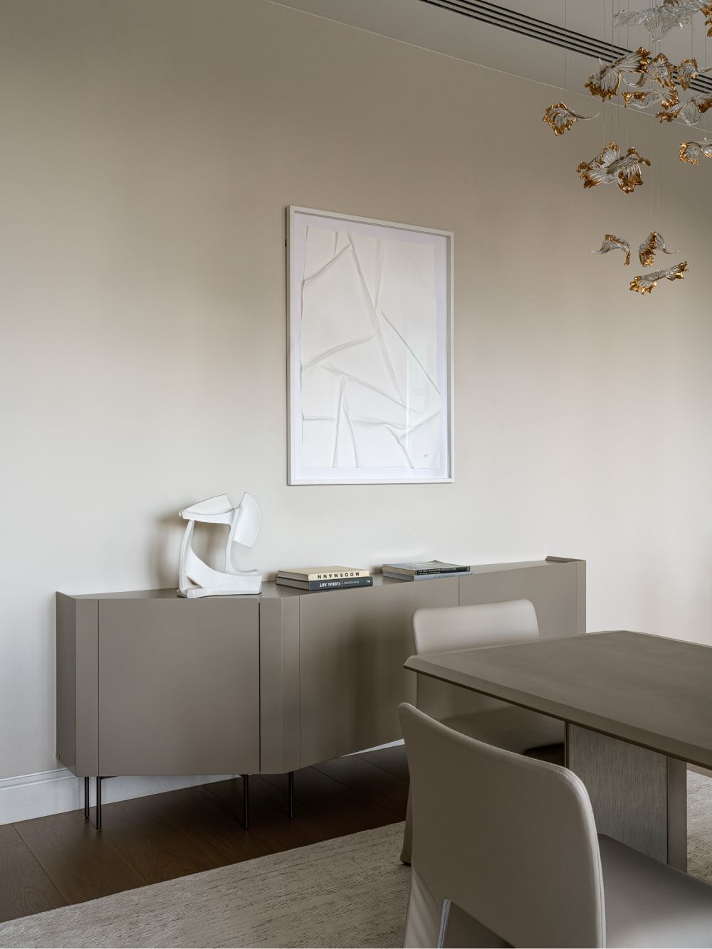 Центральный элемент гостиной – стеклянная люстра ручной работы, каждый лепесток которой выполнен в гутной технике из прозрачного стекла с добавлением позолоты, оммаж виртуозным произведениям муранских мастеров.