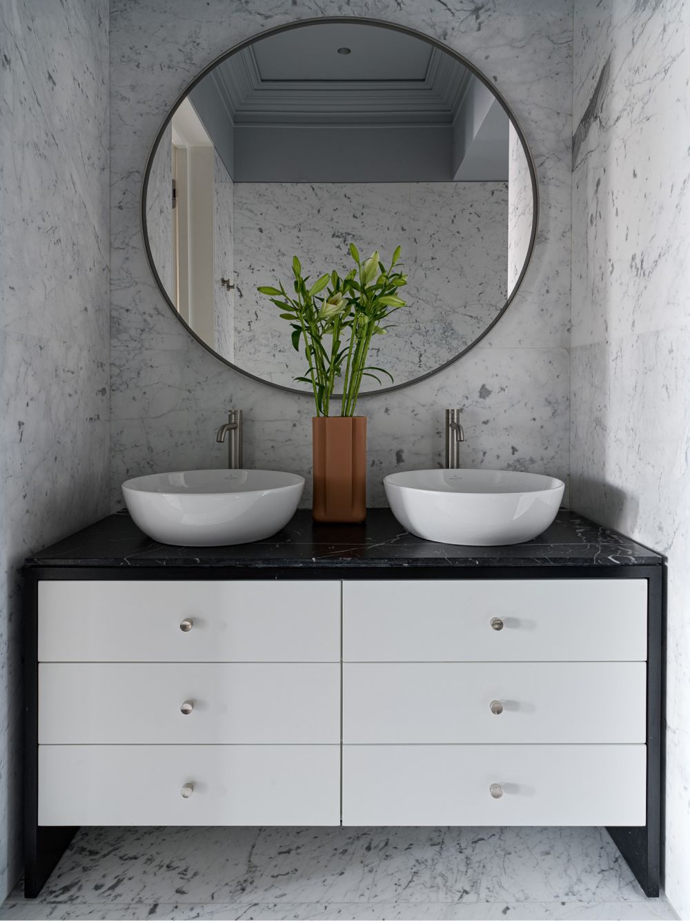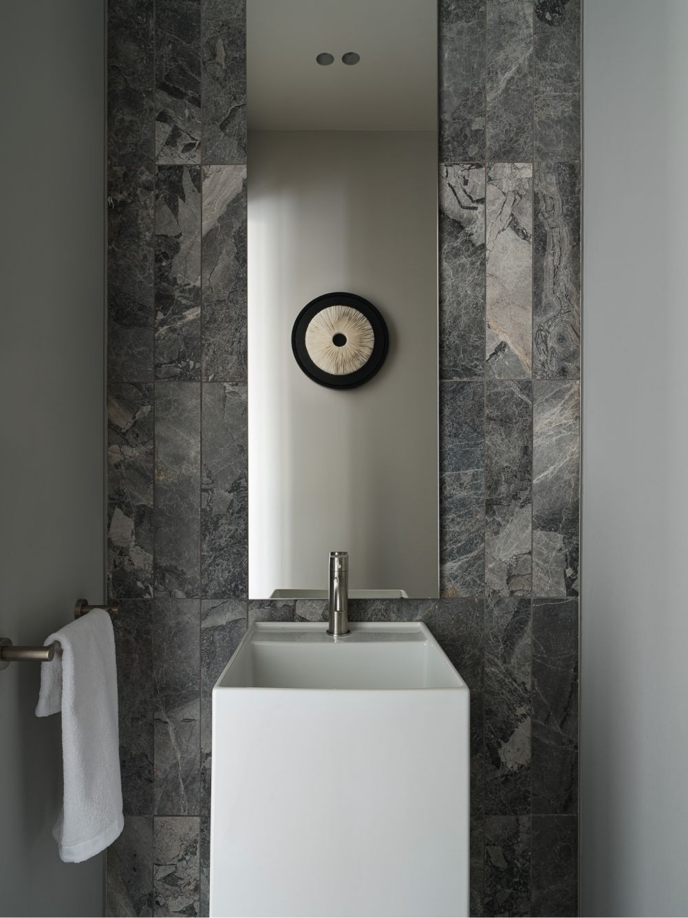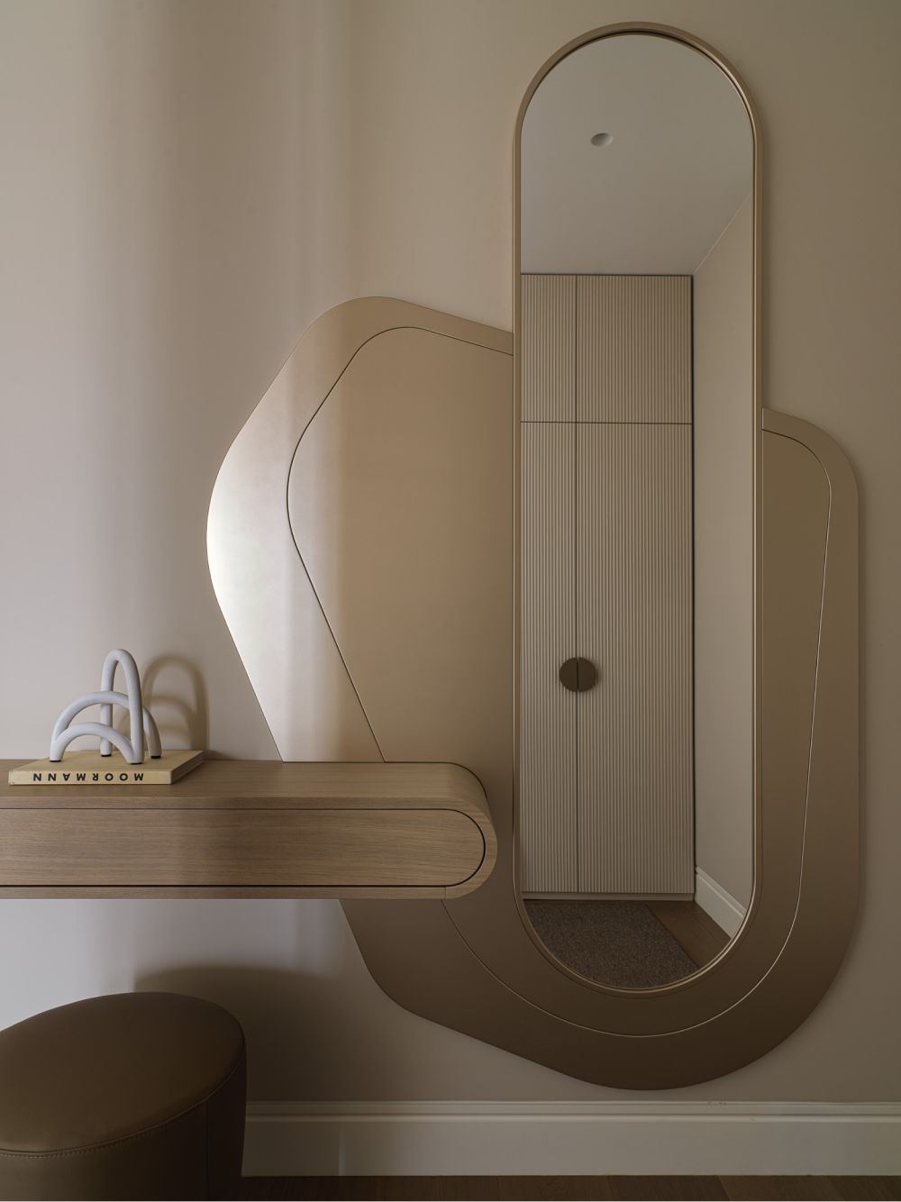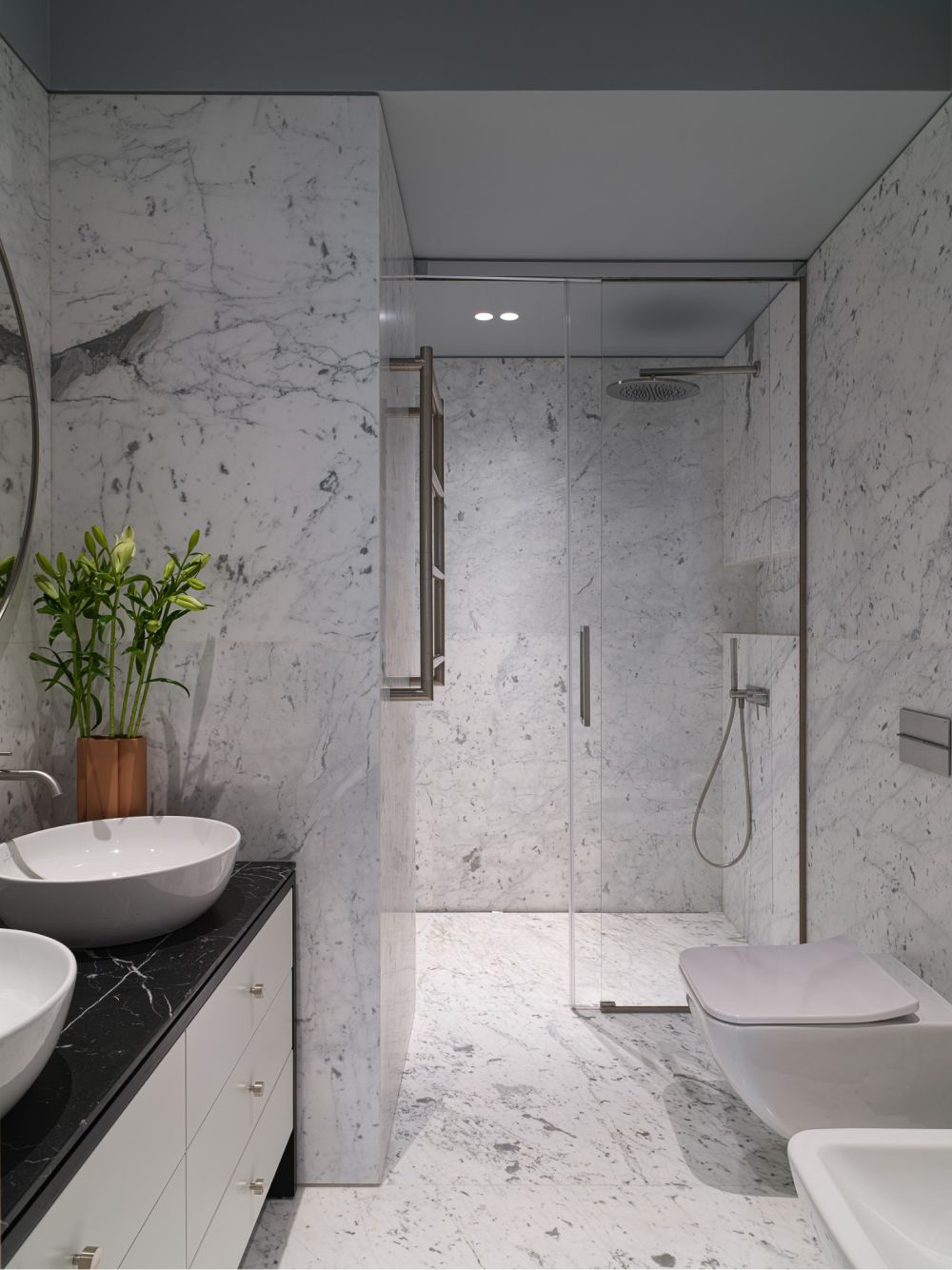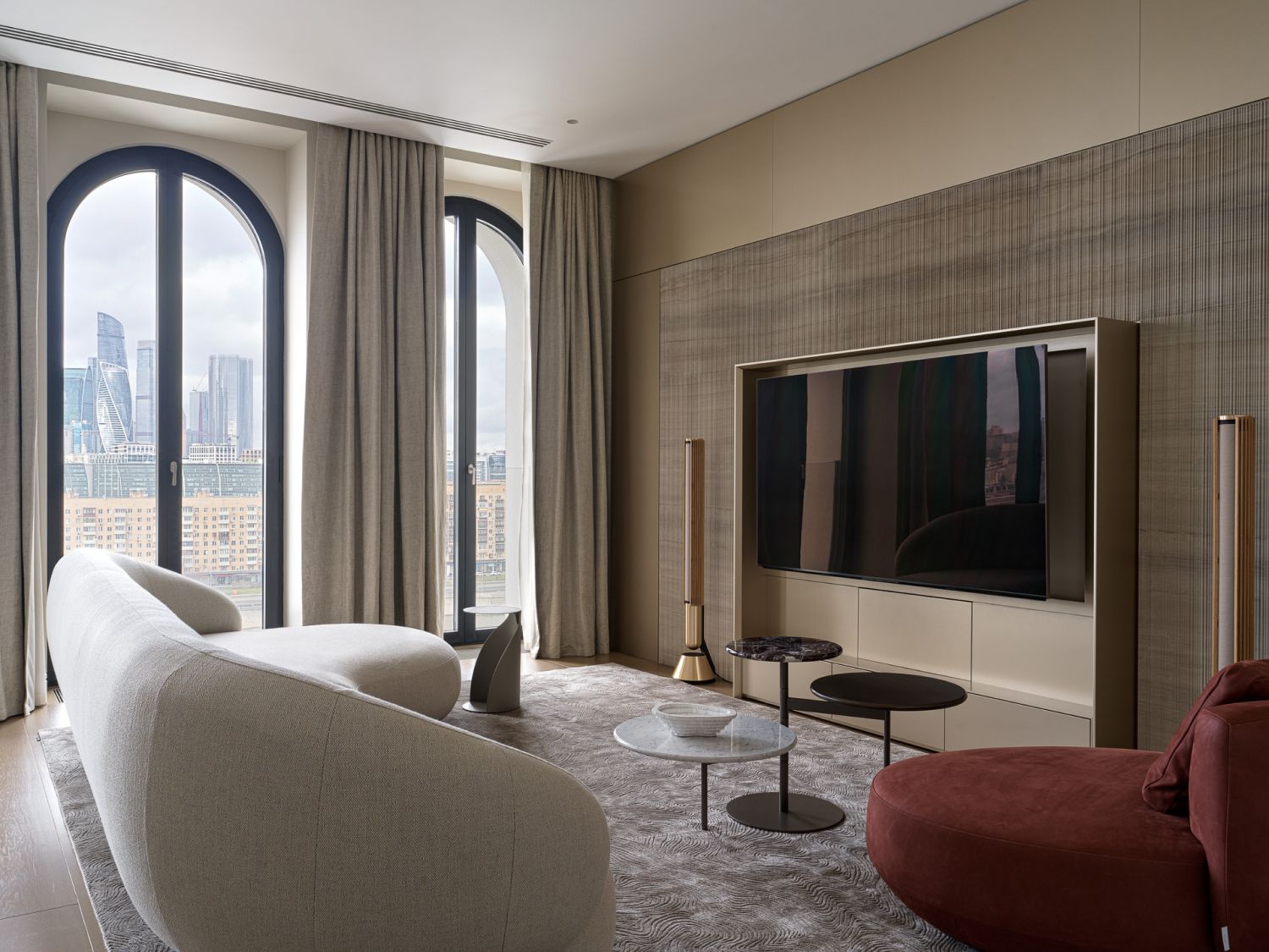 Эксперименты с натуральным камнем, его текстурами и различными обработками добавили интерьеру визуальную многогранность. Так, мрамор в зоне гостиной своими прожилками напоминает шелковую ткань. Чтобы добавить глубины, создать дополнительную игру светотени на нем была сделана фрезеровка по эскизу студии, напоминающая каннелюры античных колонн.