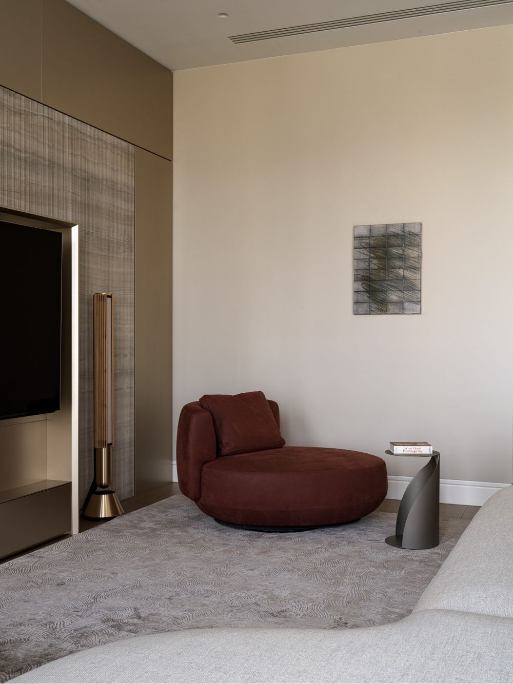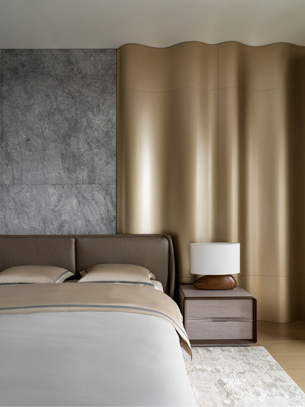 Интеллигентное прочтение венецианского золота продолжается и в мастер-спальне – объемное панно из латунной «портьеры» контрастирует и одновременно эффектно сочетается с грубо обработанным мрамором. На криволинейной поверхности в зависимости от времени суток по-разному играет свет, настраивая на расслабление и спокойное созерцание.