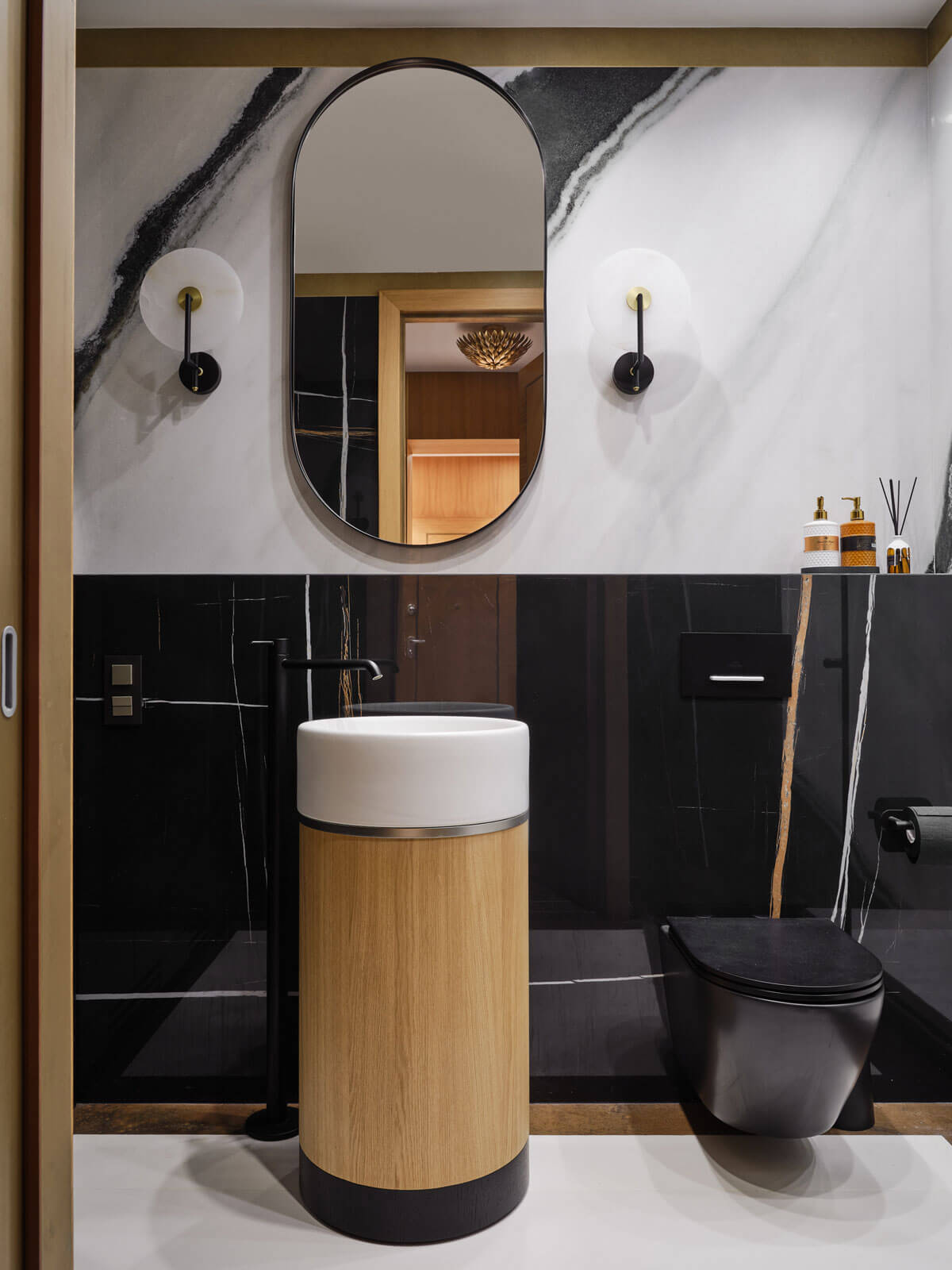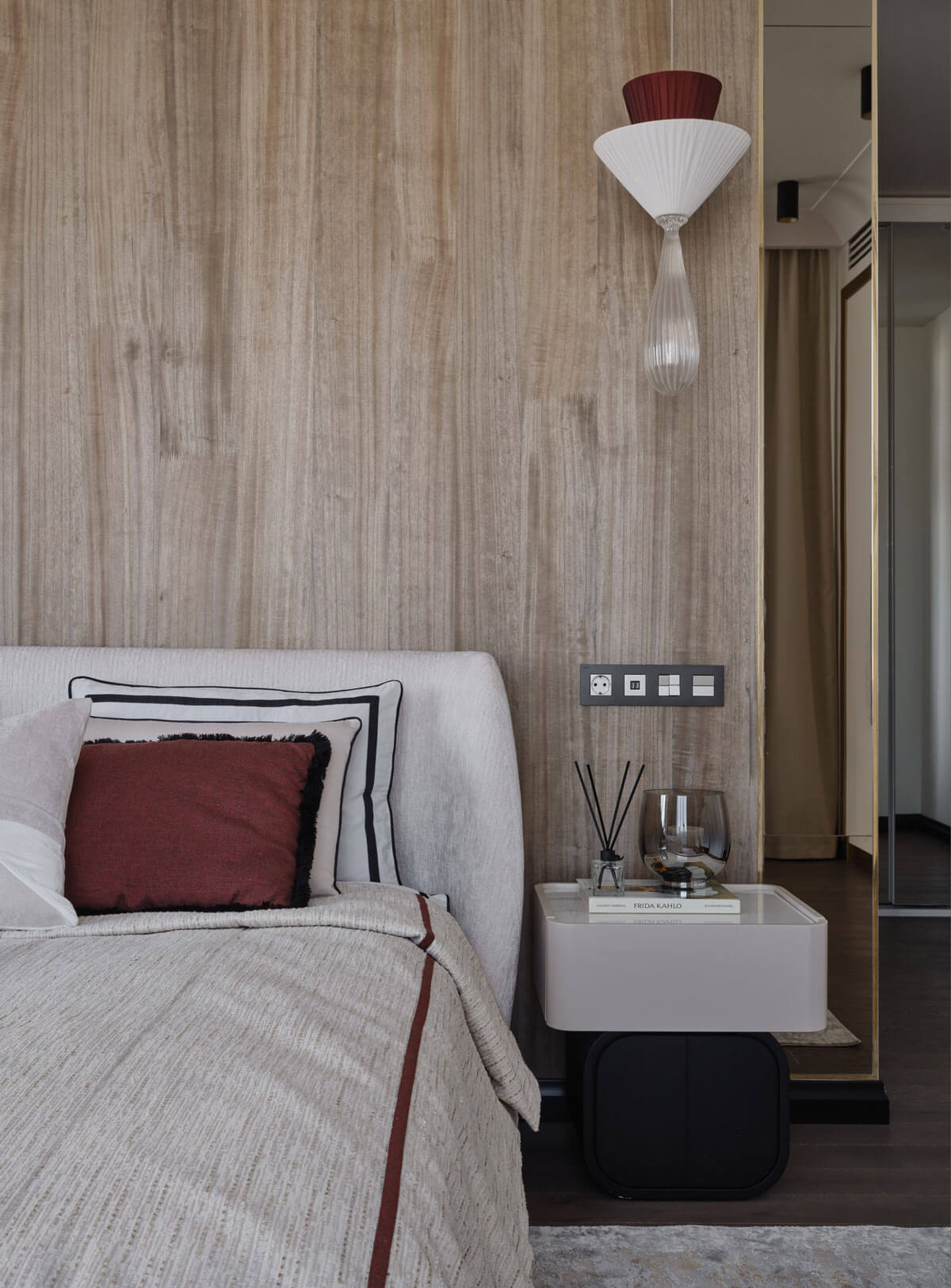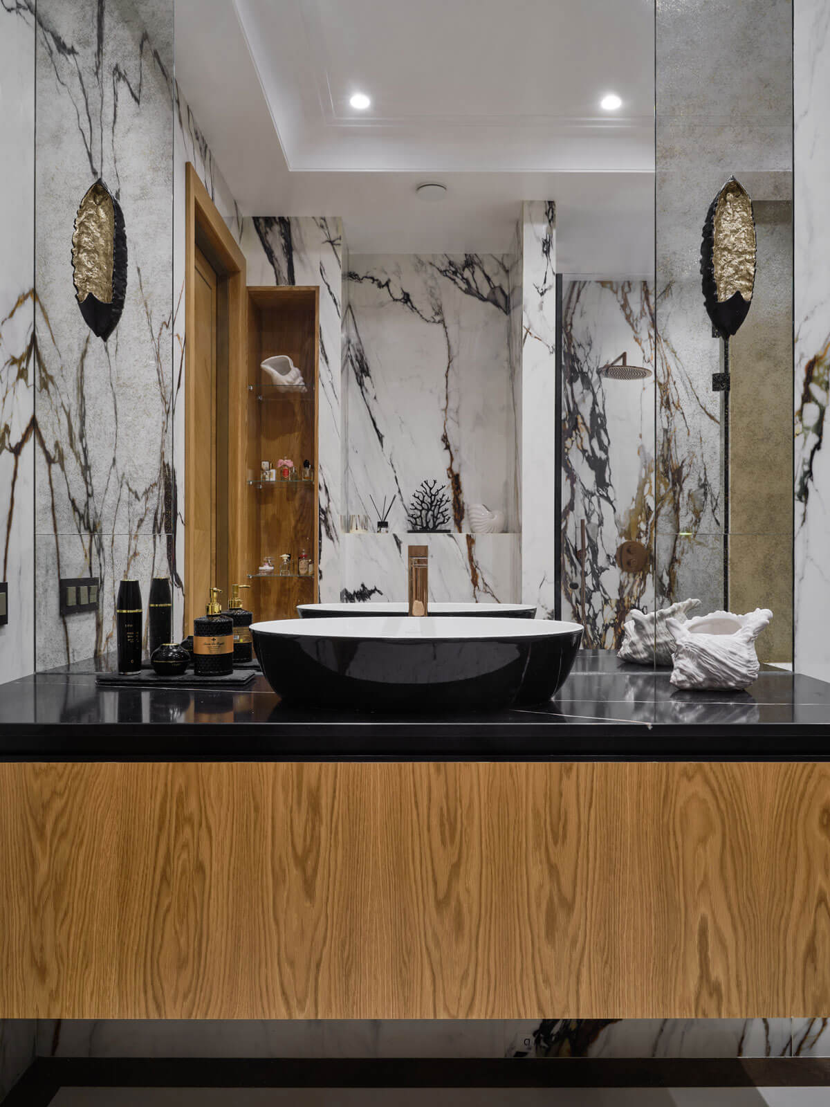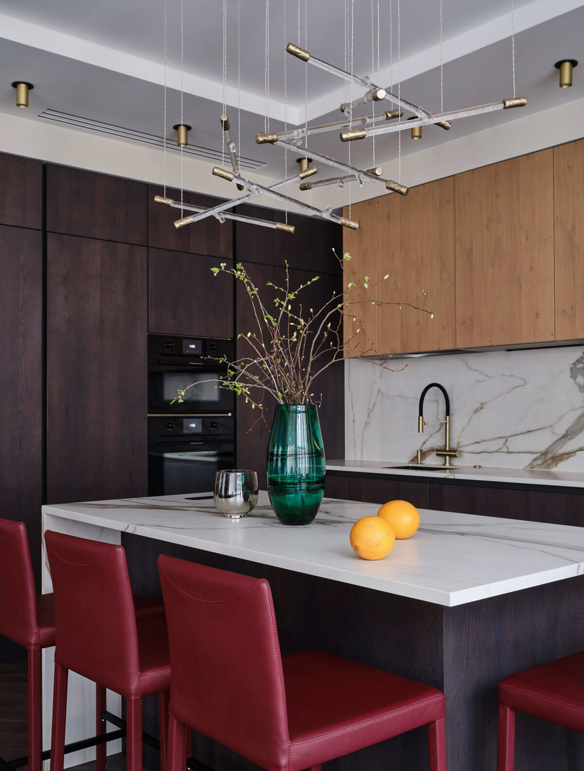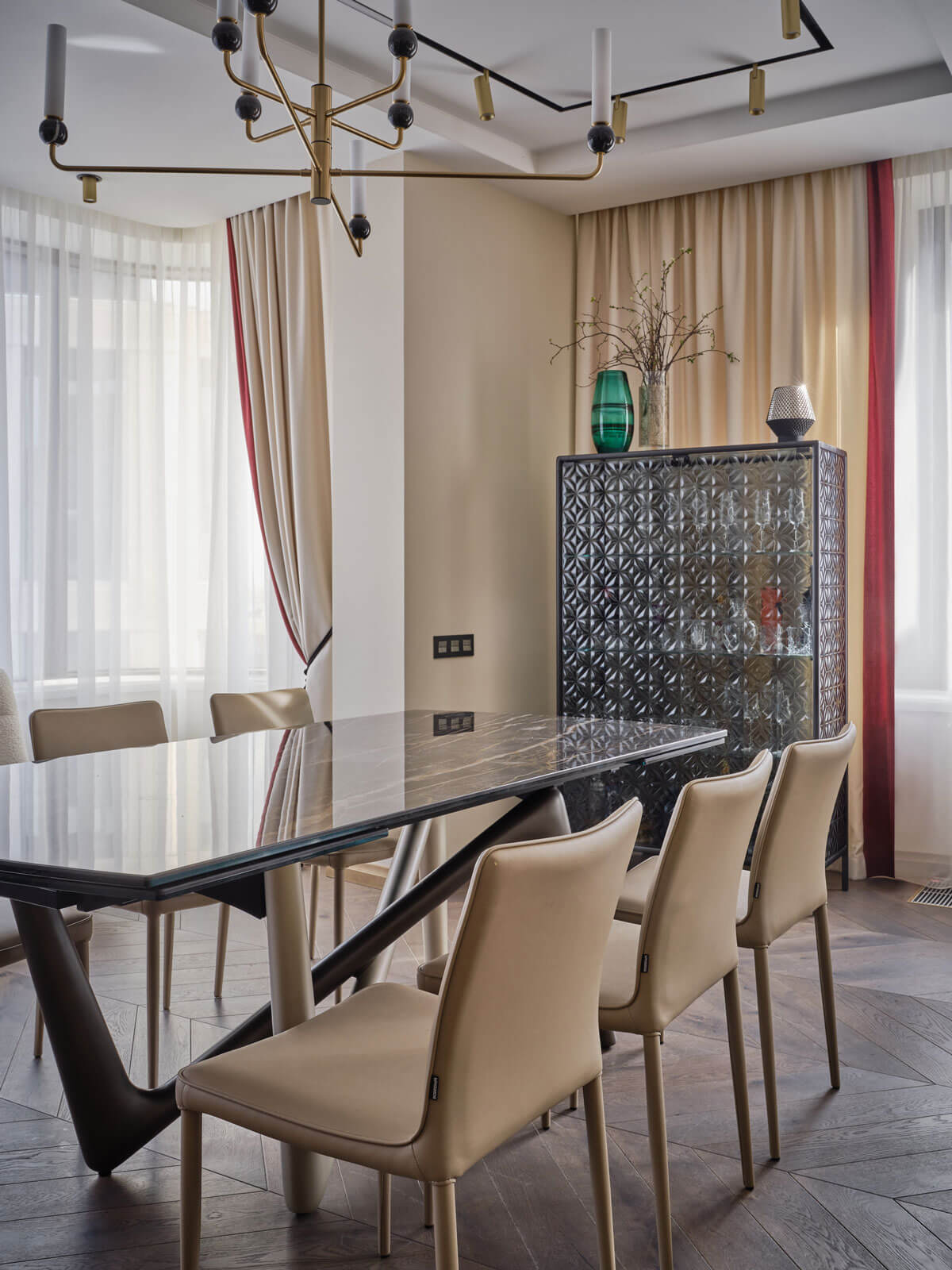 В отделках я всегда стараюсь отдавать предпочтение натуральным материалам: на полу паркет, в отделках мебели натуральная кожа, латунь, камень, керамика, шпон, шелковые обои. Цветовые решения интерьера выполнены в нейтральных тонах и оттенках максимально приближенных к природным с введением акцентных ярких пятен. Все столярные изделия и двери, изготовлены по проекту дизайнера. Мебель и свет мы заказывали как у европейских, так и у российских производителей. Световые сценарии в каждом помещении спроектированы таким образом, чтобы можно было создавать различное освещение под настроение — технические светильники обеспечивают яркий свет, люстры и подвесные светильники создают более приглушенное освещение, в бра — мягкий полумрак.