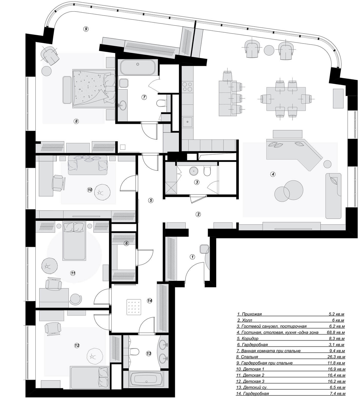 Требовалось выделить просторную общую зону гостиной, столовой и кухни и приватную зону спален. Создать большое количество мест хранения. Изначальная планировка апартаментов без несущих стен позволила разделить пространство на две части, разделенные по оси прихожей и гостевым санузлом, которые не пересекаются между собой. Таким образом удалось выделить обособленную приватную часть и просторную общую зону. Детские комнаты с собственным санузлом и гардеробной и зона хозяйской спальни, также с собственной ванной комнатой и гардеробной.