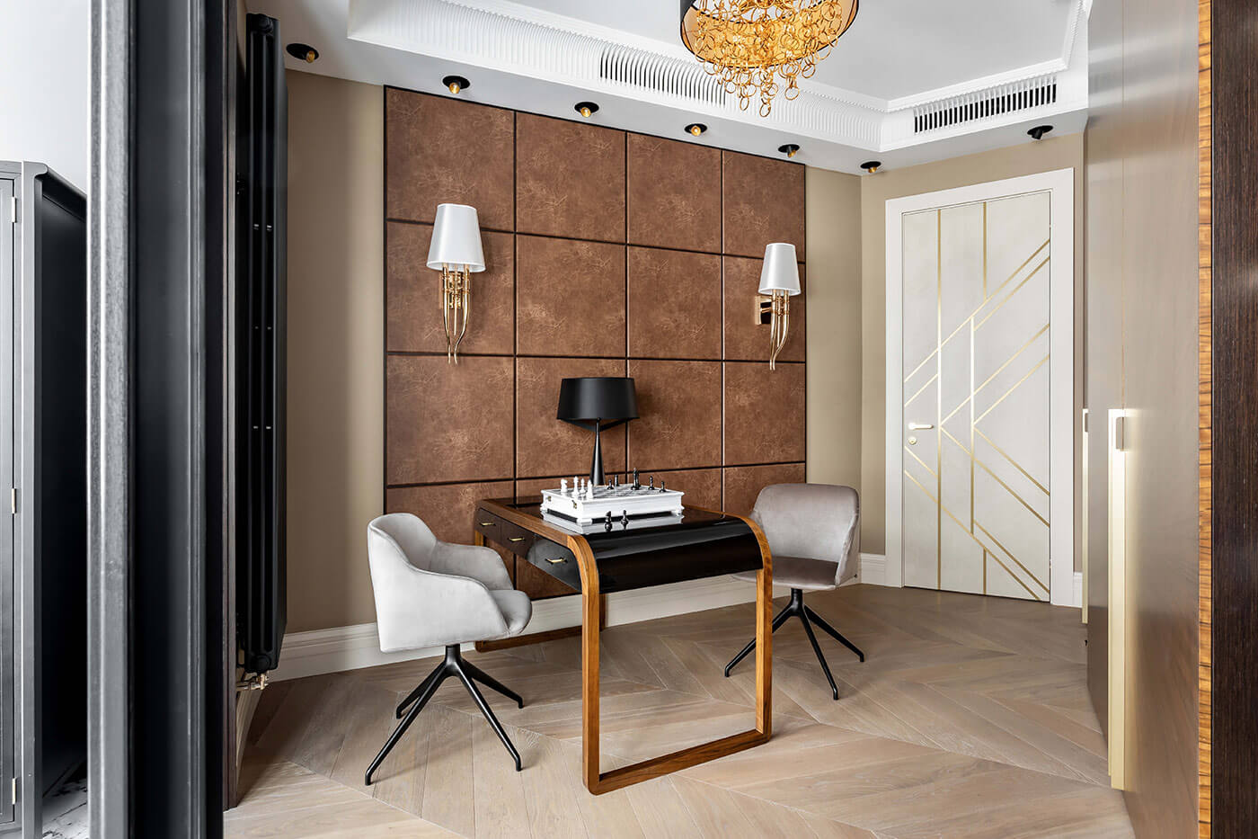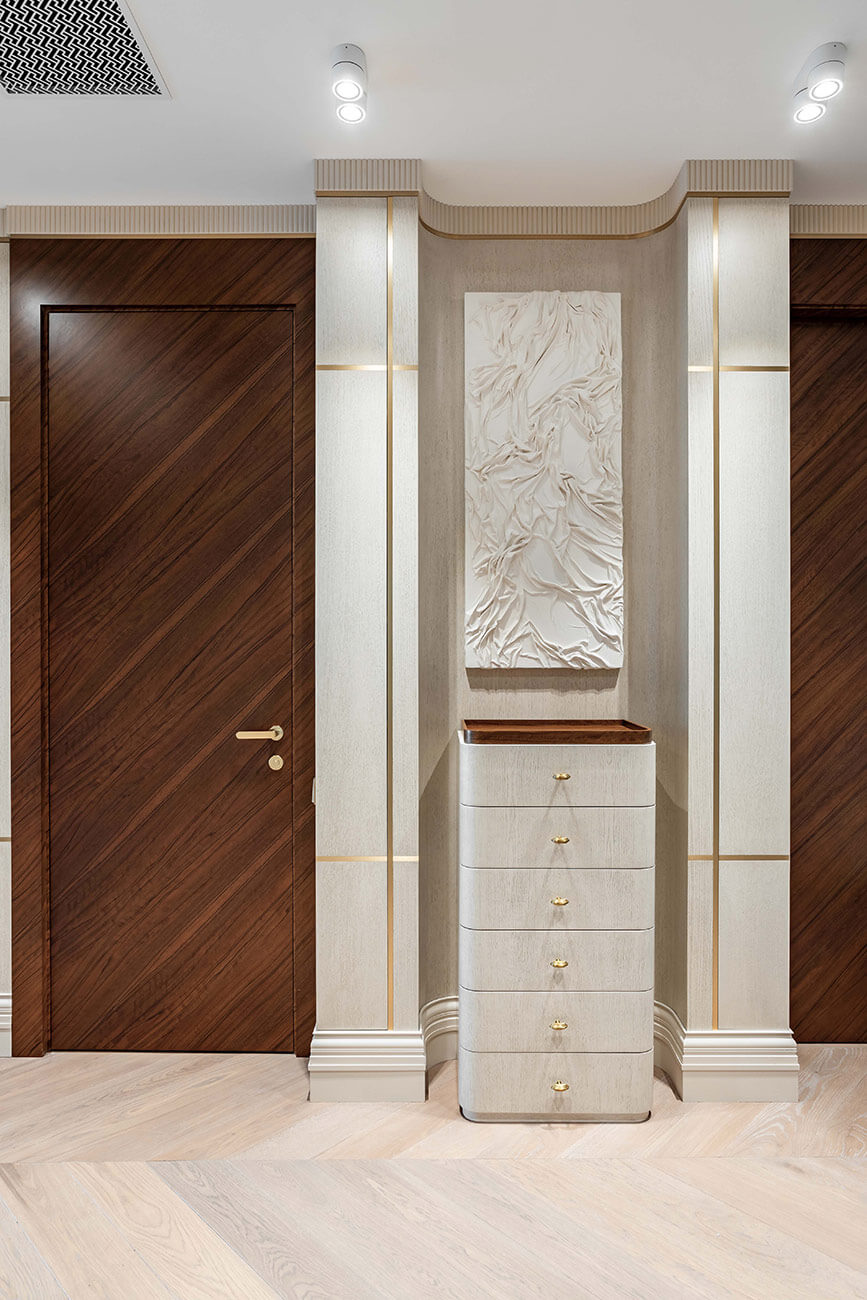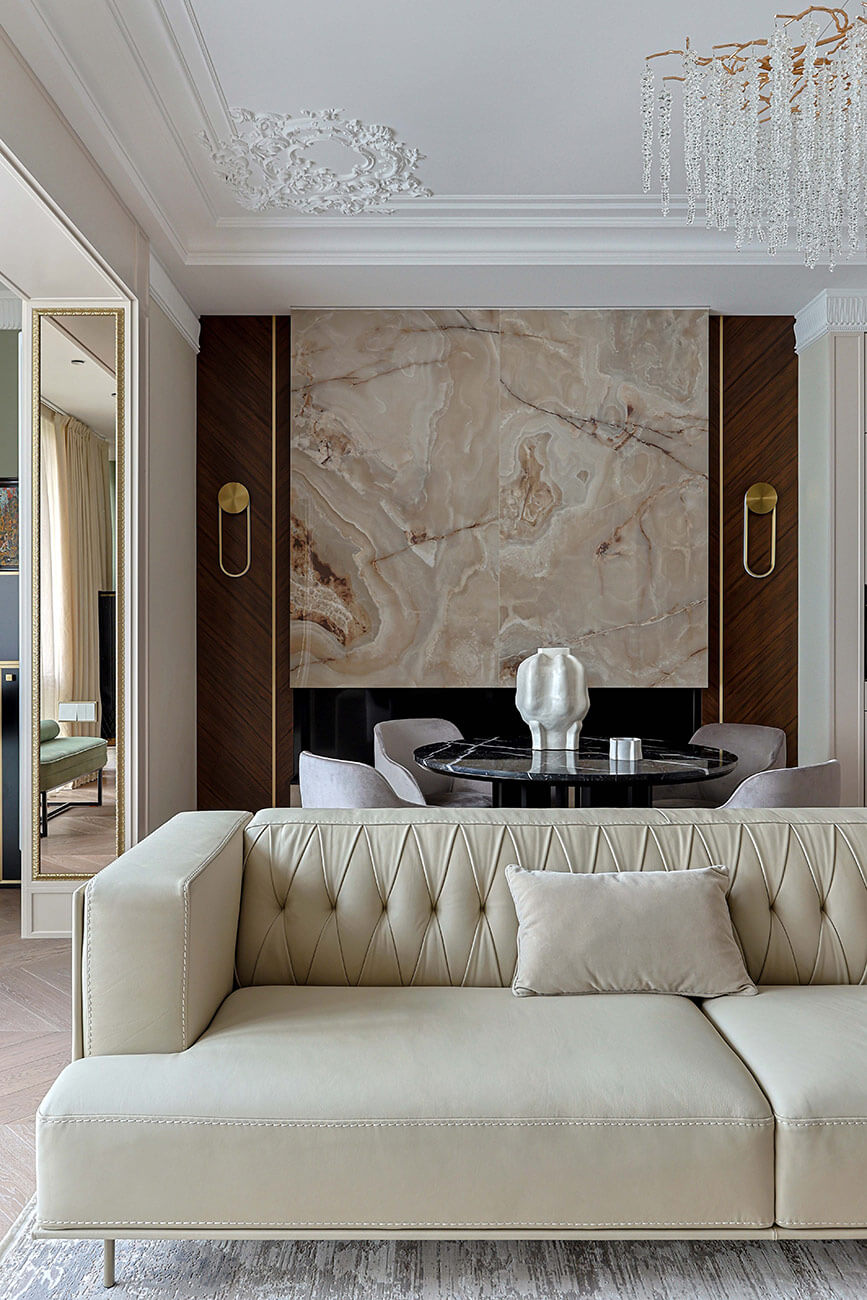 Заказчики хотели видеть респектабельный, люксовый интерьер с впечатляющим эффектом, с большим количеством зеркал, шпона, камня, латуни и качественной итальянской мебелью.
