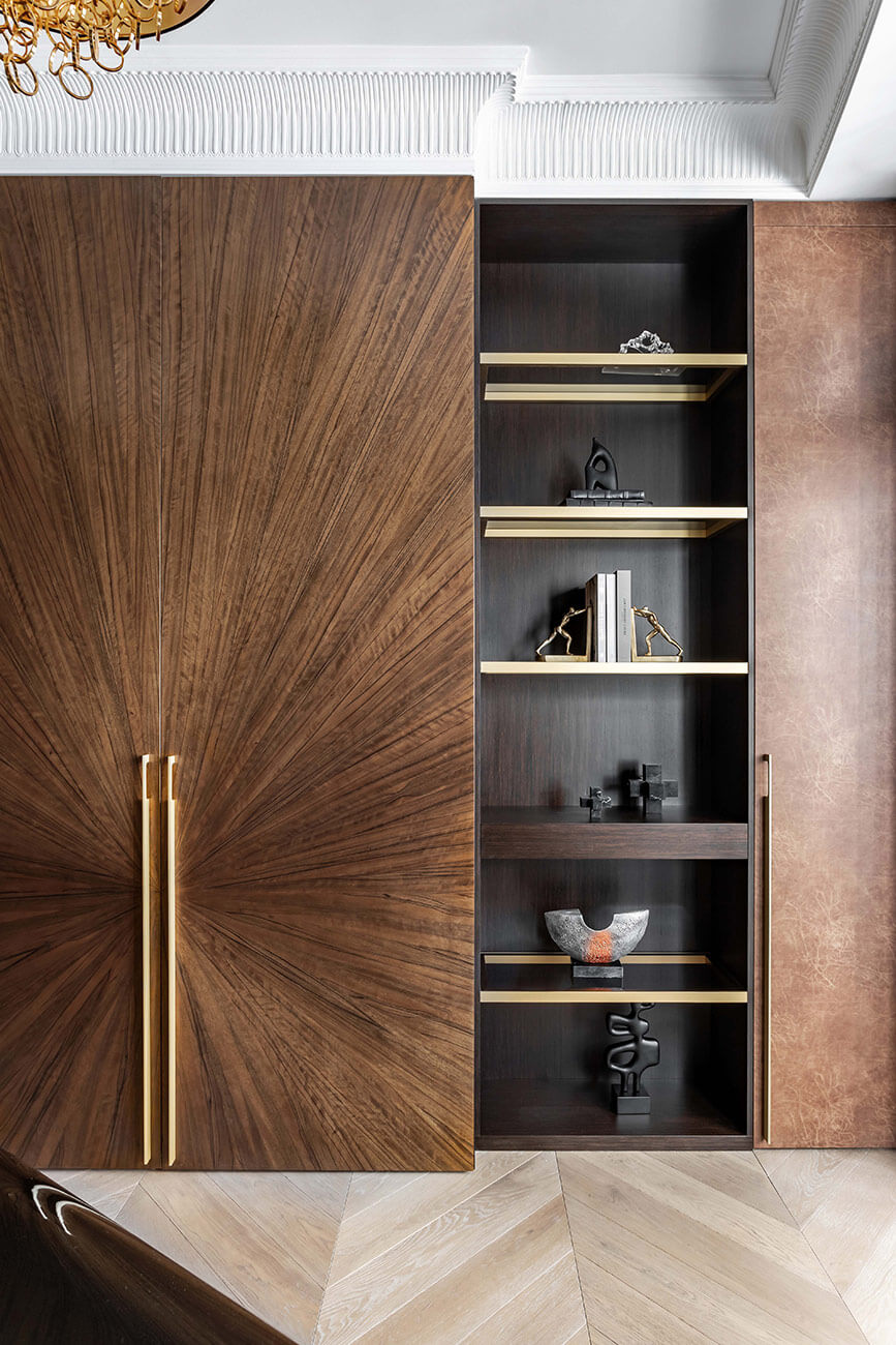 В кабинете предпочтение отдали более темным, насыщенным оттенкам. Кожаные панели и собранная вручную веерная раскладка редкого шпона на фасаде мебели делает помещение респектабельным и не повторимым. Шпон Палдао Тихоокеанский Орех.