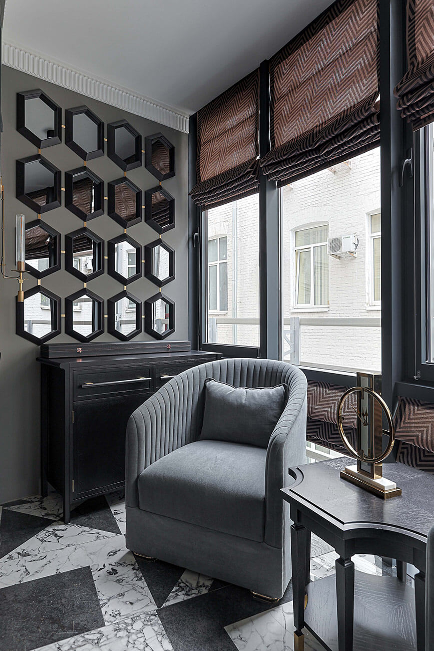 Небольшую лоджию при кабинете также удалось сделать интересной за счет геометрической игры зеркал и рисунка керамогранита. Помещение получилось истинно мужским.