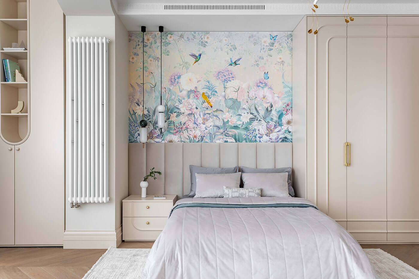 Также внимание привлекает панно из обоев с растительным рисунком,