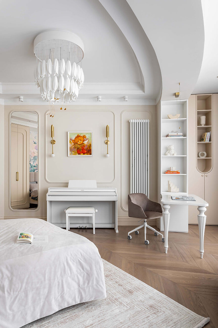 Комната девочки. Нежная, светлая и уютная спальня с кроватью по центру. Вдоль стены — симметричные молдинги, Центральное местов них занимает солнечная картина Галины Чувиляевой.