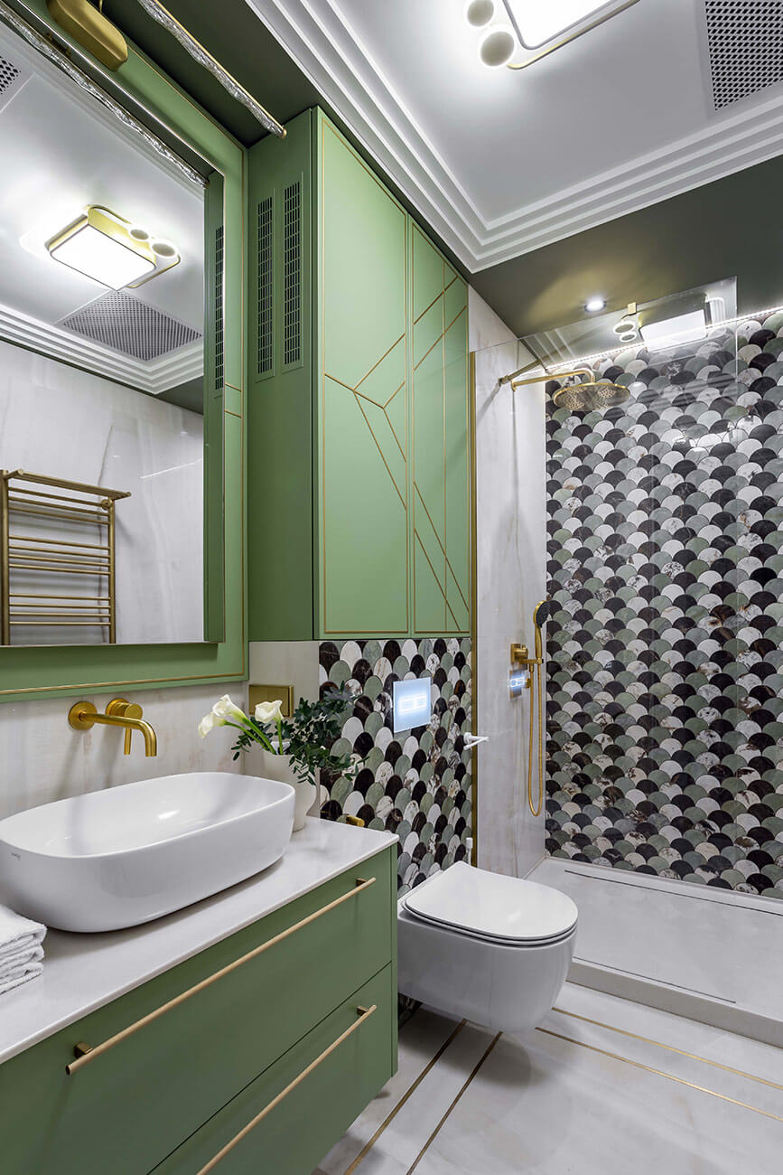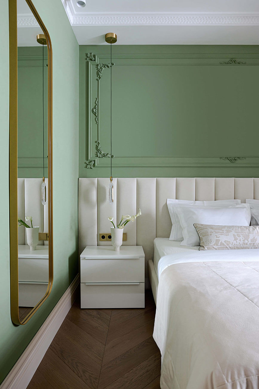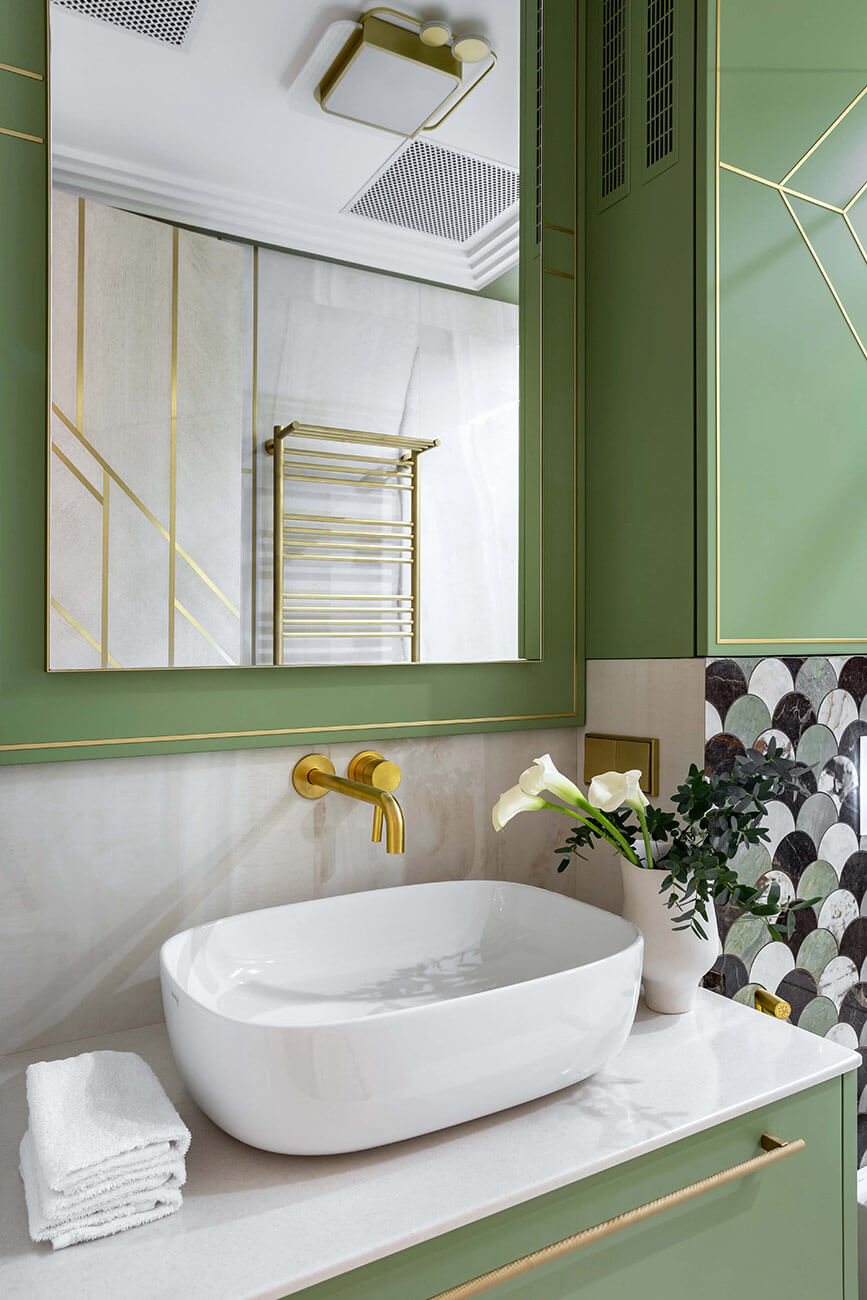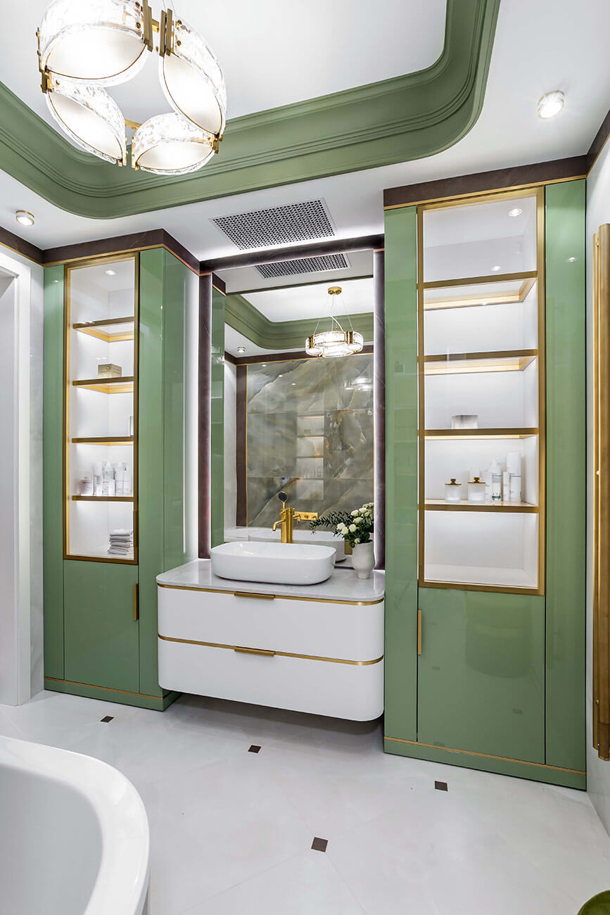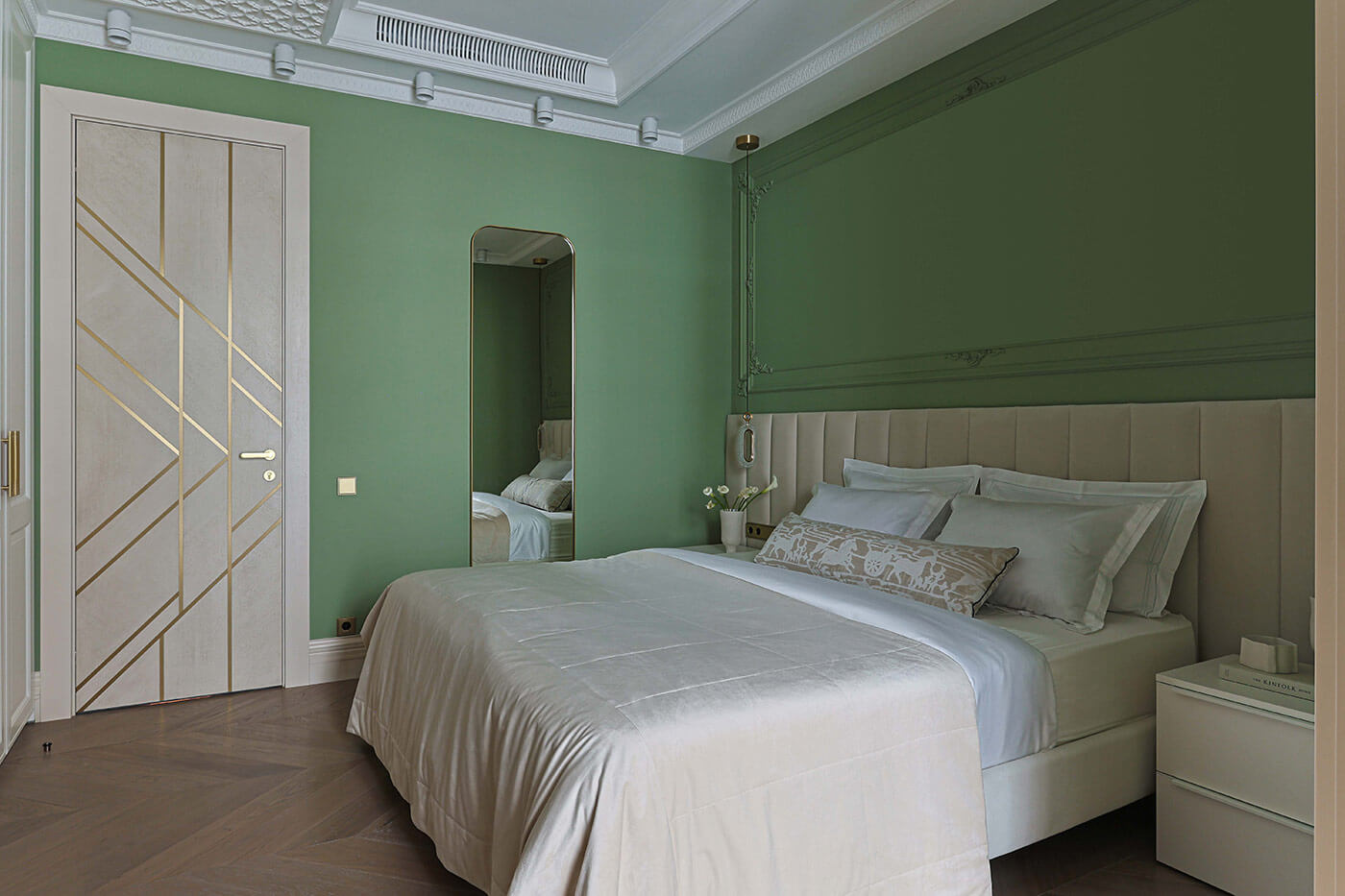 В выборе стиля интерьера дизайнер отталкивалась от желания заказчиков создать атмосферу особого уюта и достичь ощущения роскоши, при этом не уходя в излишнюю декоративность. Также пришлось учитывать любовь заказчицы к сложному оттенку зеленого цвета, который гармонично вписался в зону личного пространства: мастер-спальню и санузлы.