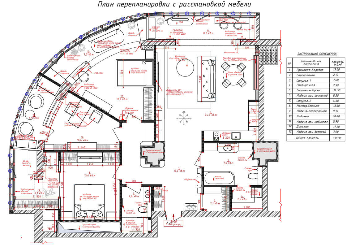 Владельцы — семейная пара с ребенком — обратились с просьбой реализовать сложный проект: жилое помещение, имеющее форму четверти круга, с непрерывным остеклением по радиусу и достаточно большим вертикальным коробом с коммуникациями в центре квартиры.
