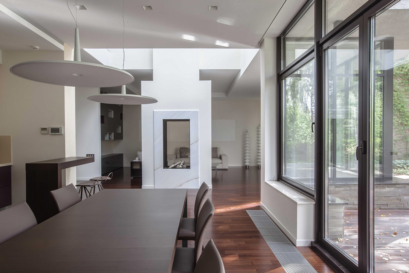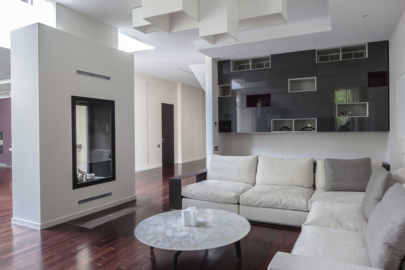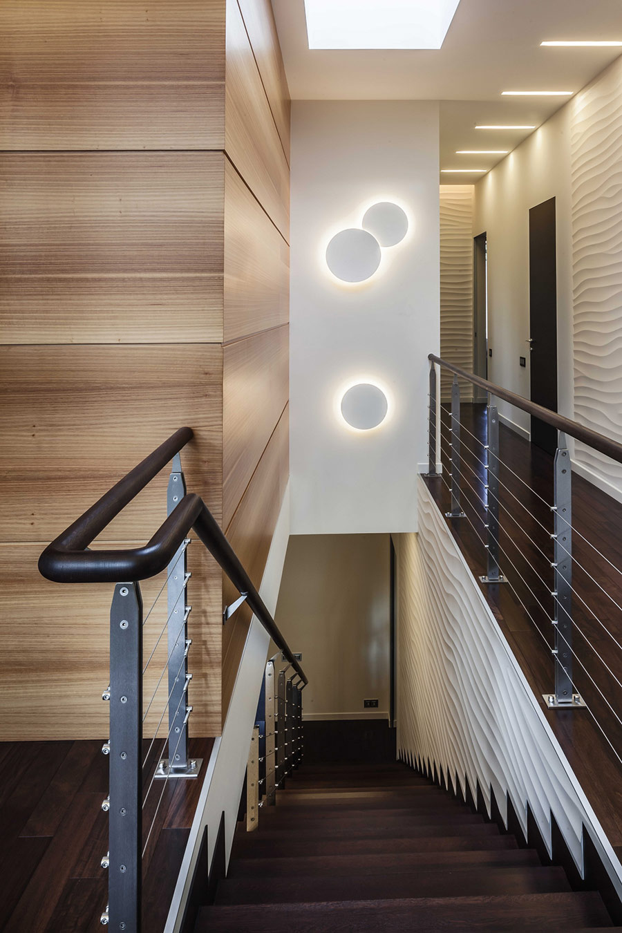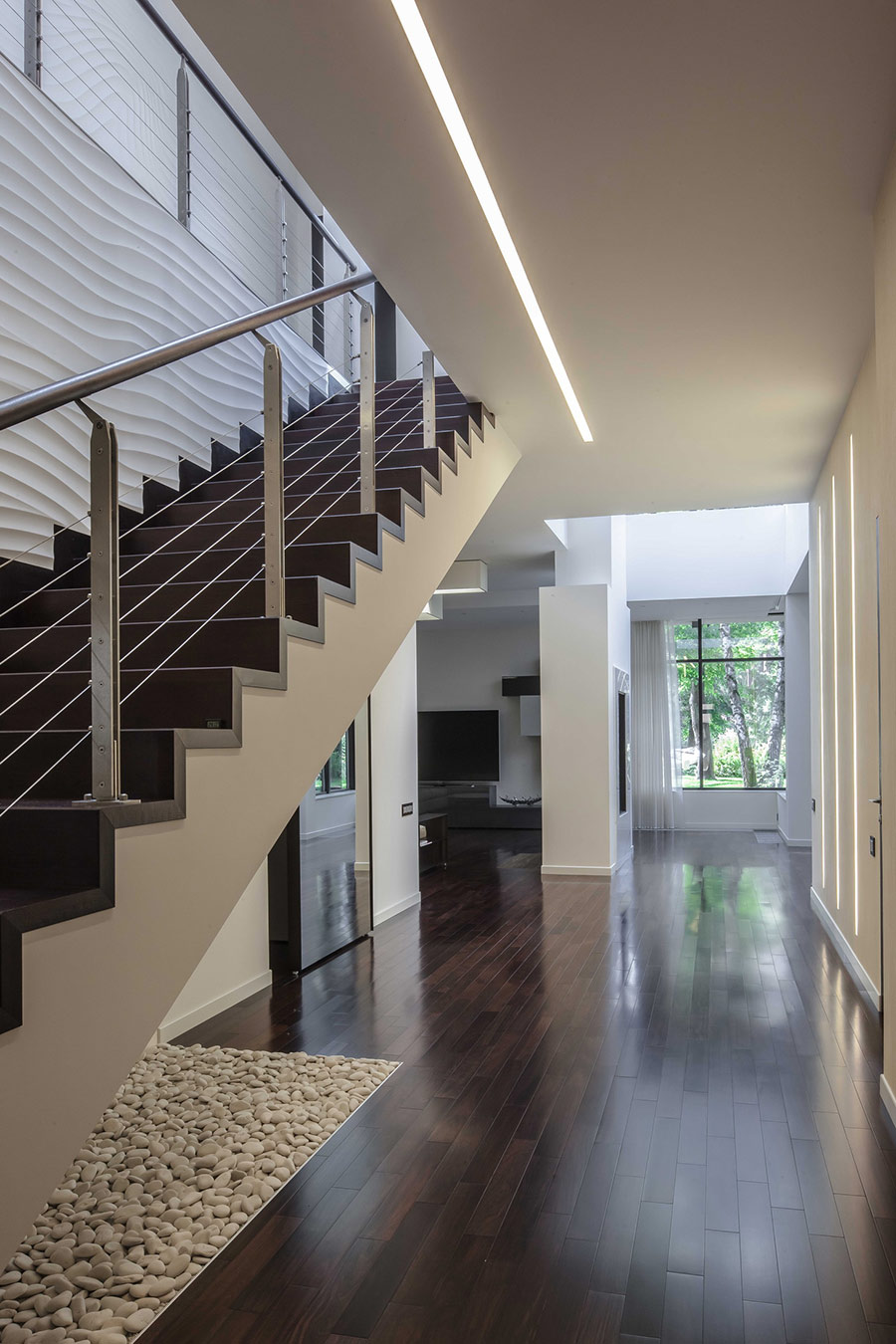 Интерьер выполнен в светлых тонах с использованием цвето-фактурных акцентов. Самый активный элемент здесь — пол из американского ореха. Стены покрыты фактурной штукатуркой молочного цвета. Центральный элемент дома — камин, уходящий в двусветное пространство и отделяющий столовую зону от гостиной. В гостиной разместился большой Г-образный диван. Декоративные радиаторы, словно космические антенны, возвышаются у окна. На второй этаж ведет лестница, отделанная темным деревом, здесь расположена приватная зона со спальнями и санузлами. Холл 2 этажа отделан фактурными волнистыми панелями. Морской тематике вторят ограждения с металлическими тросами.