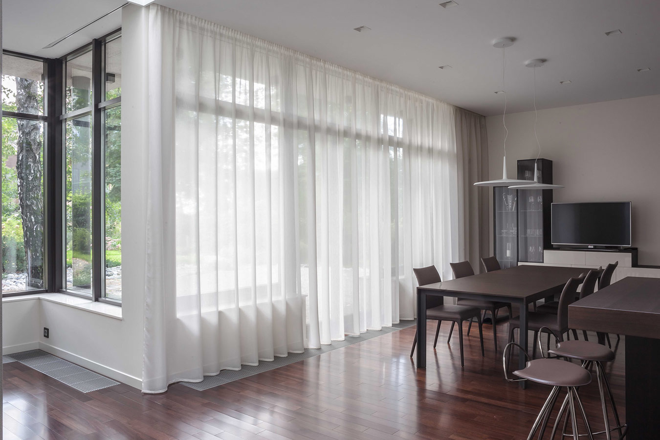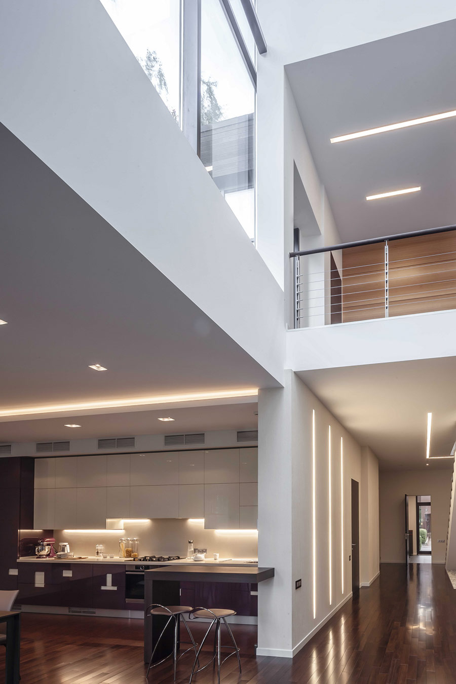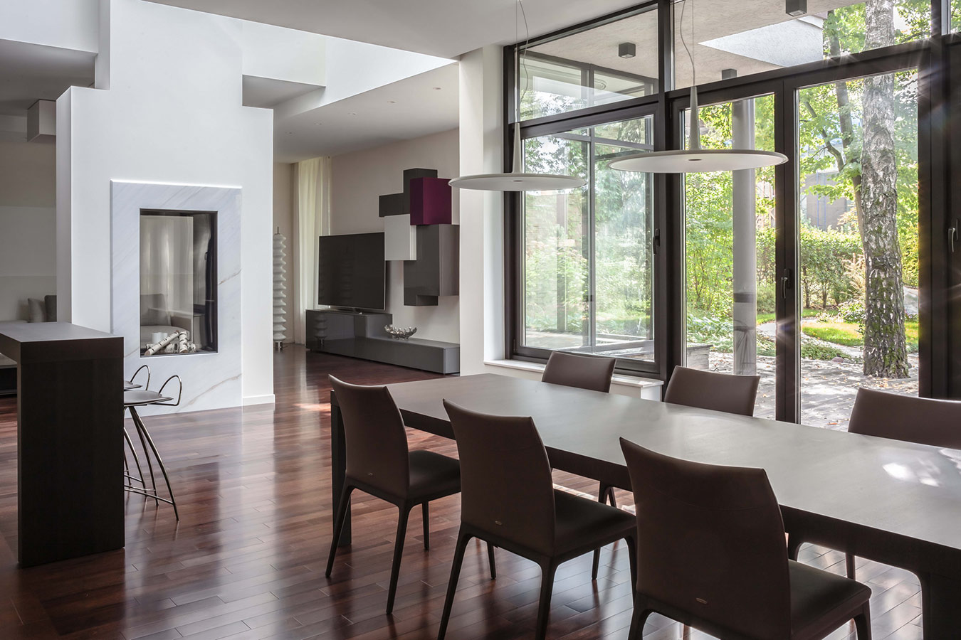 Интерьер выполнен в светлых тонах с использованием цвето-фактурных акцентов. Самый активный элемент здесь — пол из американского ореха. Стены покрыты фактурной штукатуркой молочного цвета. Центральный элемент дома — камин, уходящий в двусветное пространство и отделяющий столовую зону от гостиной. В гостиной разместился большой Г-образный диван. Декоративные радиаторы, словно космические антенны, возвышаются у окна. На второй этаж ведет лестница, отделанная темным деревом, здесь расположена приватная зона со спальнями и санузлами. Холл 2 этажа отделан фактурными волнистыми панелями. Морской тематике вторят ограждения с металлическими тросами.