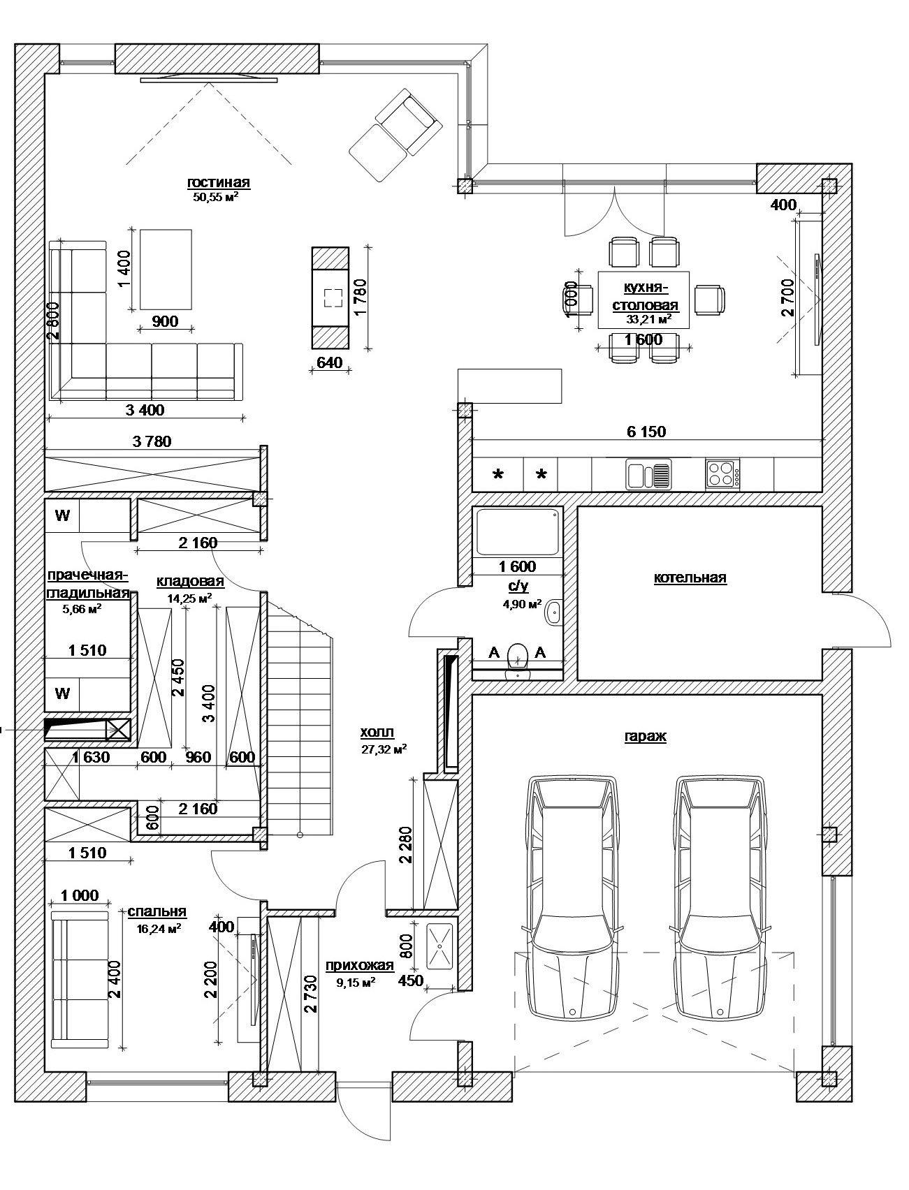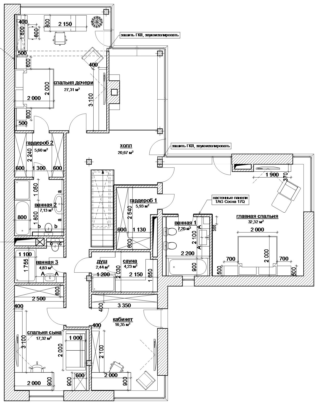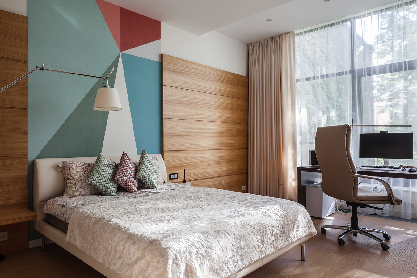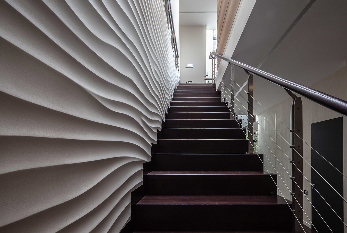 Интерьер выполнен в светлых тонах с использованием цвето-фактурных акцентов. Самый активный элемент здесь — пол из американского ореха. Стены покрыты фактурной штукатуркой молочного цвета. Центральный элемент дома — камин, уходящий в двусветное пространство и отделяющий столовую зону от гостиной. В гостиной разместился большой Г-образный диван. Декоративные радиаторы, словно космические антенны, возвышаются у окна. На второй этаж ведет лестница, отделанная темным деревом, здесь расположена приватная зона со спальнями и санузлами. Холл 2 этажа отделан фактурными волнистыми панелями. Морской тематике вторят ограждения с металлическими тросами.