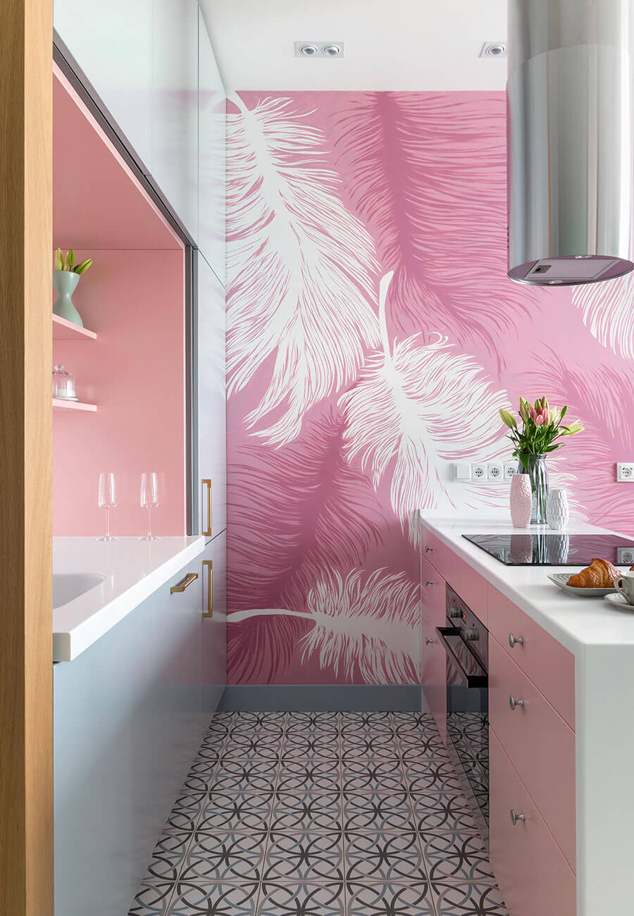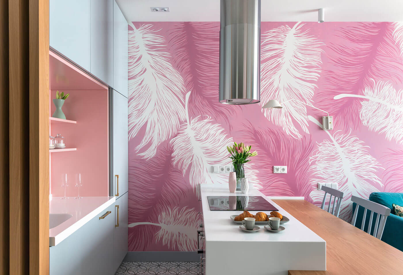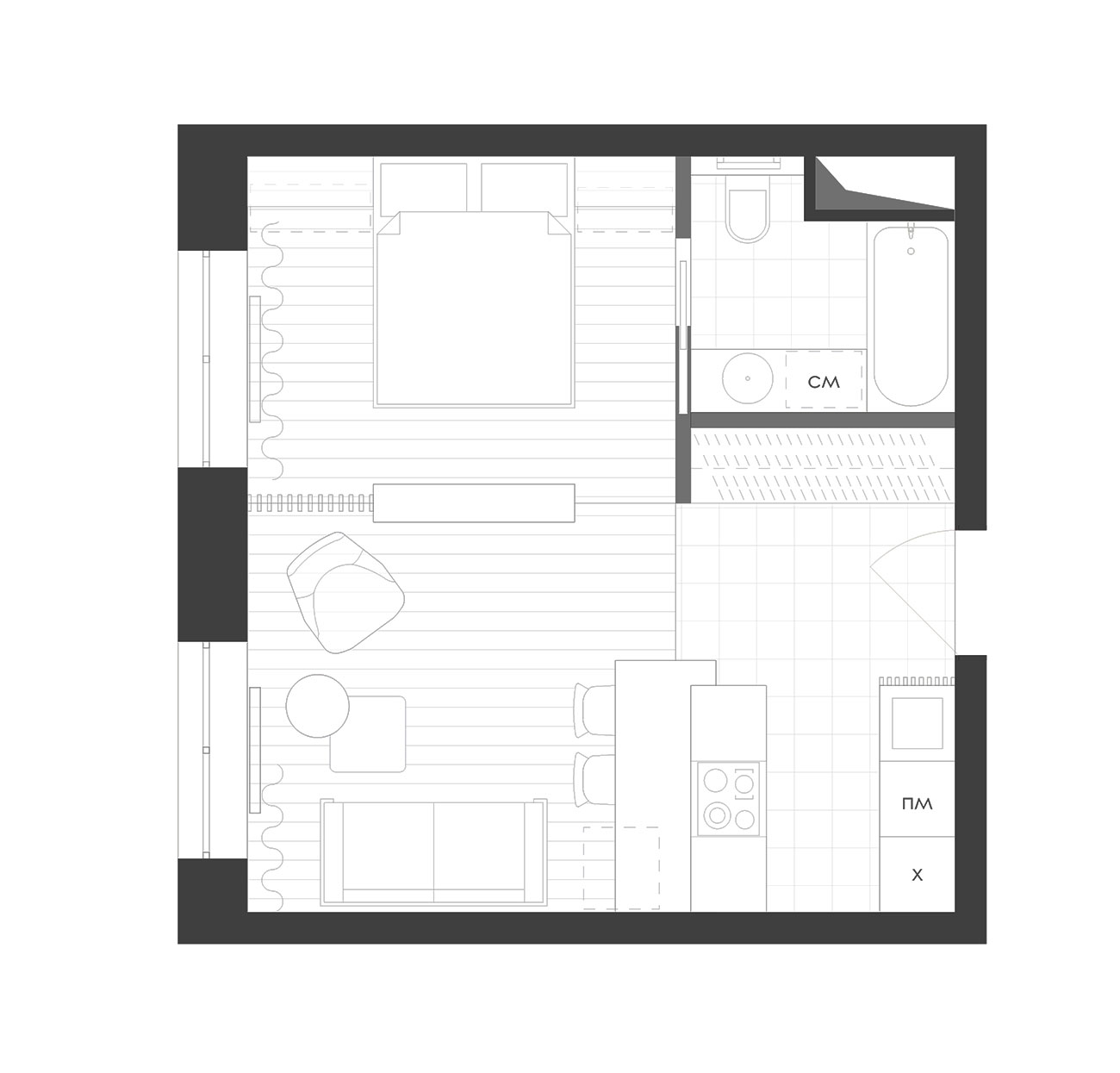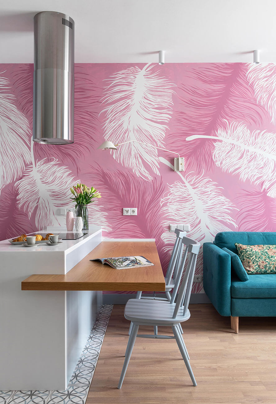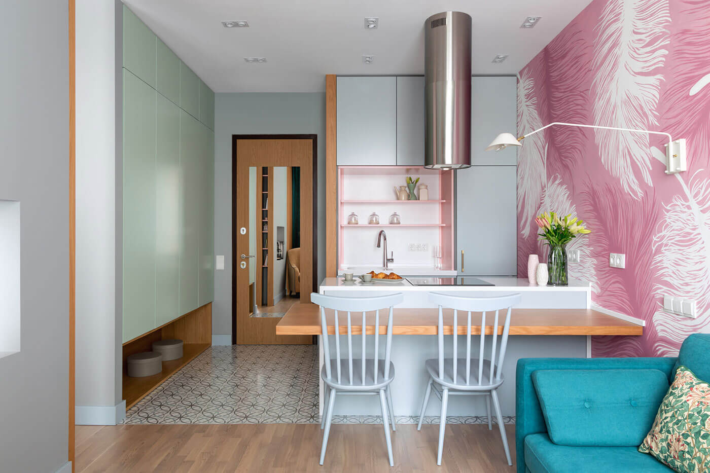 Проект квартиры студии общей площадью 33,2 кв.м. выполнен для молодой экспрессивной и женственной девушки, которая хотела привнести в свой дом ярких и позитивных эмоций. В связи с этим главной концепцией стало создание легкого интерьера с романтическим настроением. Воплощением данной идеи послужили нежные цвета и сюжетная роспись на основной стене. Легкость также добавила открытая и нестандартная планировка: европейское решение расположения кухни ближе ко входу, отказ от разделения пространства на отдельные комнаты, объединение личной и общей зон благодаря реечным перегородкам и открытой ниши с камином, вход в ванную расположен со стороны спальни.