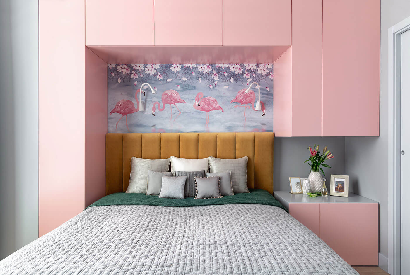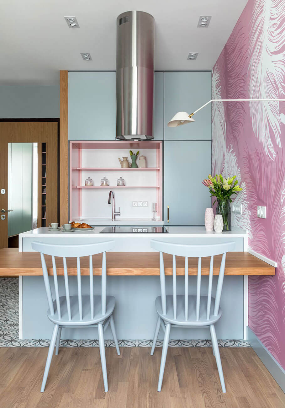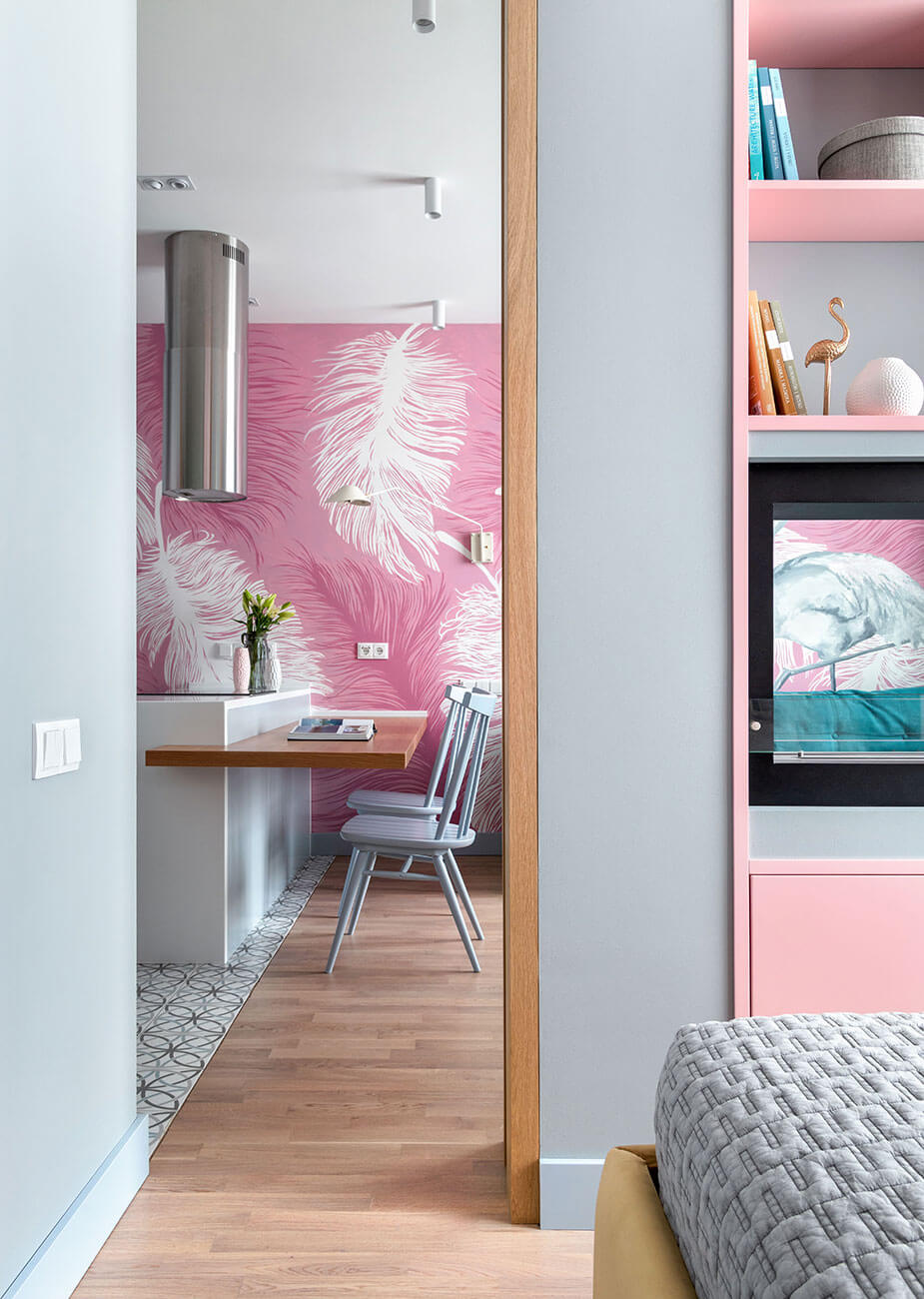 Обозначенное в брифе заказчицей романтическая атмосфера в интерьере и радужное настроение не очень присущи в работе. В проекте это пожелание я выразила в цвете и росписи на стене, при этом компенсировав за счет четких, лаконичных форм в мебели, и строгой геометрии. Концепция единого пространства, довольно прогматичного с функциональной стороны, обыграна контрастной атмосферой легкости, что и воплощает истинный архитектурный взгляд на романтику.