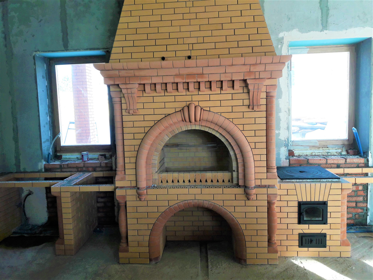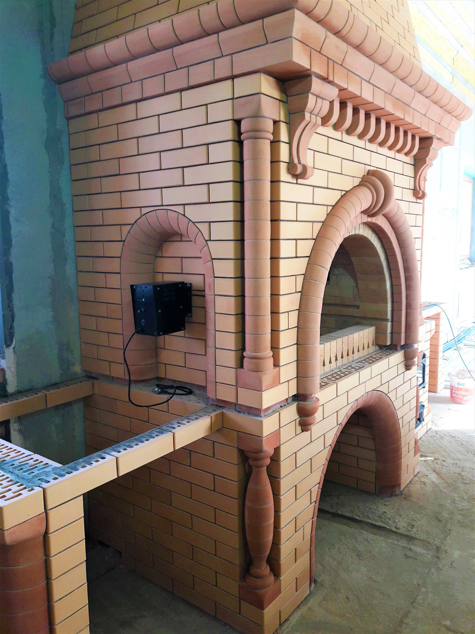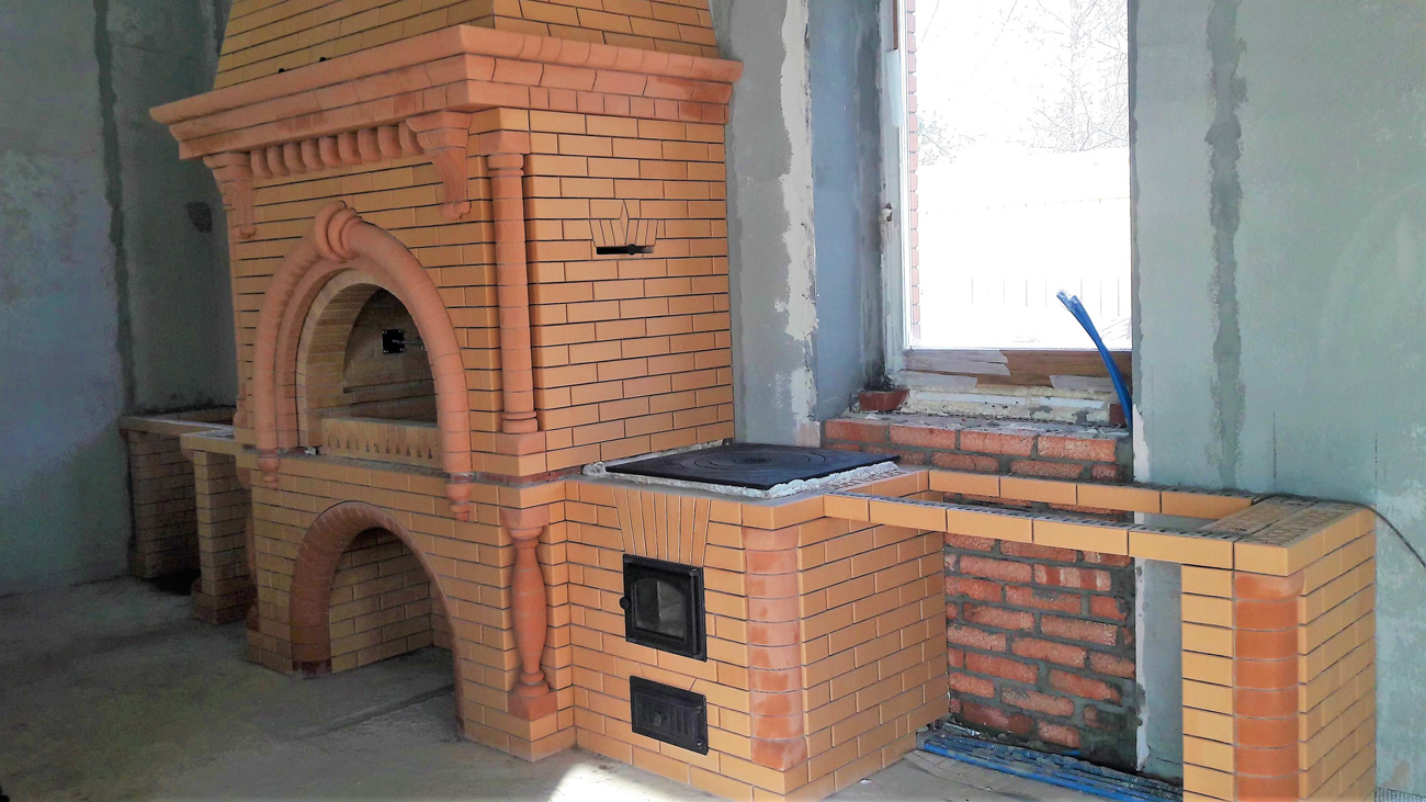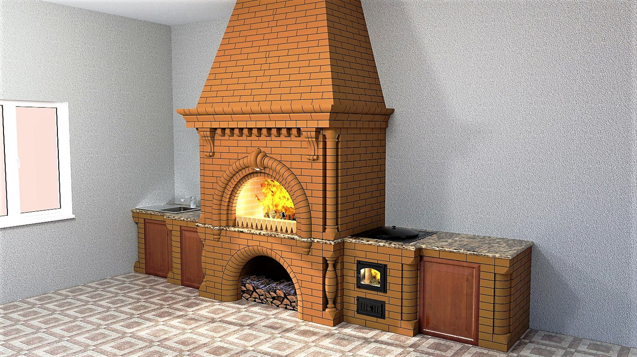 Стильный трехуровневый карниз делит конструкцию, после чего следует наклонный дымосборник, что позволяет этому весьма массивному кирпичному сооружению визуально не давить своими габаритами. Каждый элемент комплекса находится на своем месте и придает ему завершенность и благородство.