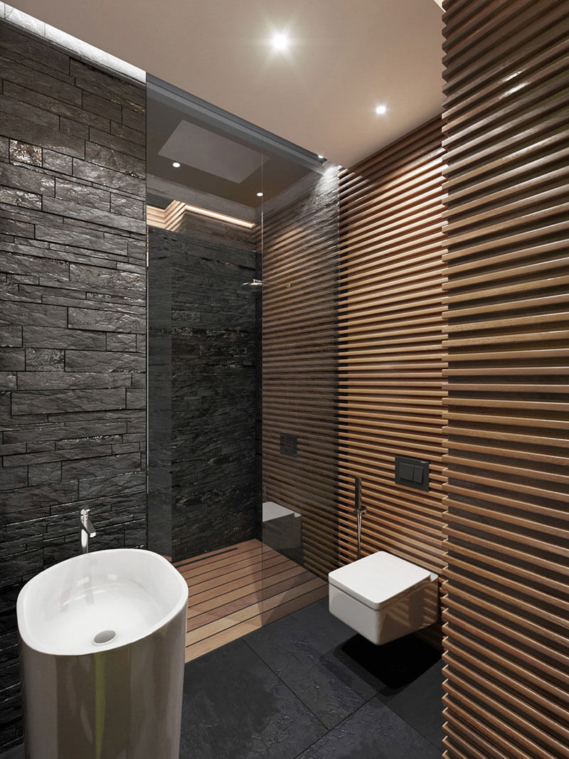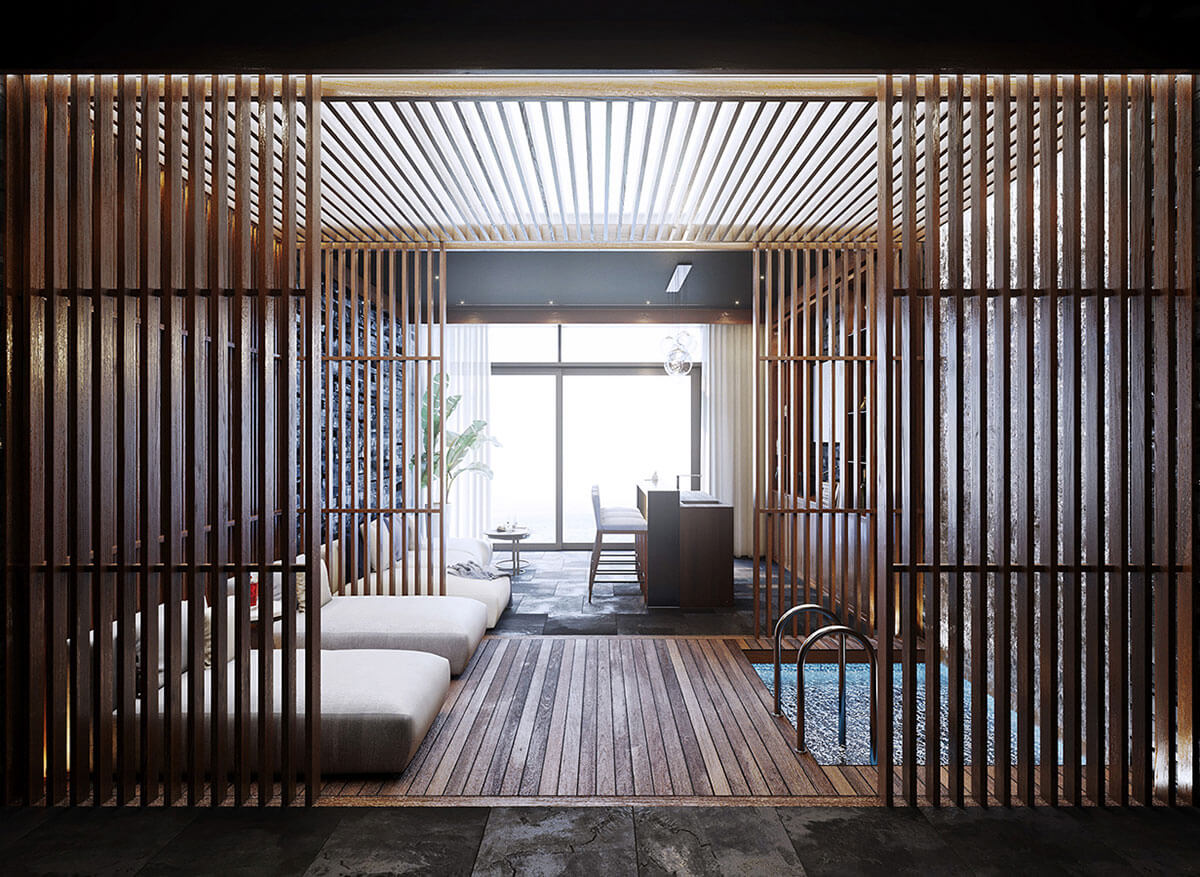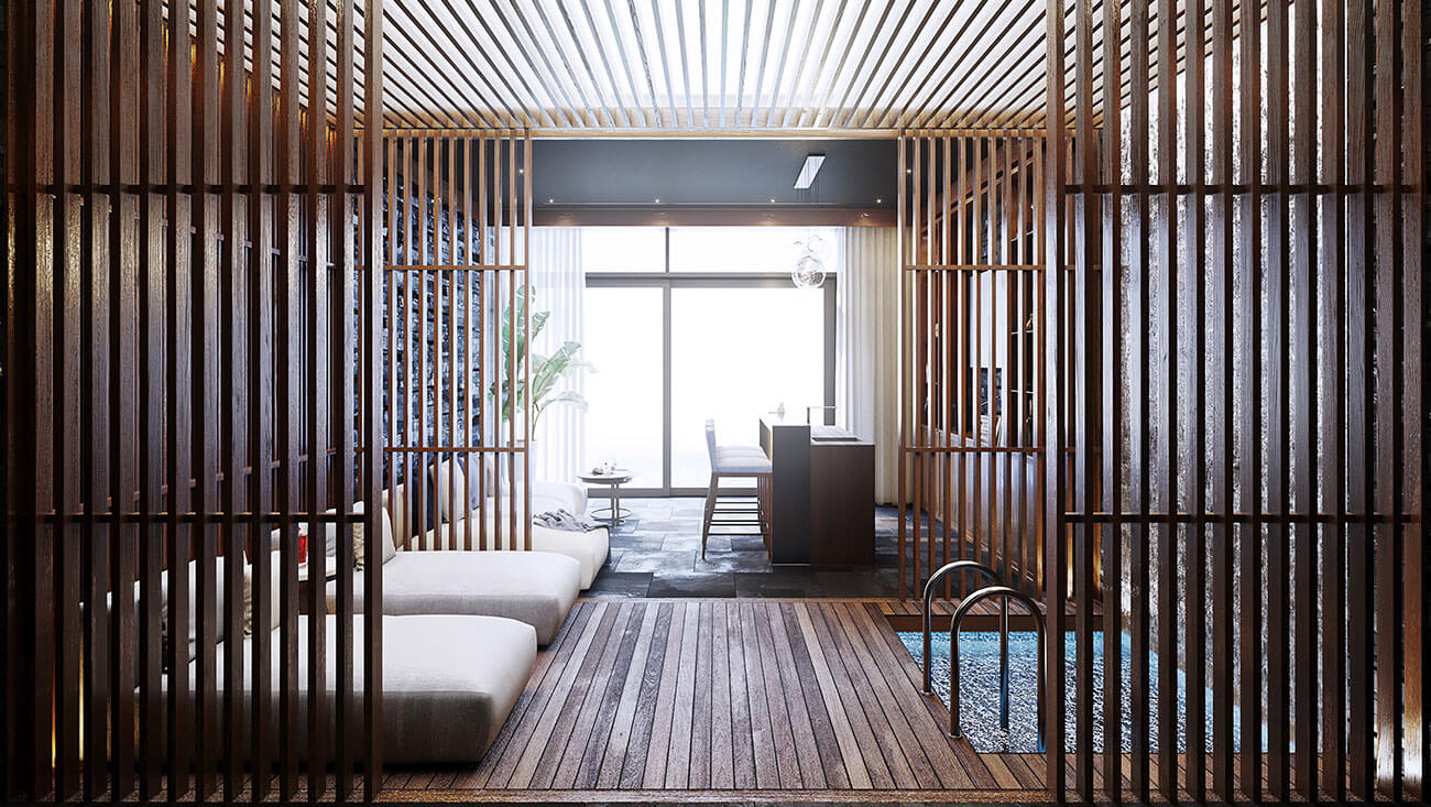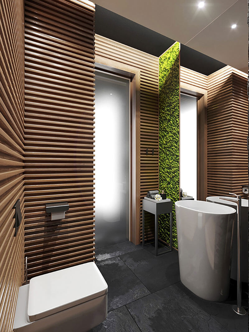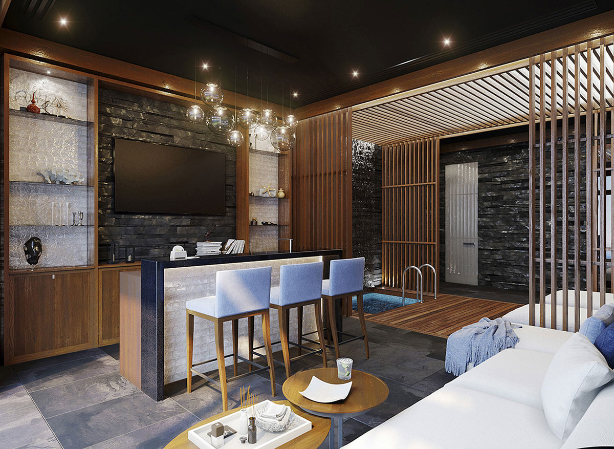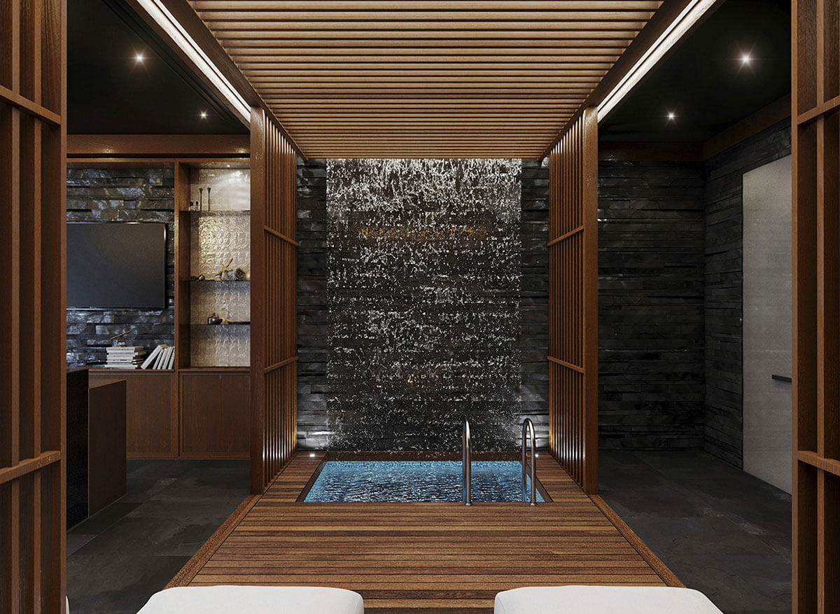 Зона купели отделена от холла и гостиной декоративными ширмами и настилом из влагостойкого тикового дерева, такое зонирование создает дополнительное ощущение приватности. Также в этой зоне предусмотрен водопад, стекающий по одной из стен в купель.