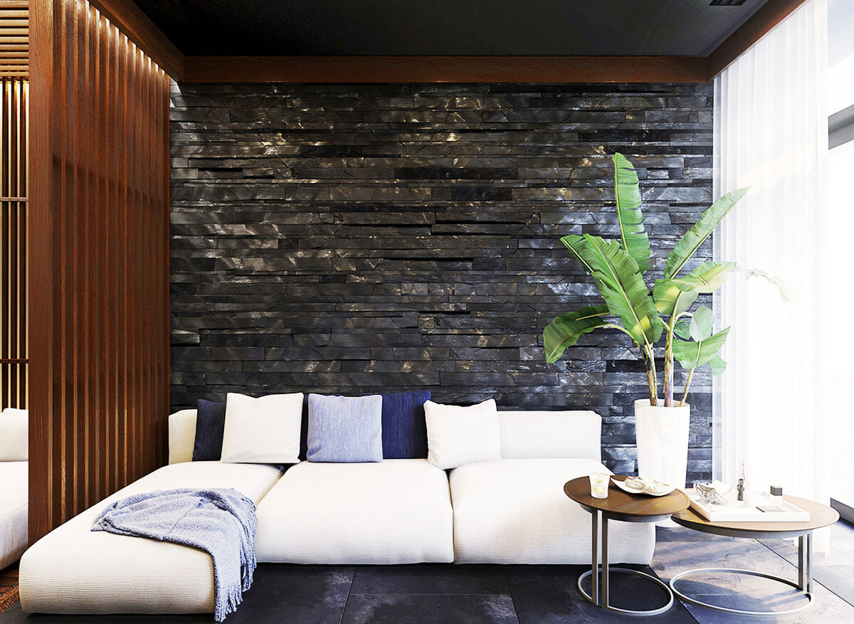 Натуральный темный сланец и тик теплого цвета, использованные в отделке помещений, создают камерную умиротворяющую атмосферу.
