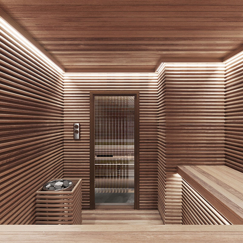 Парная и душевая отделены от холла матовыми стеклянными дверьми, изготовленными компанией Tylo. Отделка стен парной выполнена из канадского кедра, настил и лавки — из африканского дуба абаш. Для проекта выбрана печь Tylo Mega Line.