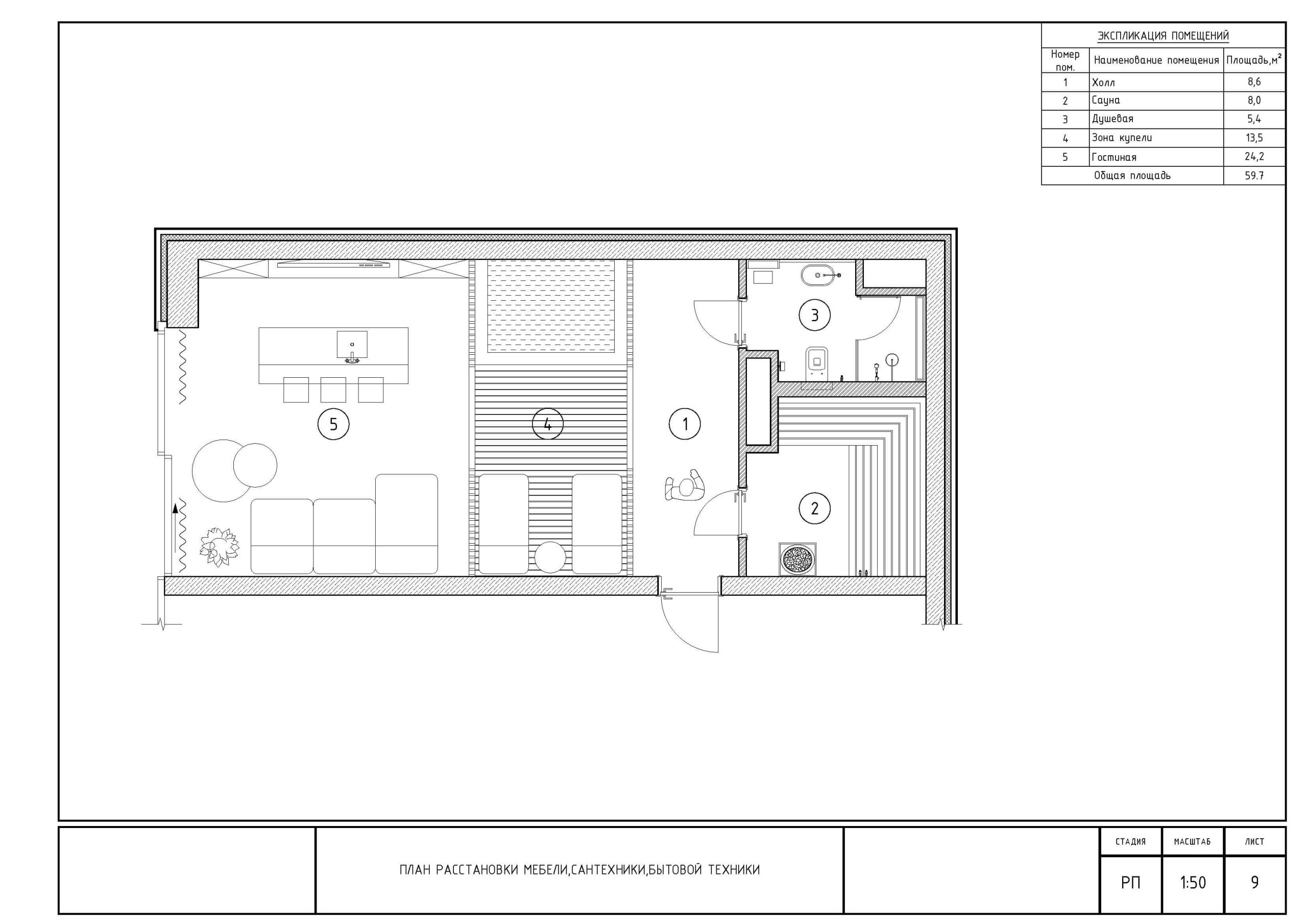 Частная спа-зона занимает помещение площадью 60 кв.м. В плане это вытянутый прямоугольник, который разделен на несколько зон для отдыха: гостиную с небольшой кухней, зону купели, парную и душевую комнату.