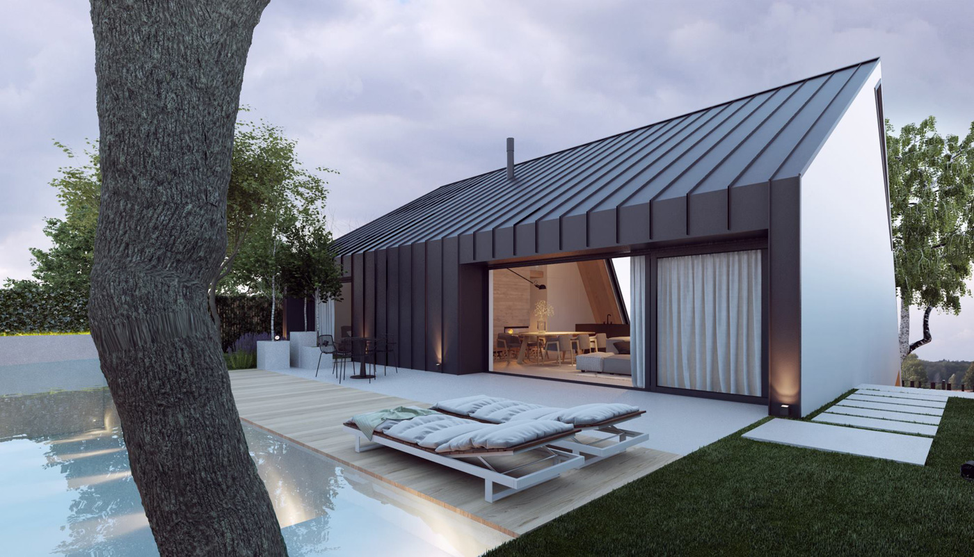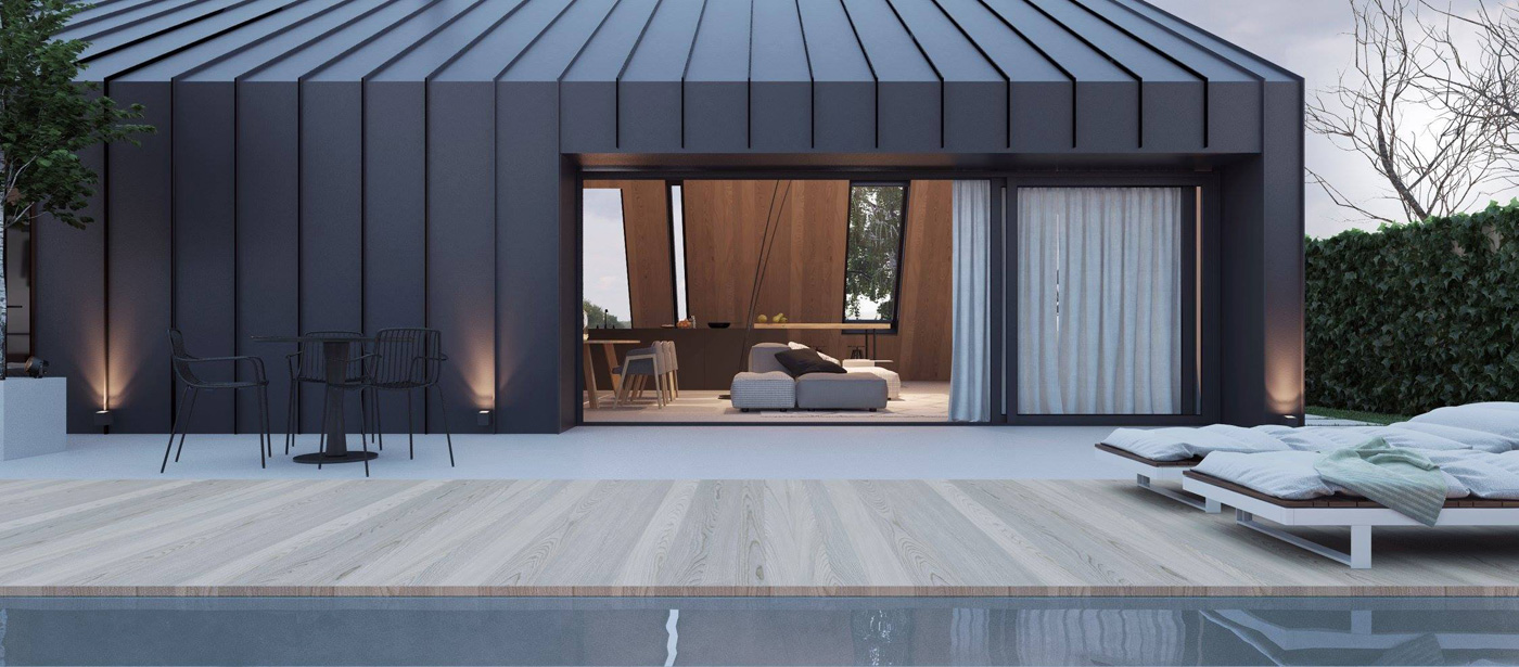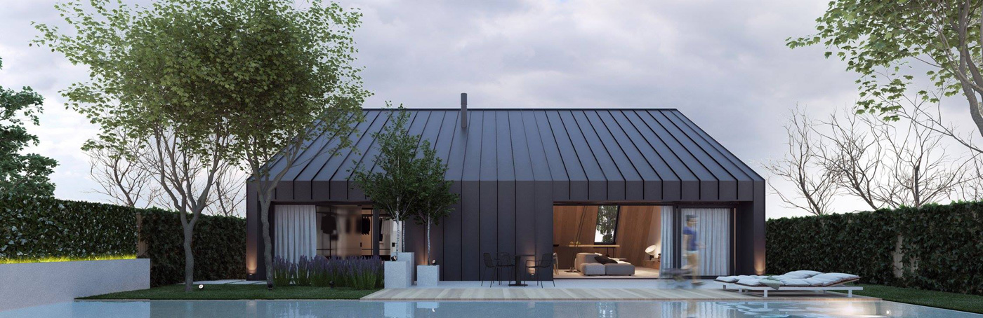 Дом экологичный — он построен из деревянных конструкций, покрыт фальцевой кровлей, подчеркивающей минималистичность и простоту формы дома.
