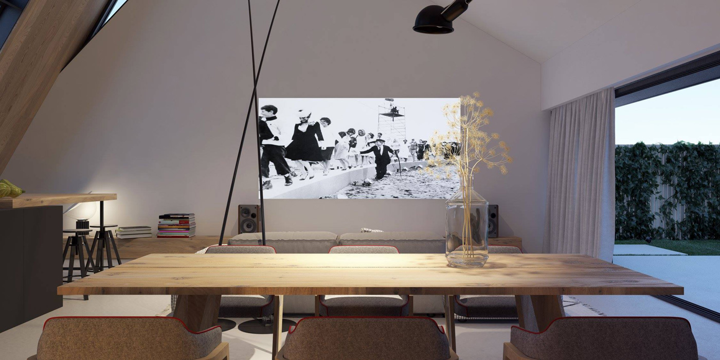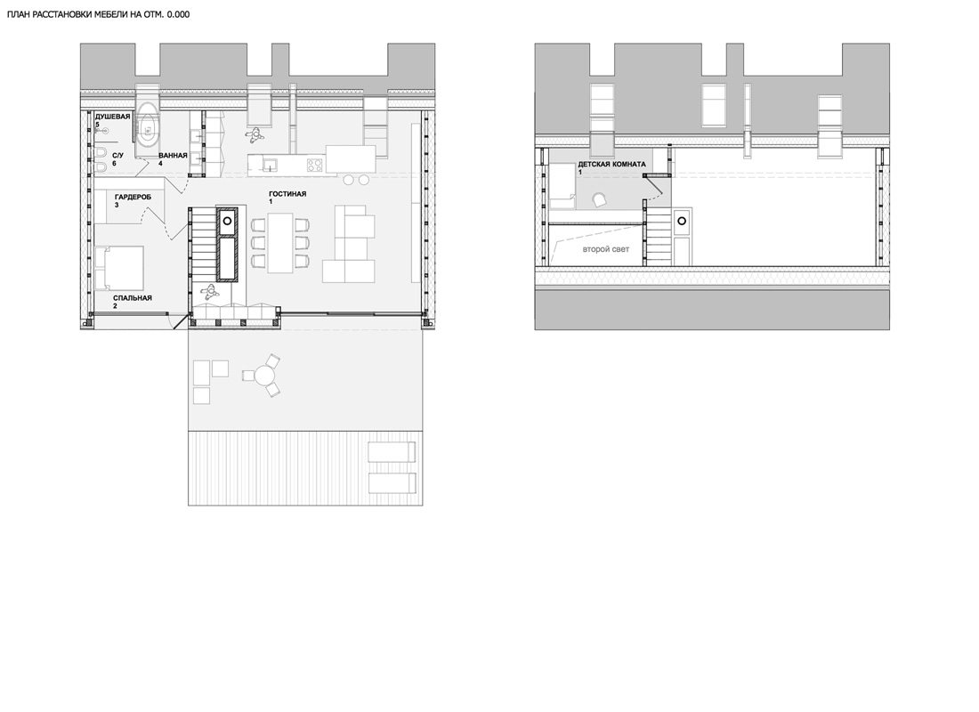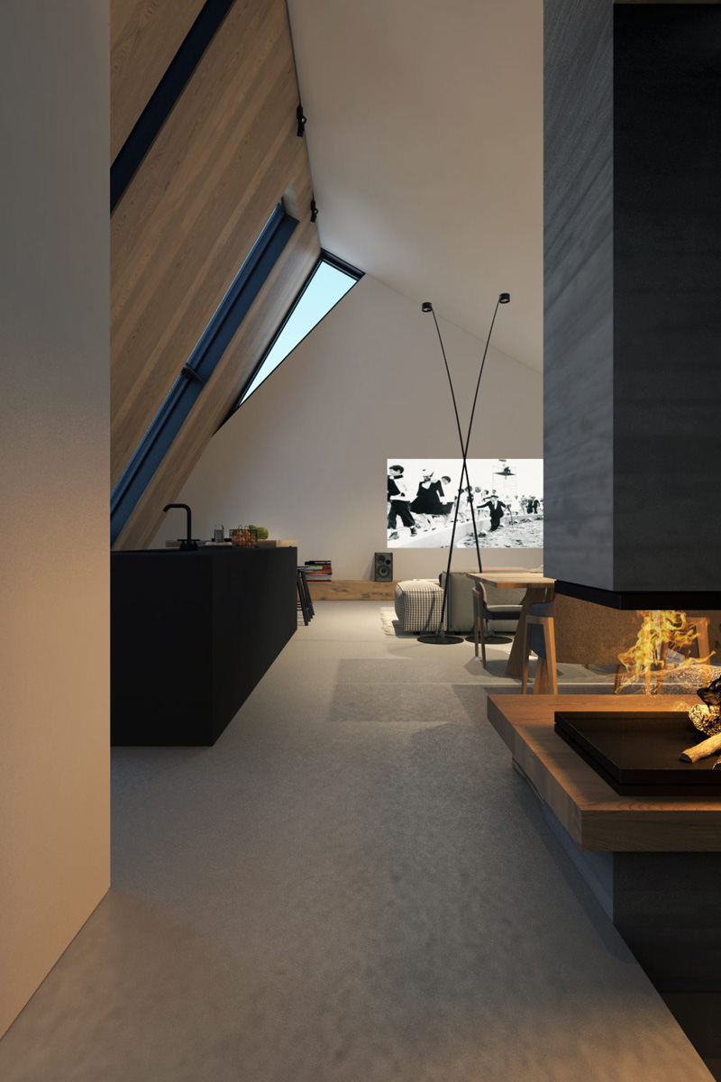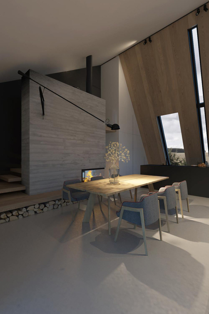 С южной стороны дома небольшой закрытый двор с бассейном и террасой, переходящей в гостиную. Гостиная, объединенная с кухней и столовой, — главное пространство дома, где высота в скате достигает 6 м.