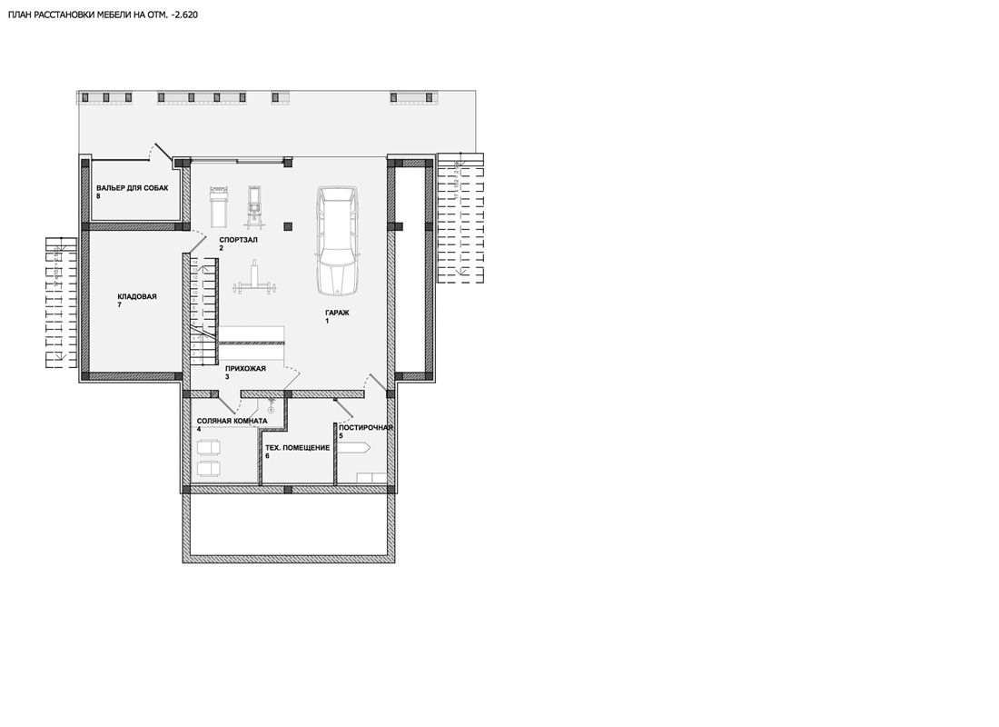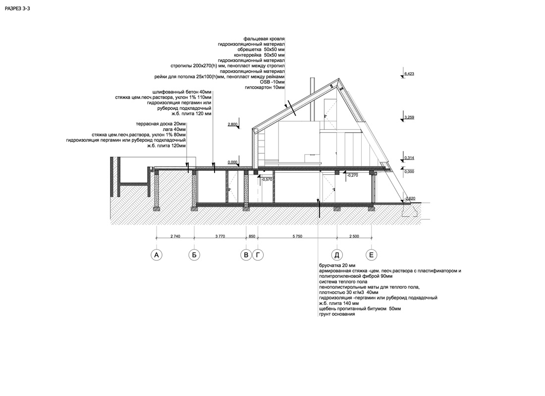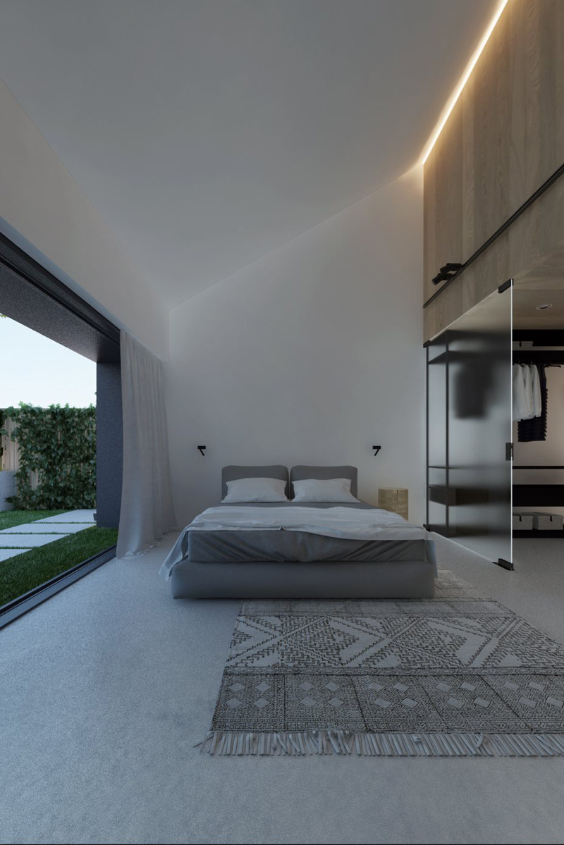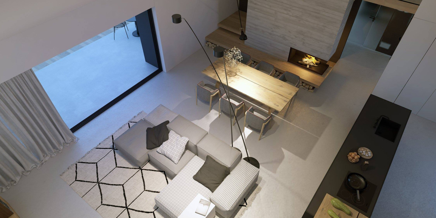 С южной стороны дома небольшой закрытый двор с бассейном и террасой, переходящей в гостиную. Гостиная, объединенная с кухней и столовой, — главное пространство дома, где высота в скате достигает 6 м.