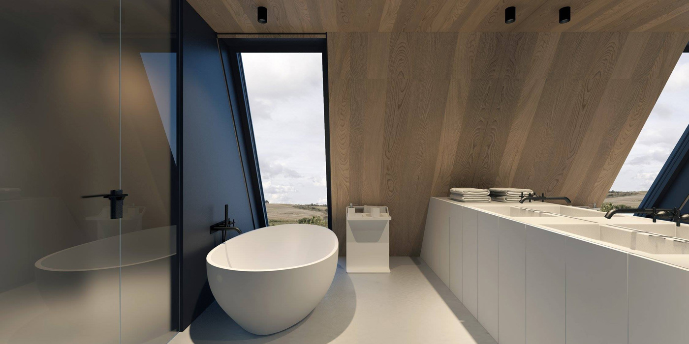Северный фасад — это крутой скат кровли, изрезанный длинными окнами, откуда открывается вид на зеленые холмы молдавских полей.
