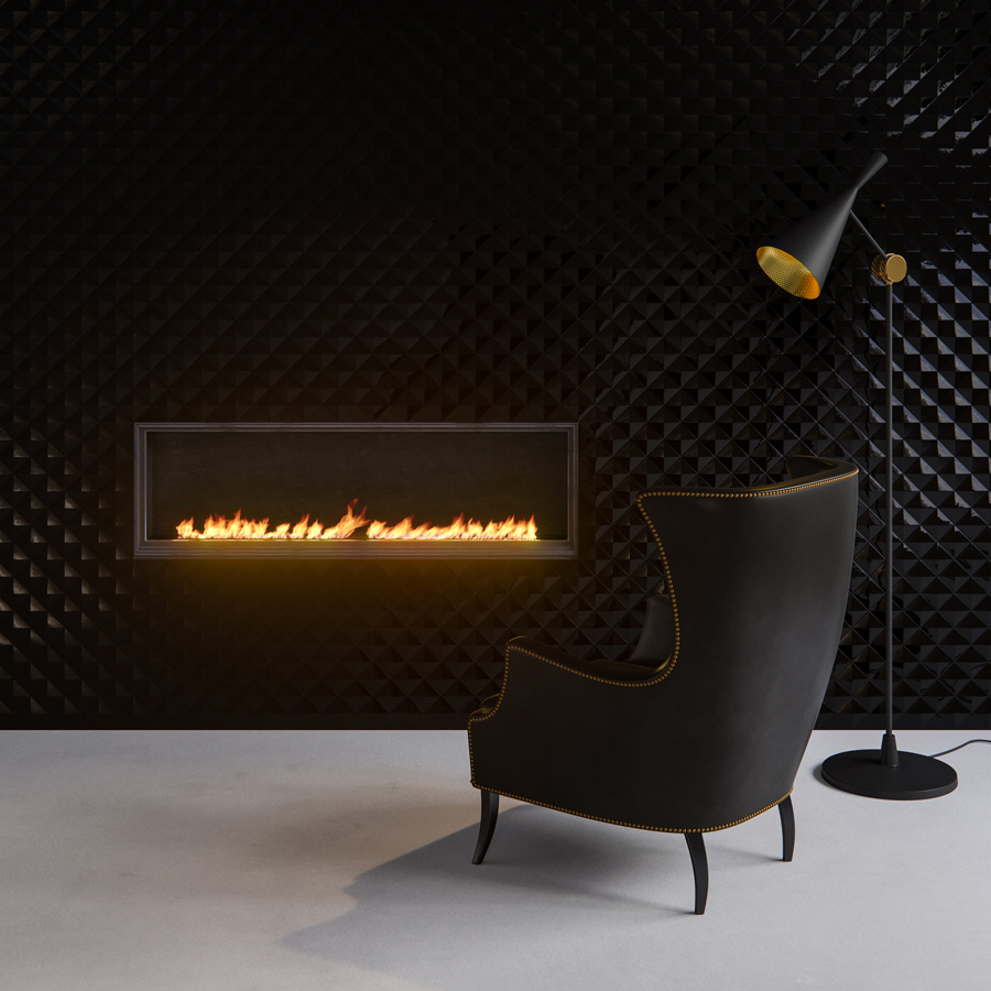 Электрокамин создан в двух цветовых вариациях: Aurum (золото), Black Jack (черный) и облицован уникальной, разработанной специально для этого проекта плиткой ручной работы.