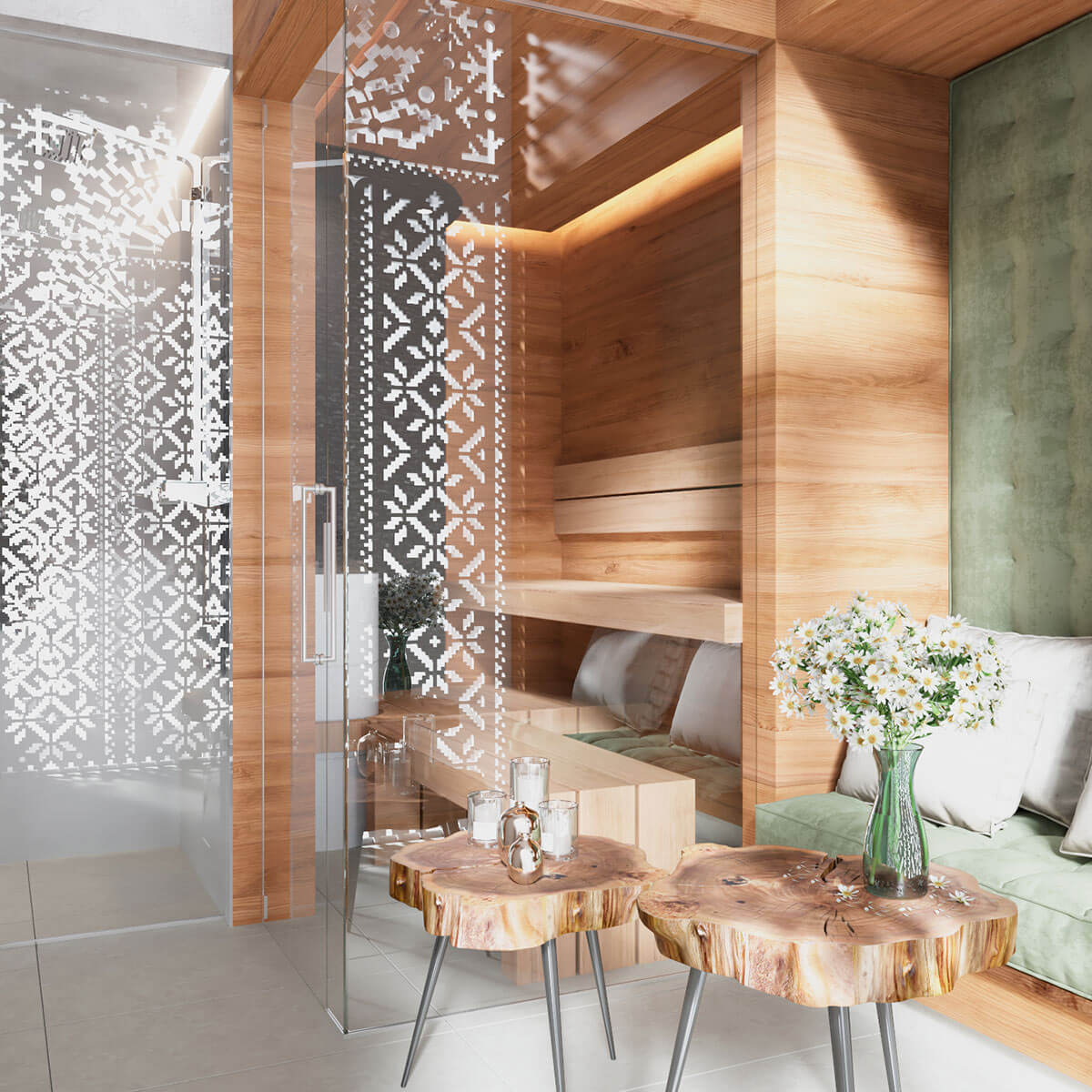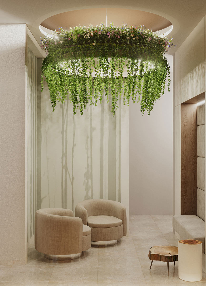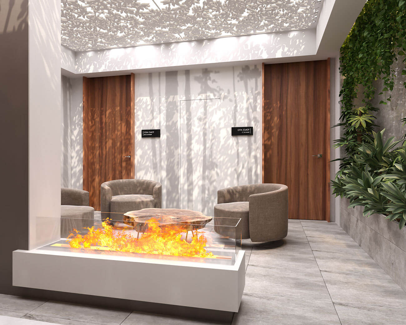 Таинственный остров в интерьере своими элементами пытается сделать так, чтоб его нашли. Три уникальных спа-сьюта ведут в расслабляющую атмосферу холла с ажурной тенью деревьев, где есть и огонь, и вода, и камень. Стены отделаны широкоформатным керамогранитов с тенью деревьев Fondovalle.