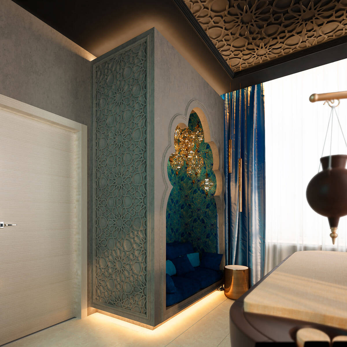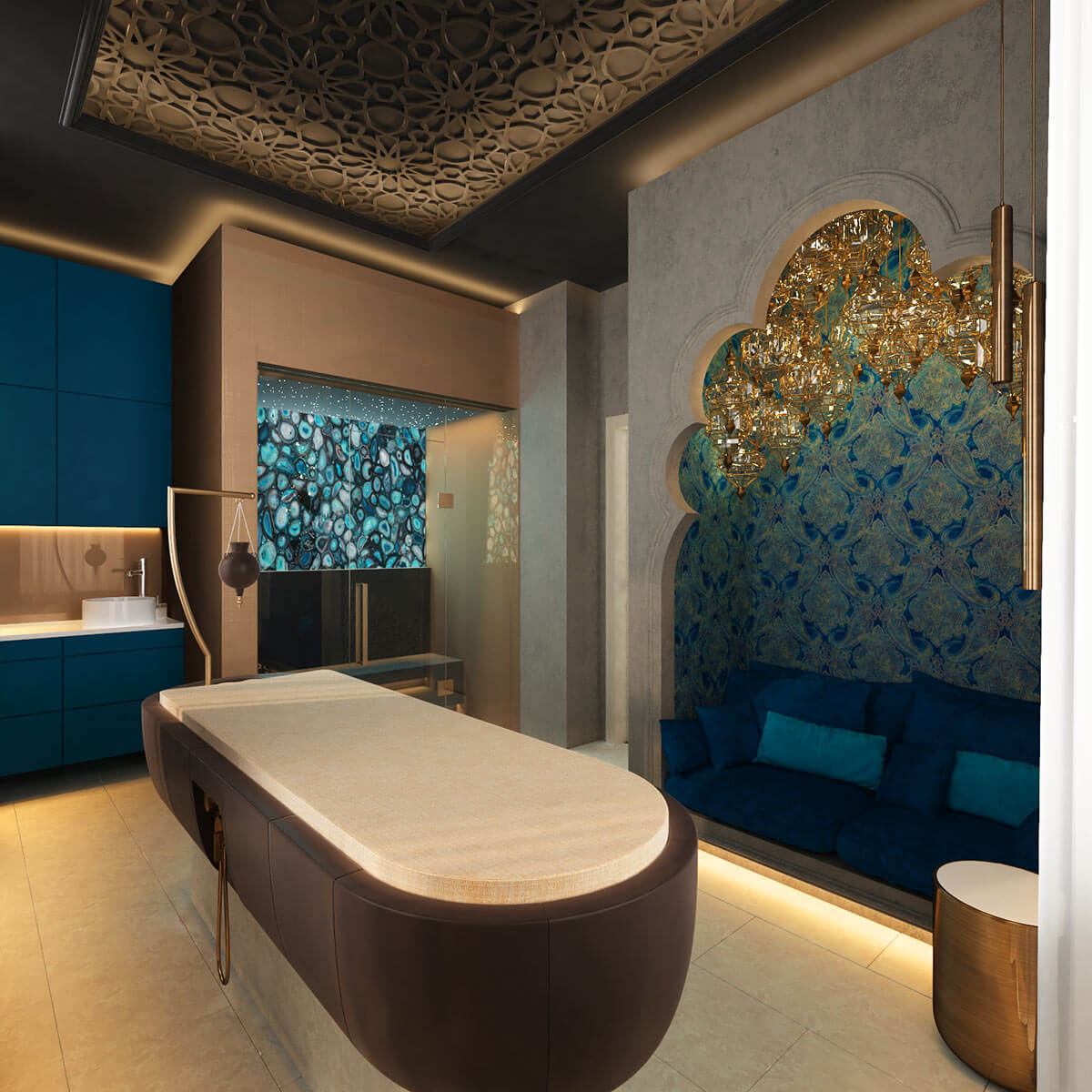 Восточный спа-сьют — для турецких, марокканских и индийских парений и ритуалов красоты. Сьют оснащен паровой кабиной с полудрагоценным слэбом агата с подсветкой, уникальным массажным столом Lithos Hilpert для проведения влажных и сухих спа-программ, а также аюрведических программ. Также в сьюте выстроен альков для отдыха, расслабления и чаепития.