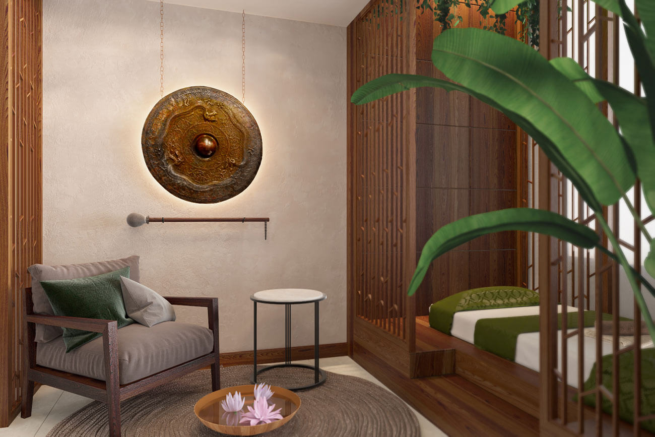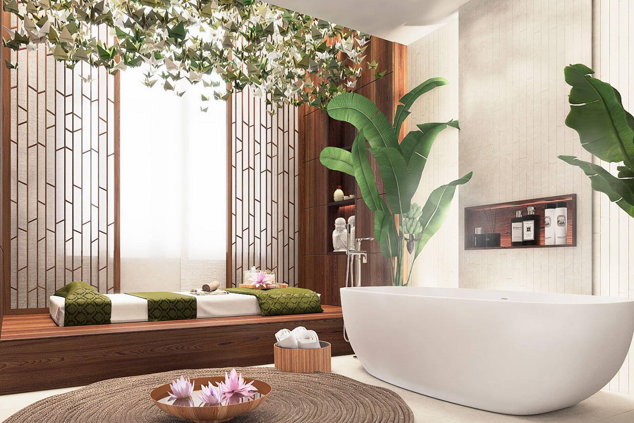 Азиатский спа-сьют оснащен татами, ванной и душевой. В отделке душевой присутствуют азиатские мотивы керамической плитки Zero0. Отдельно стоящая дизайнерская ванна позволит проводить разнообразные оздоровительные ванны, на татами можно проводить разнообразные массажи с использованием тайских методик поз звуки гонга. Декорацией и зоной созерцания представлен авторский светильник из оптоволокна с птичками.