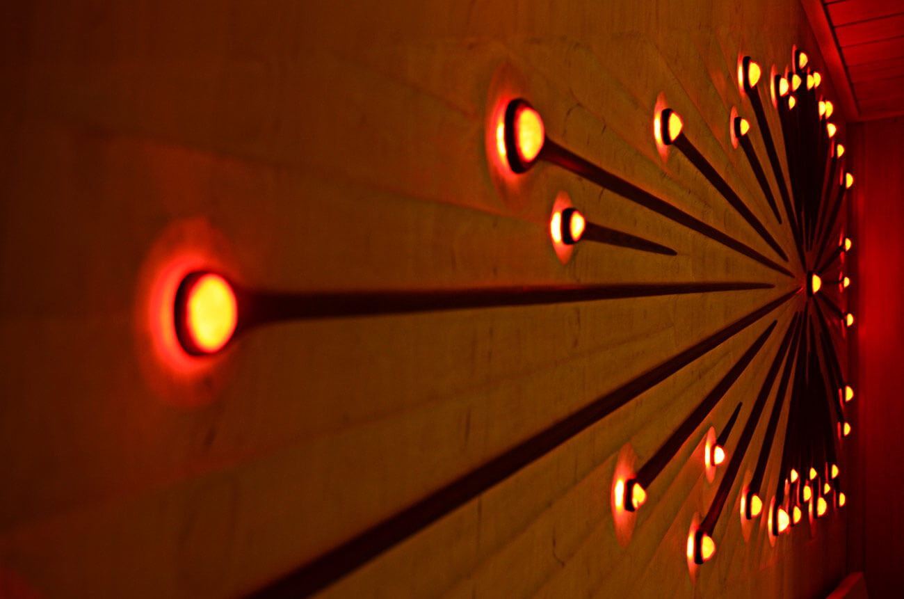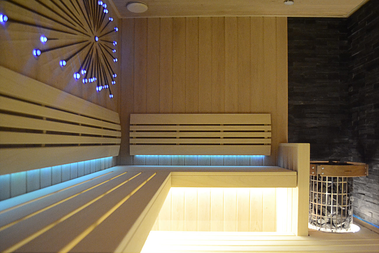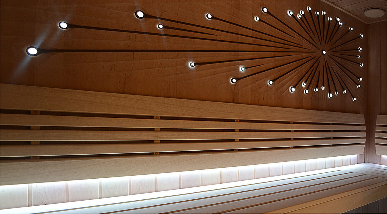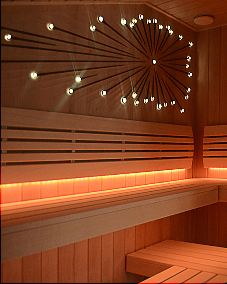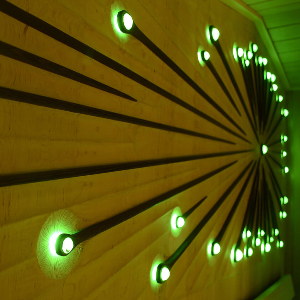 Стены и потолок сауны выполнены из ольхи, полки из абаши. Иголки сделаны из термоясеня, а кристаллы с подсветкой из гималайской соли. Сауна, по нашей традиции, оборудована цветным освещением — хромотерапией и акустической системой — аудиотерапией. Управление реализовано при помощи нашего программиста на базе микрокомпьютера Raspberry PI 4 Model B.