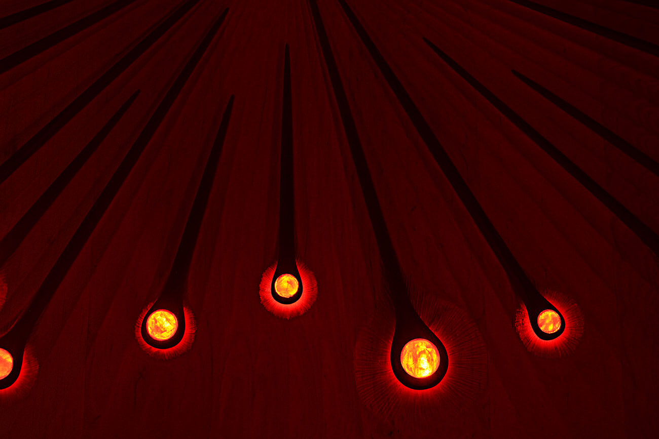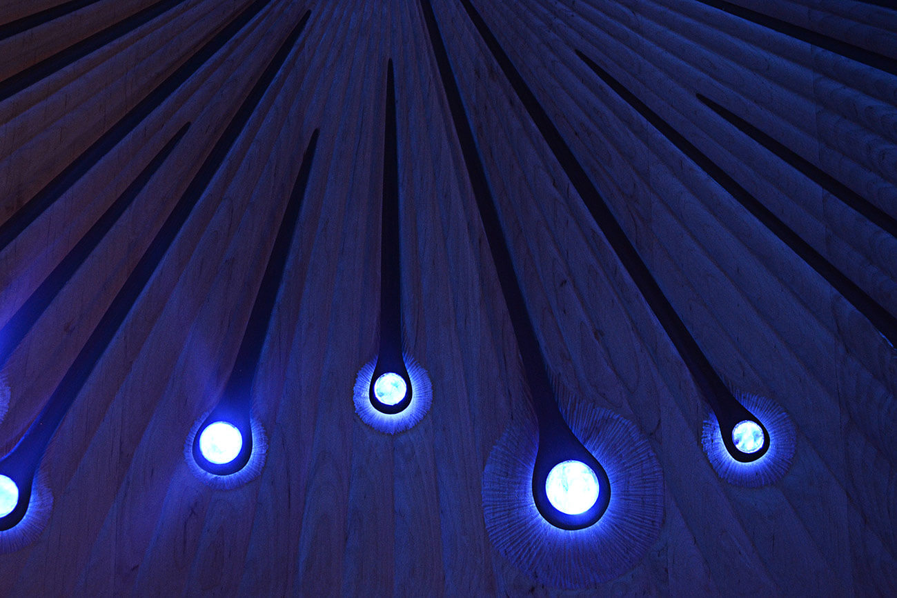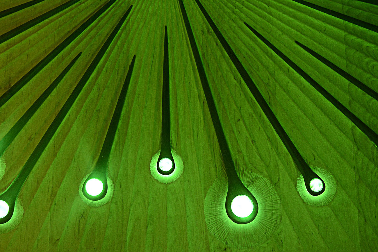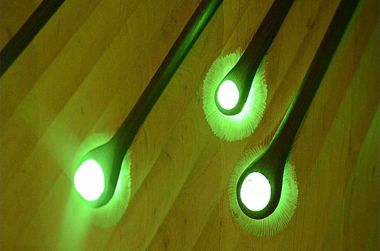 Стены и потолок сауны выполнены из ольхи, полки из абаши. Иголки сделаны из термоясеня, а кристаллы с подсветкой из гималайской соли. Сауна, по нашей традиции, оборудована цветным освещением — хромотерапией и акустической системой — аудиотерапией. Управление реализовано при помощи нашего программиста на базе микрокомпьютера Raspberry PI 4 Model B.