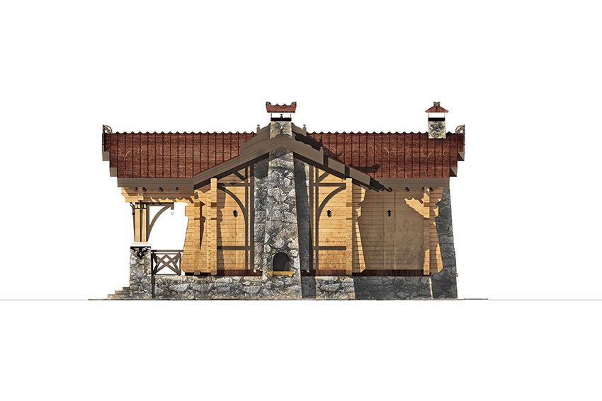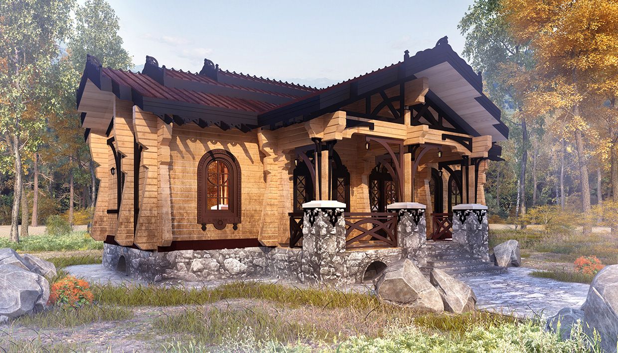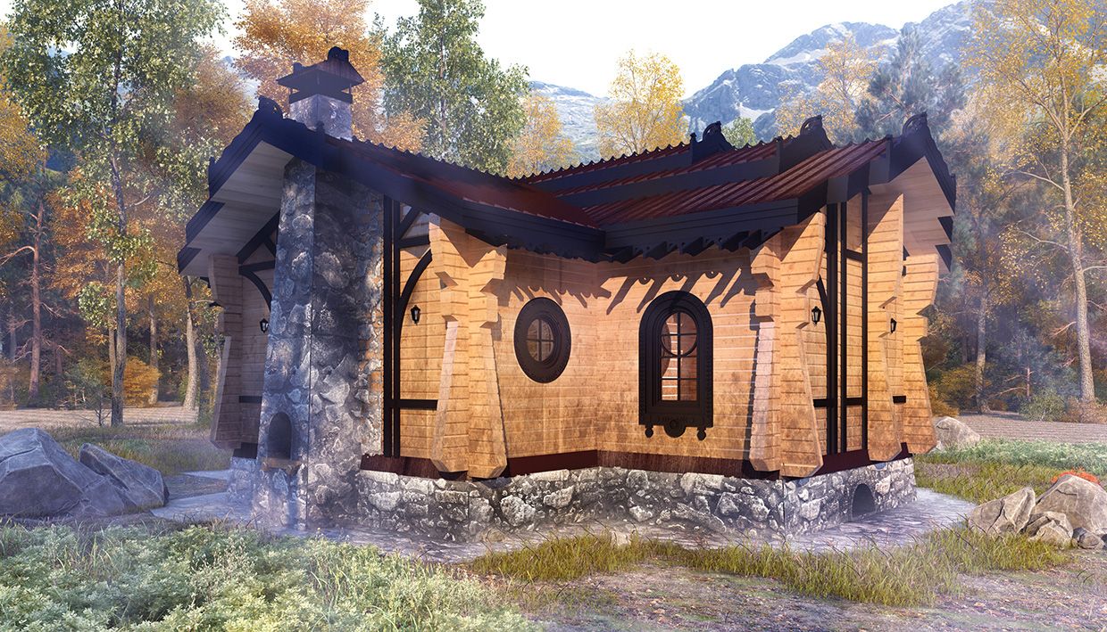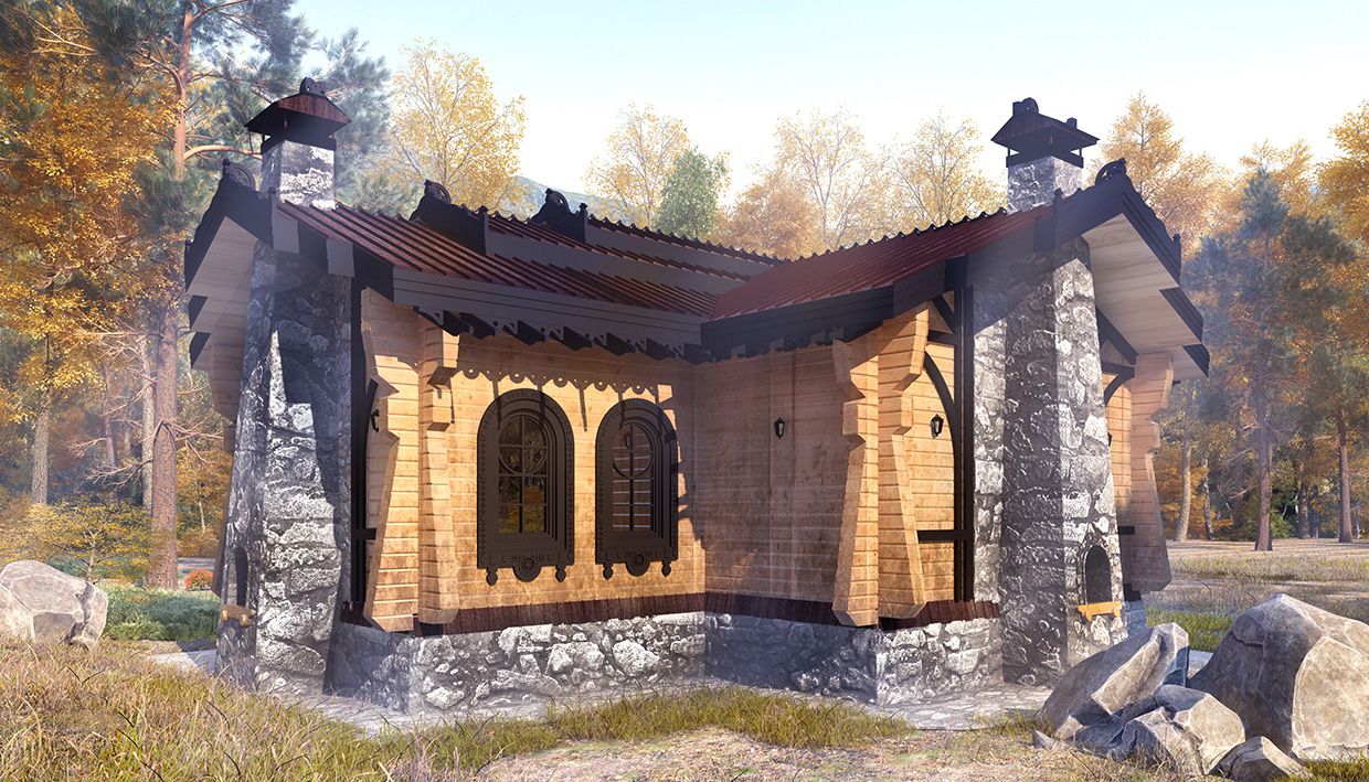 При создании образа бани прослеживаются мотивы архитектуры Страны восходящего солнца. Японские колористические тона органично интерпретированы в русских орнаментах за счет эклектических приемов.