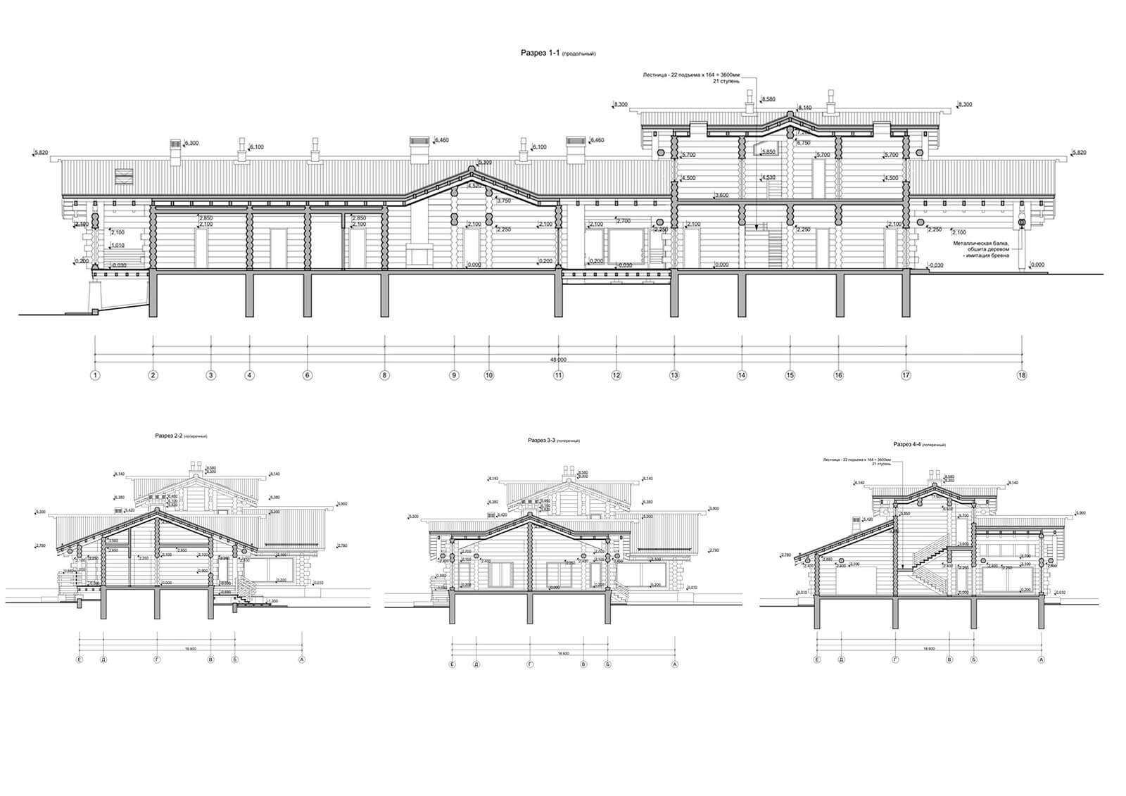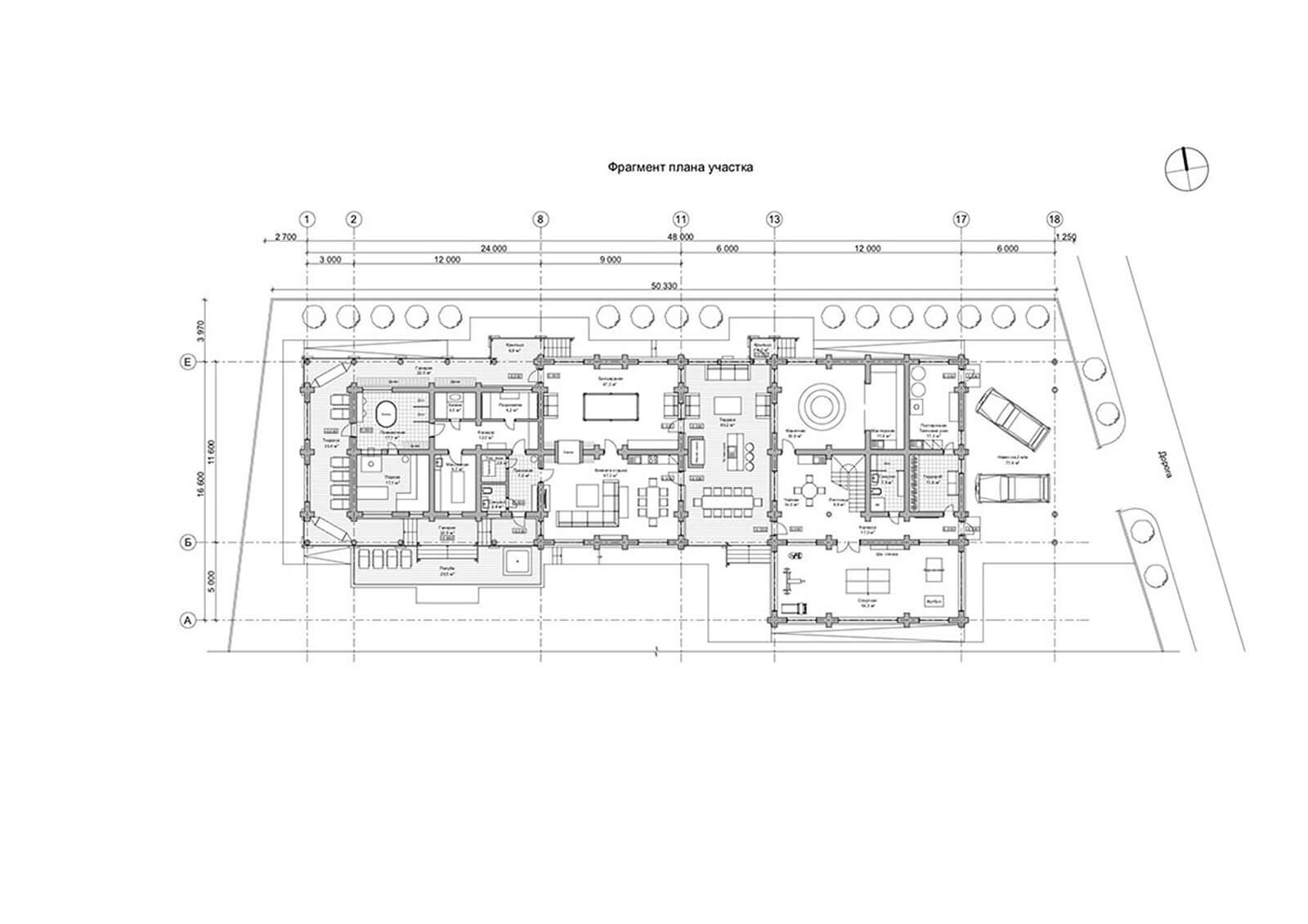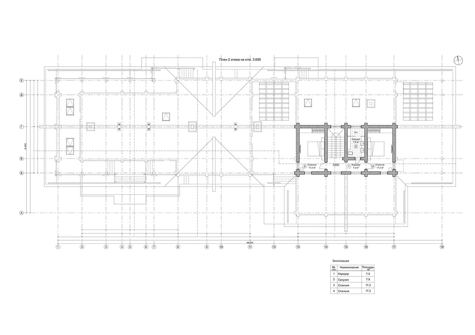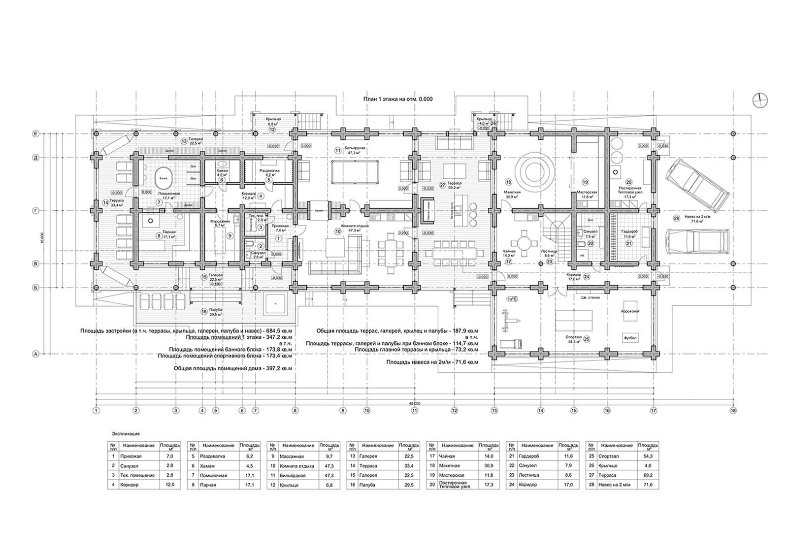 Спортивный блок. На 1-м этаже — тренажерный зал; прихожая (коридор) с вешалкой; гардеробная (с местом хранения уборочного инвентаря); тепловой узел с постирочной; санузел с душем и инфракрасной кабиной; макетная с мастерской и помещение для отдыха (чайную); на 2-м этаже — две спальни и санузел с душем. Из спортивного блока предусмотрен выход на главную крытую террасу, единую для банного и спортивного блоков. Кроме того, при банно-спортивном комплексе запроектирован навес на два машино-места.