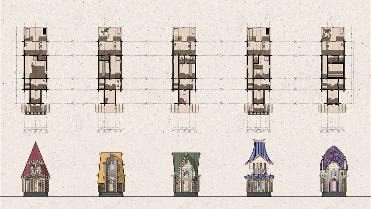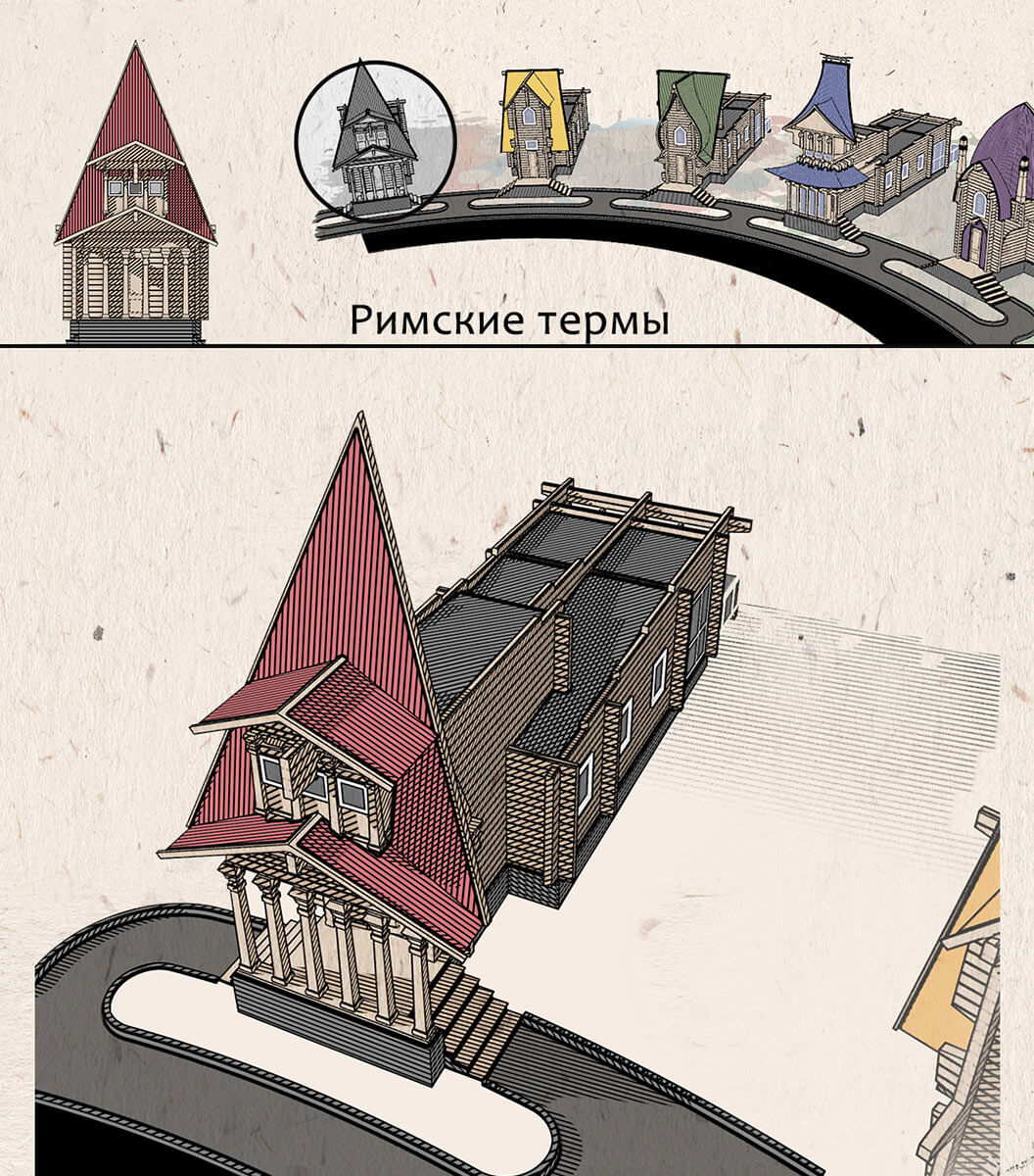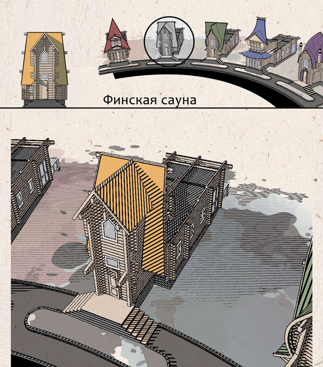 Я решил вывести на главный фасад каждой из них характерные особенности той страны, к которой эта баня относится. То есть внешний вид отличается главным образом лишь стилизованными брандмауэрами-фасадами, которые выстраиваются в ряд, словно геральдические щиты с гербами. При этом сами объемы довольно просты и лаконичны.