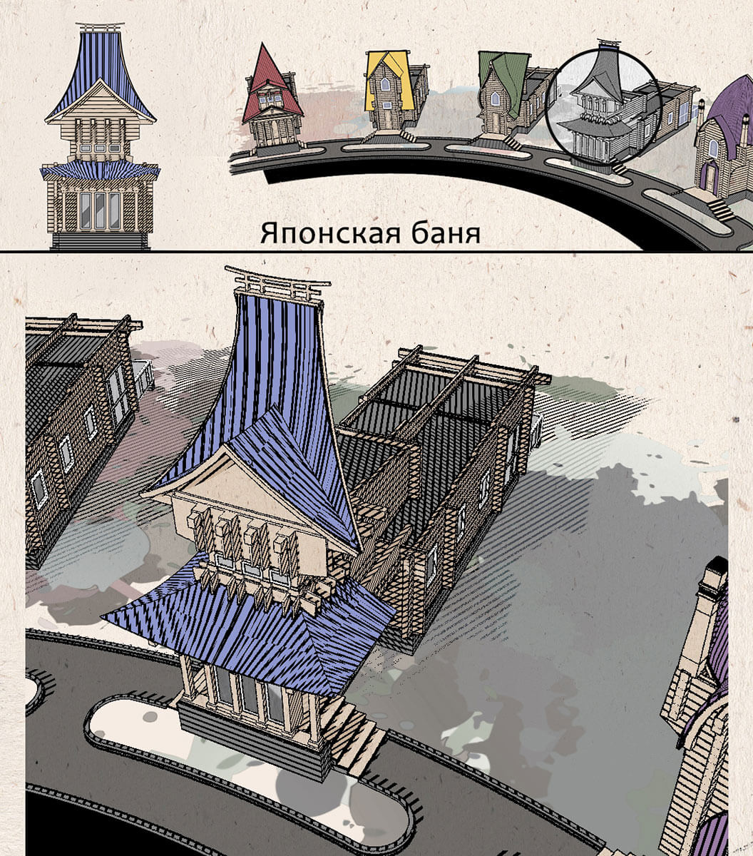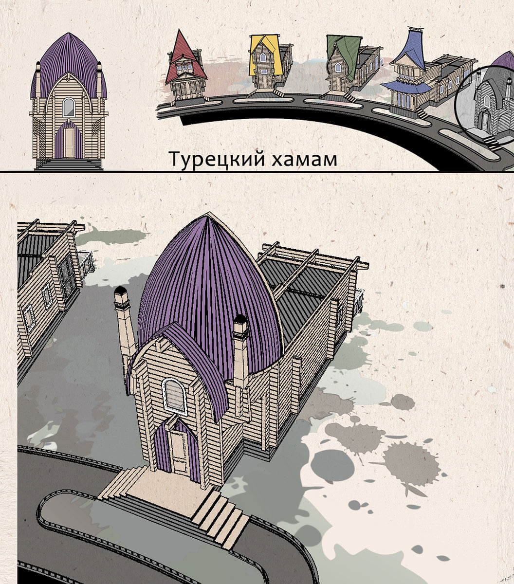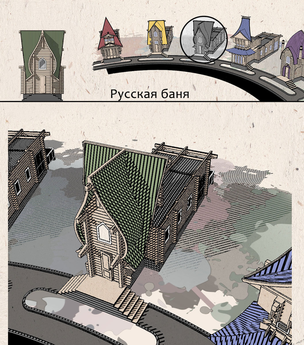 • В центре — русская баня с характерным стилизованным кокошником.