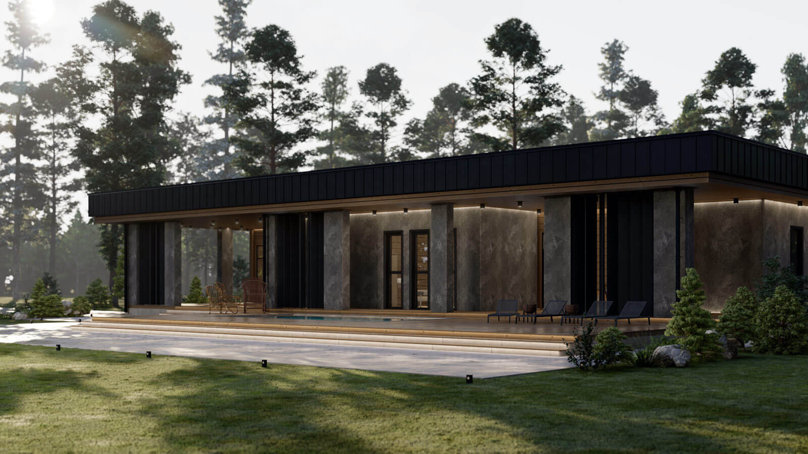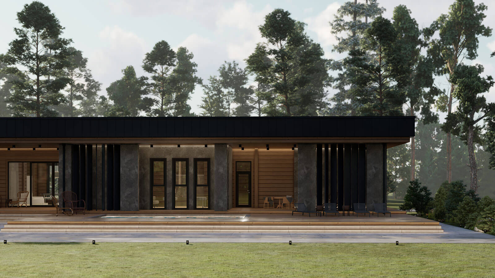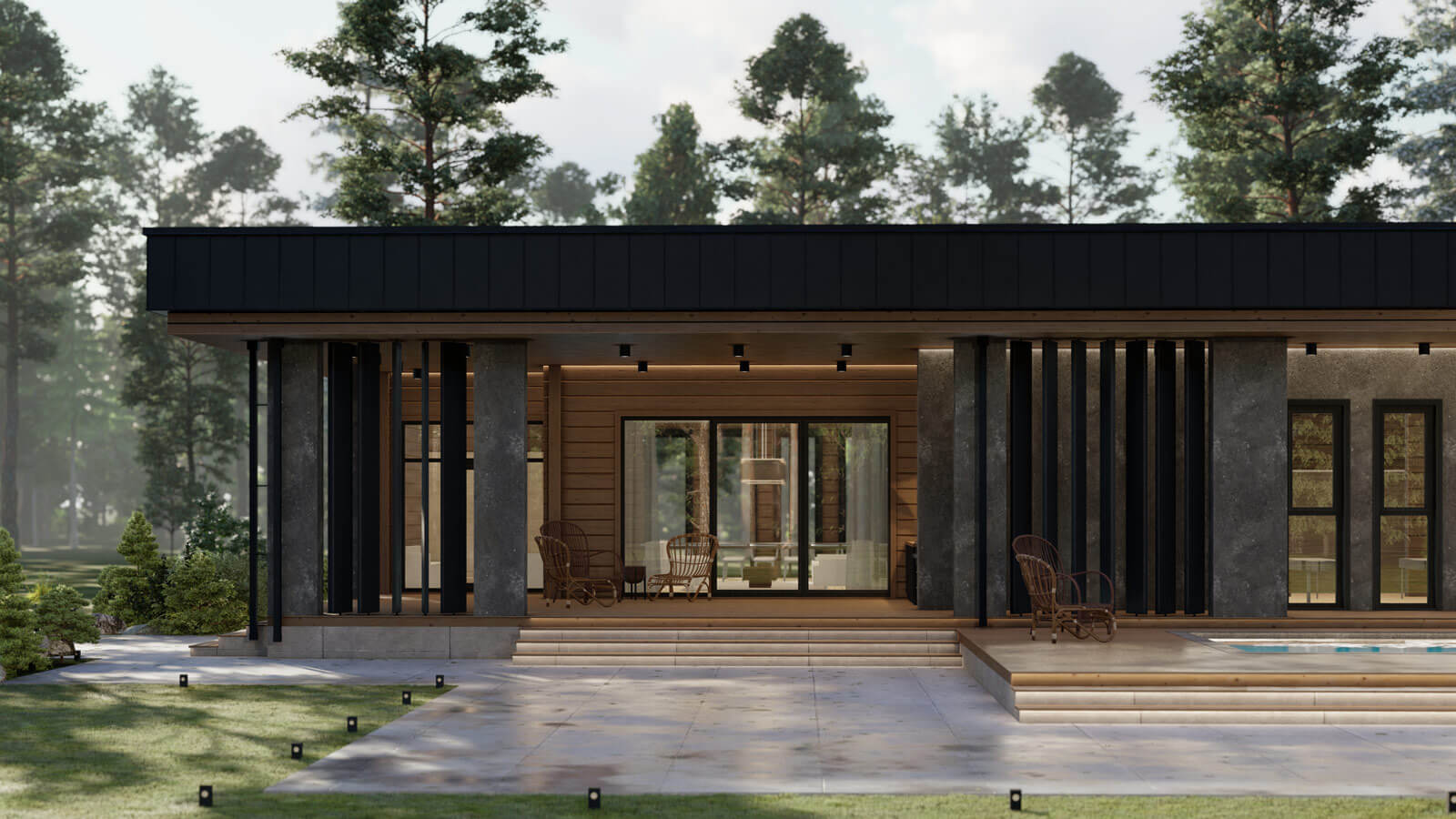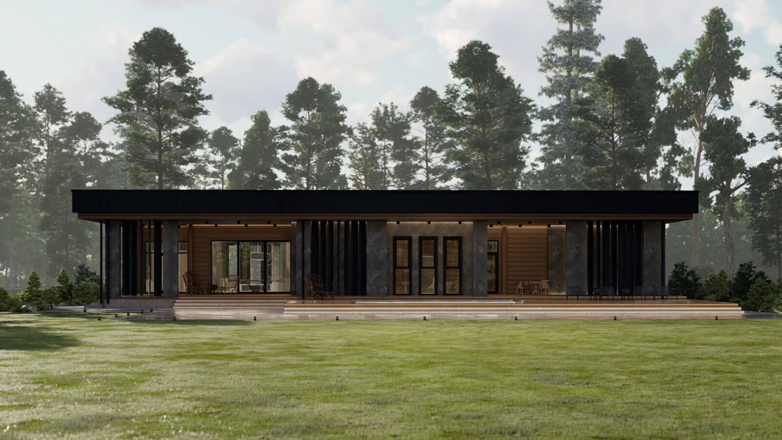 Стиль комплекса поддерживается осознанным использованием крупных массивных форм в сочетании с природными текстурами дерева и камня. Особенность композиции добавляют воздушные поворотные ламели в сочетании с мощными столбами-опорами террасы.